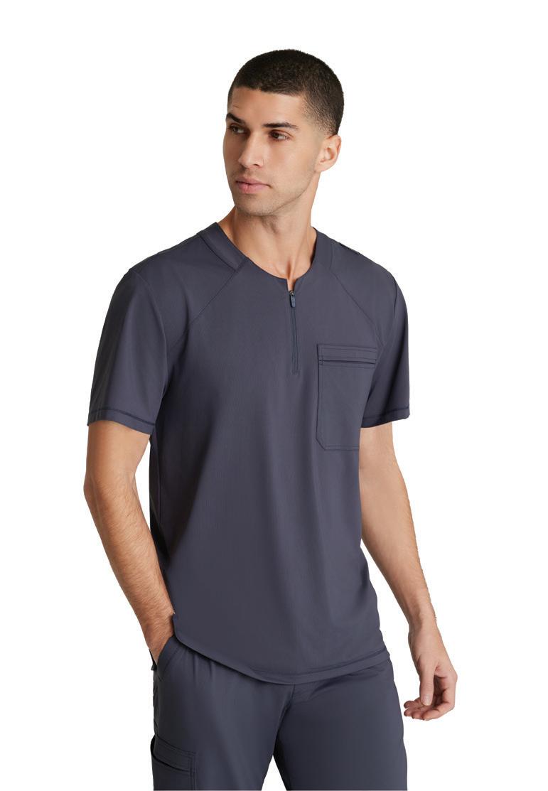 1-pocket curved banded neck with front zipper, chest patch pocket, shoulder badge loop, straight highlow hem top