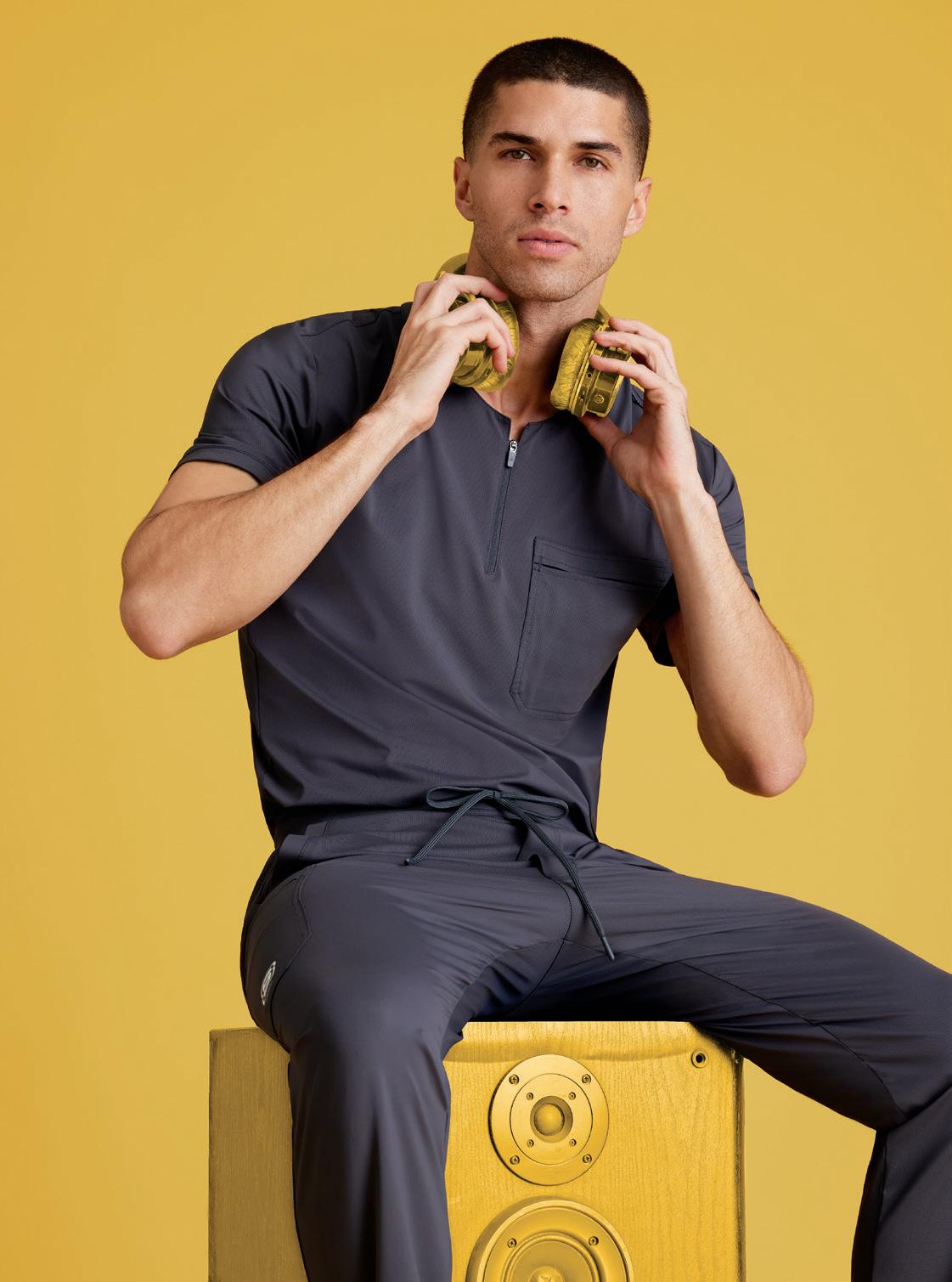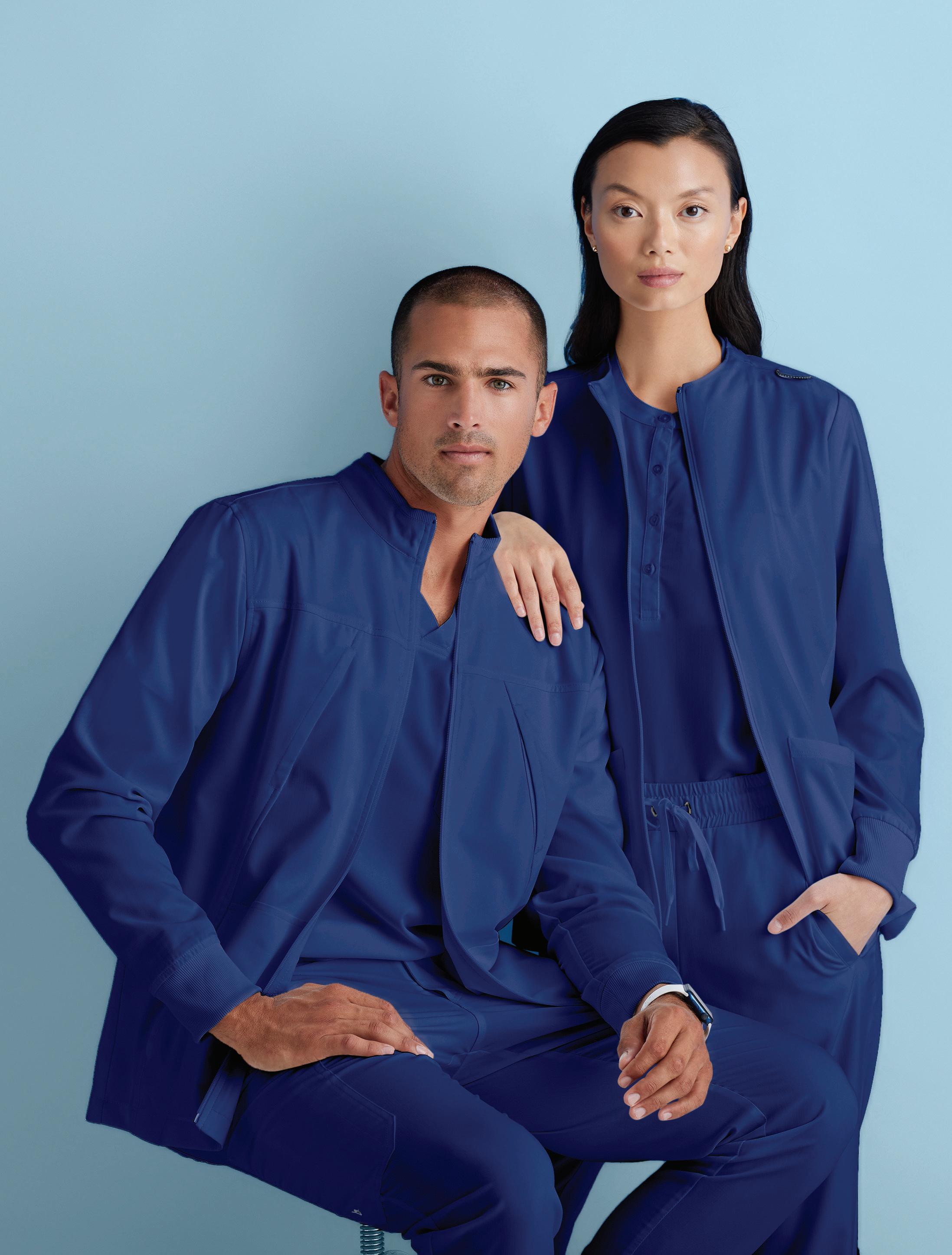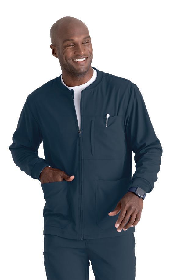 4-pocket, V-neckline, shoulder contrast badge loop, zip pocket