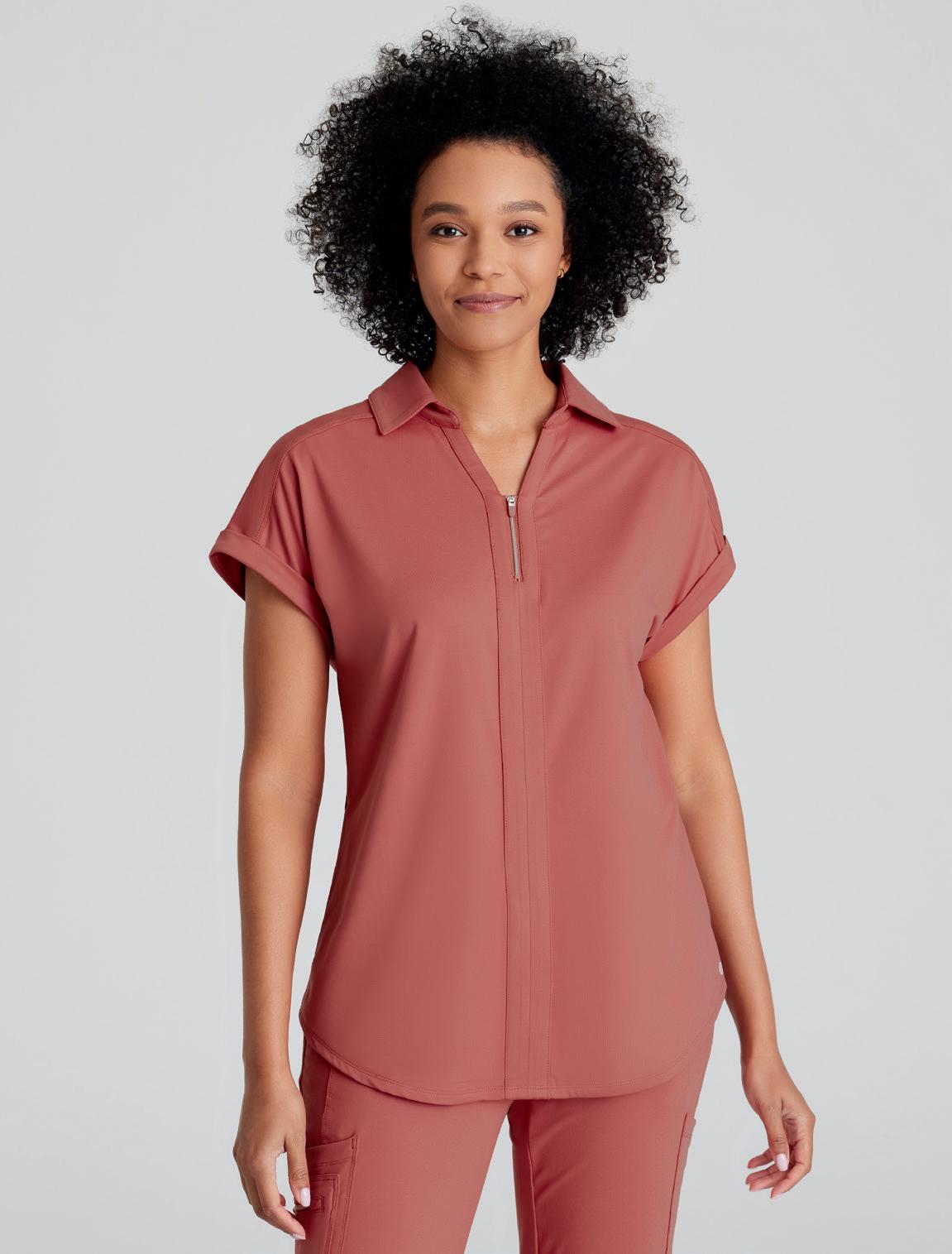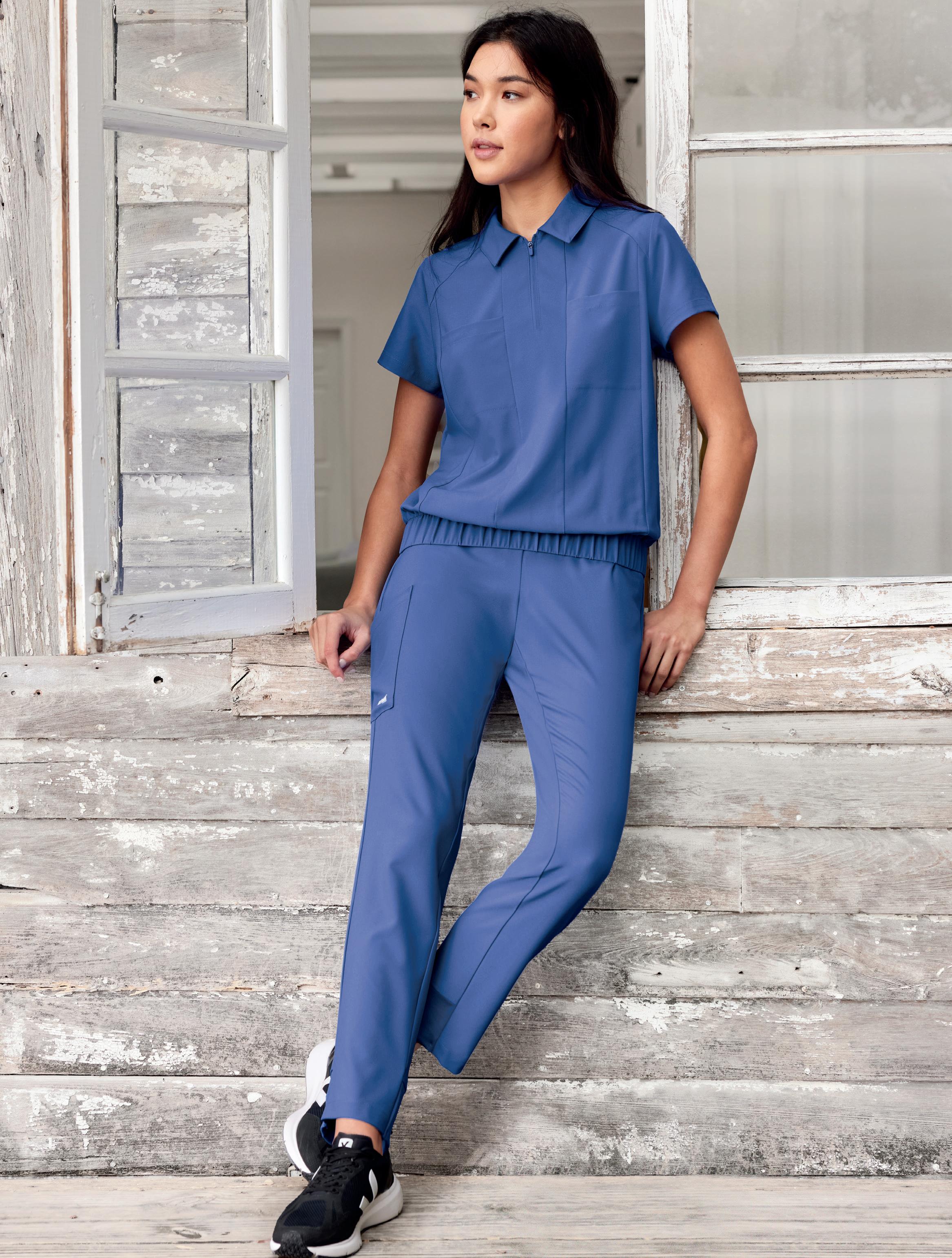 3-pocket gusset v-neck, front princess seams with on-seam zipper pocket, angled topentry patch waist pockets, shoulder Steel badge loop, shirt tail hem top