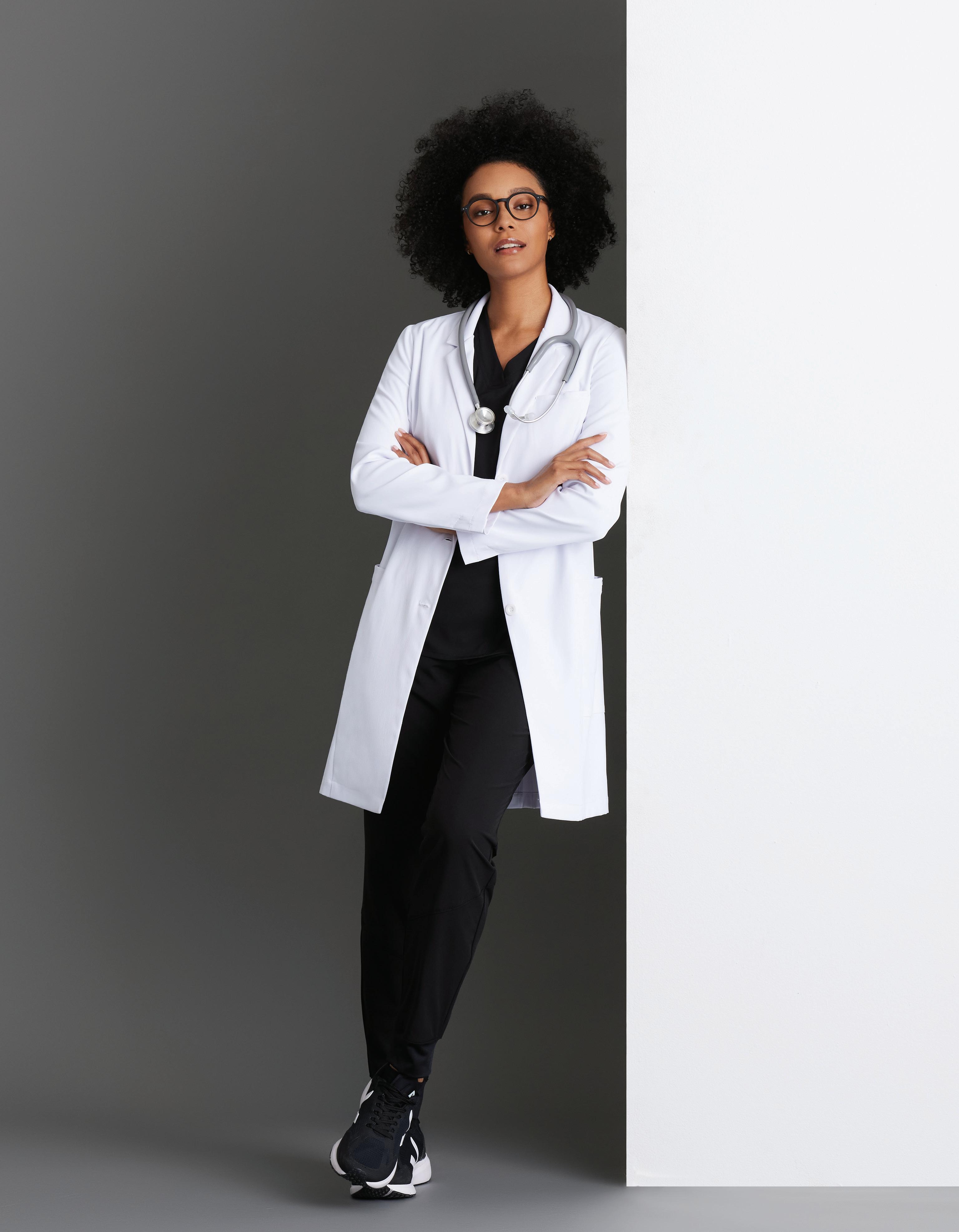 modern fit lab coat, notch lapel, front princess seams, top-entry tablet friendly waist pockets with interior pen slots, center back vent, sleeve cuffs with slits, and pocket label