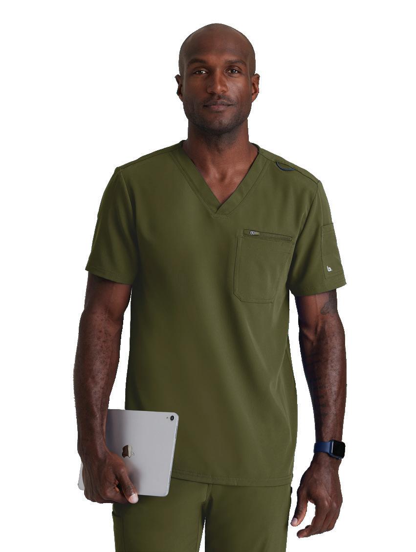3-pocket, banded V-neck, shoulder contrast badge loop, dyed-to-match zip chest pocket and patch pocket with pen slots, sleeve pocket, straight hem top