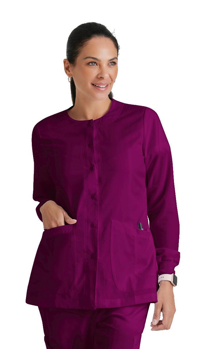 2-pocket, round neck, snap front closure, dyed-to-match seamless knit sock cuff sleeves, contrast back neck binding