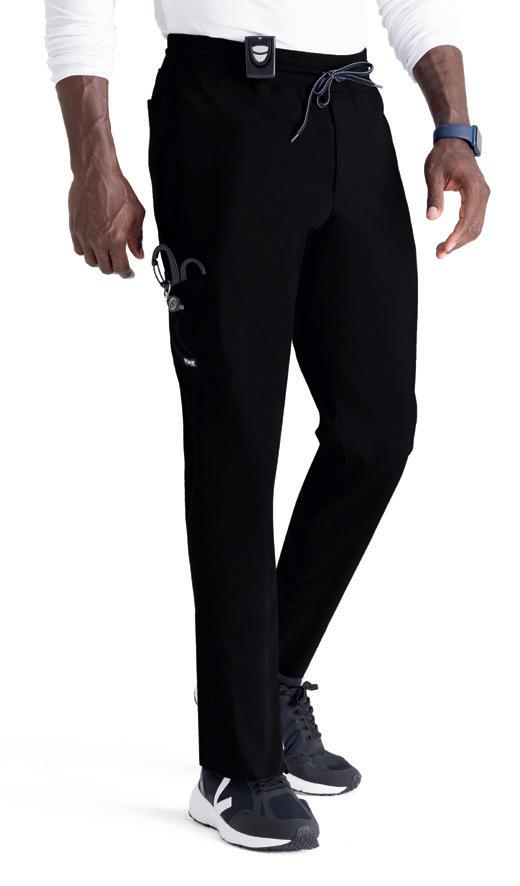 4-pocket flat waistband with drawcord and inside logo elastic, slanted front pockets, patch cargo pocket, back patch pocket with velcro closure, slim straight pant