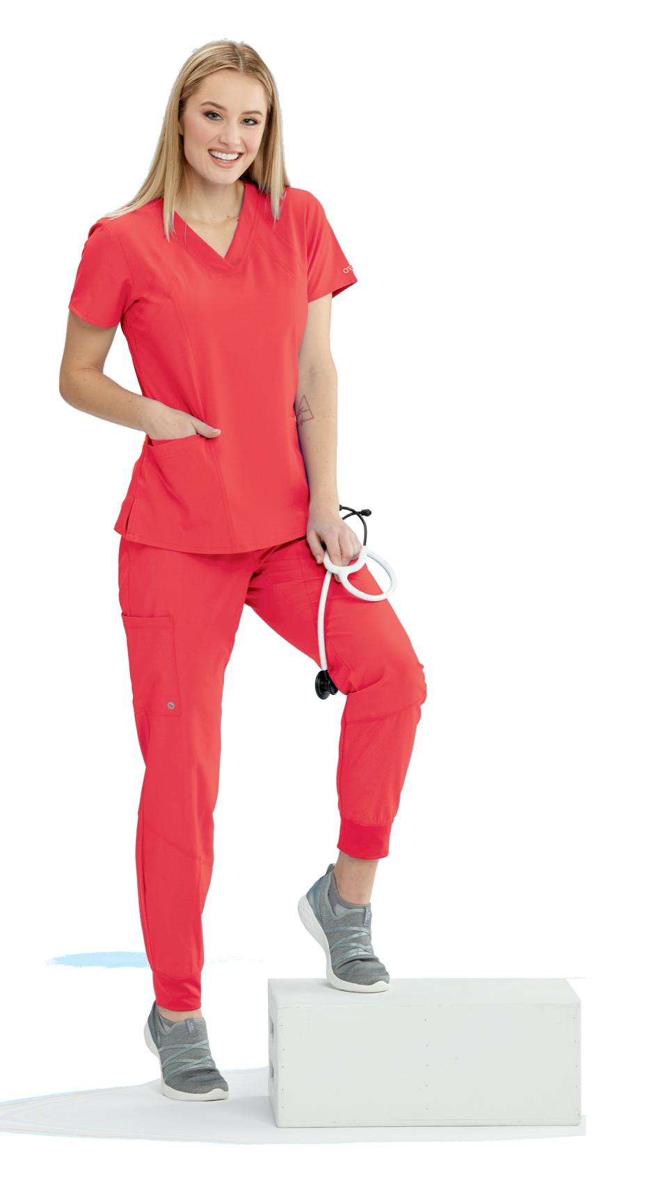 GRT085-CRCR Crimson Crest 4-pocket, shaped V-neck, with angled pockets