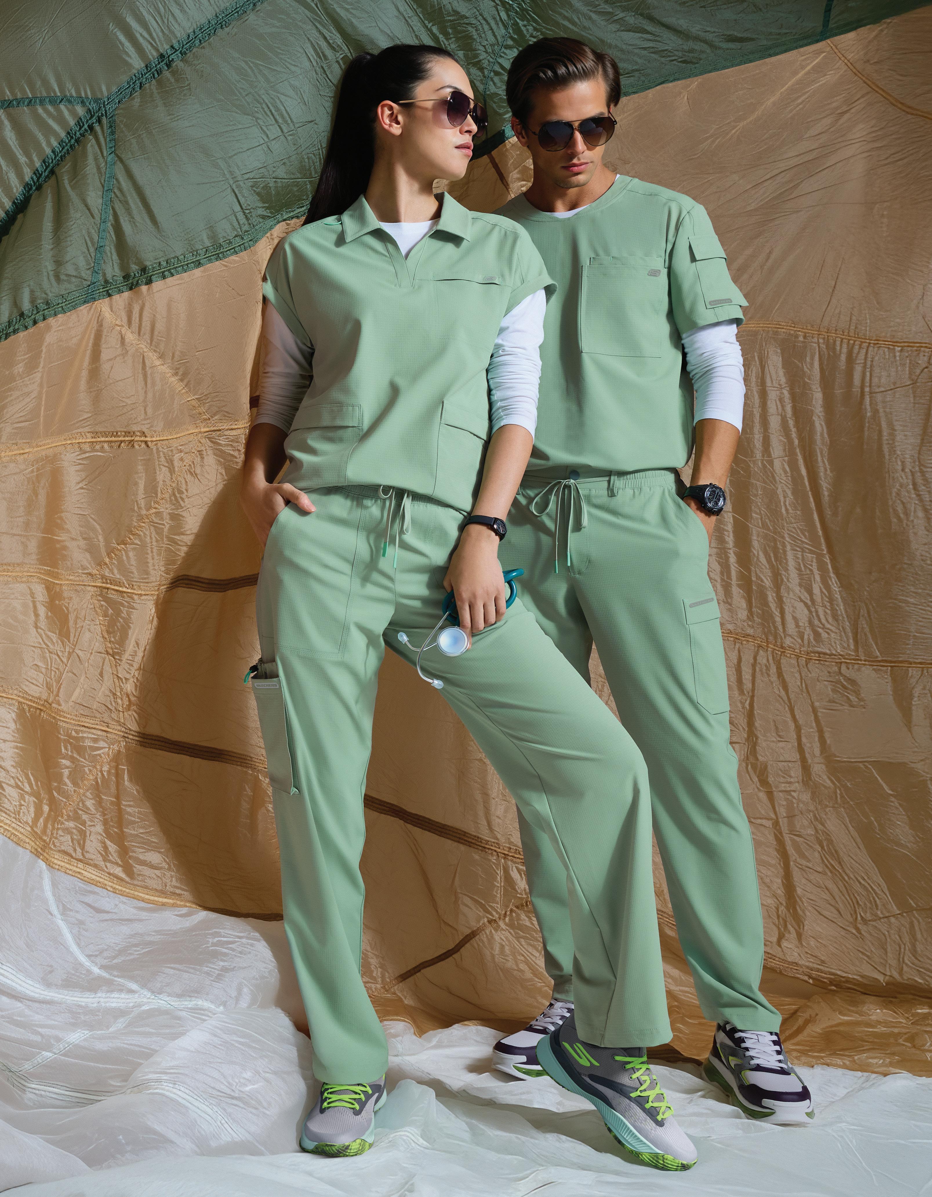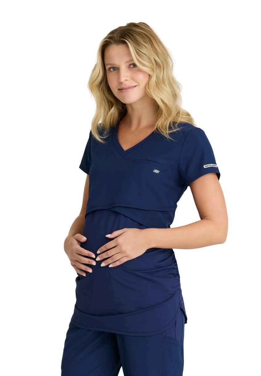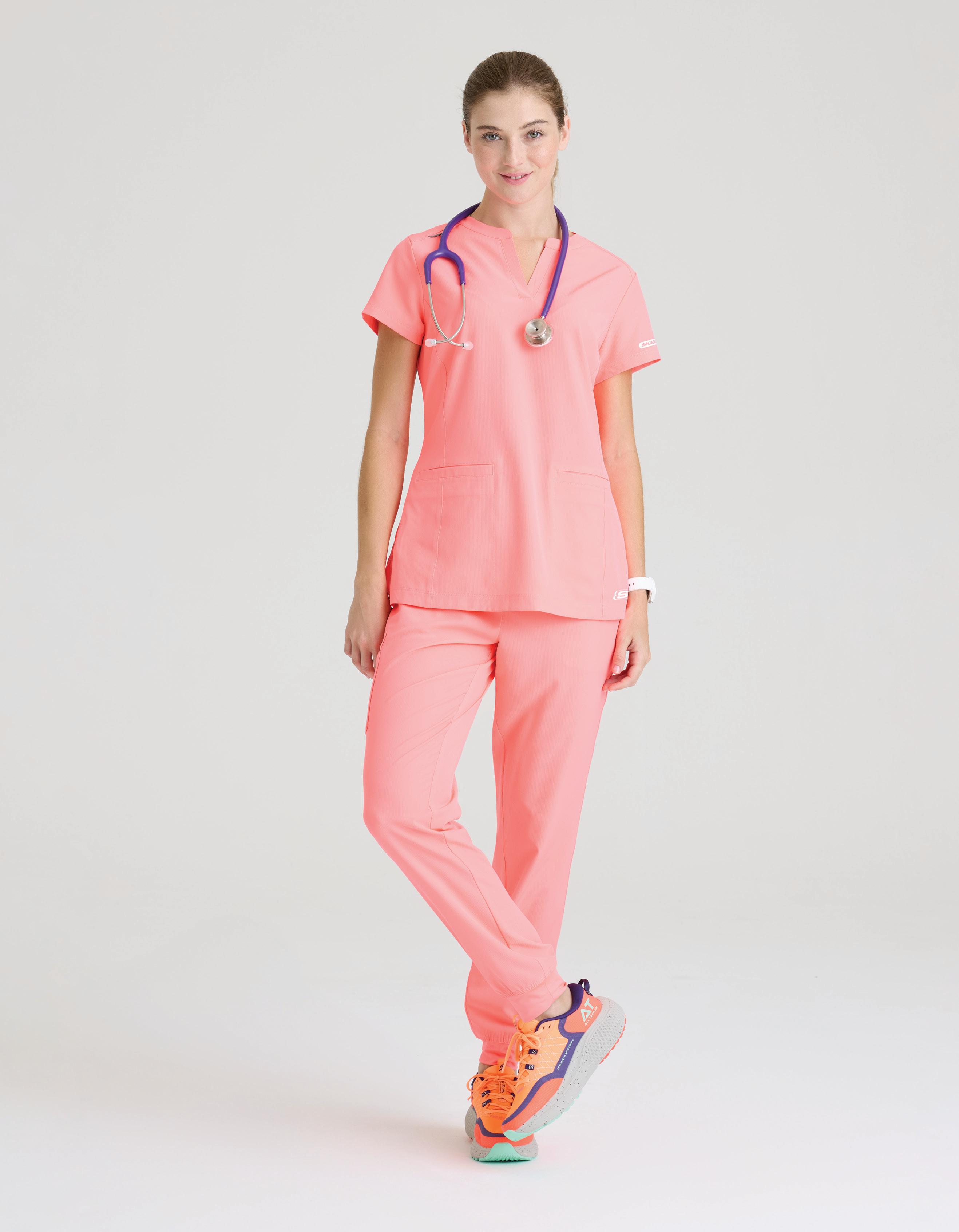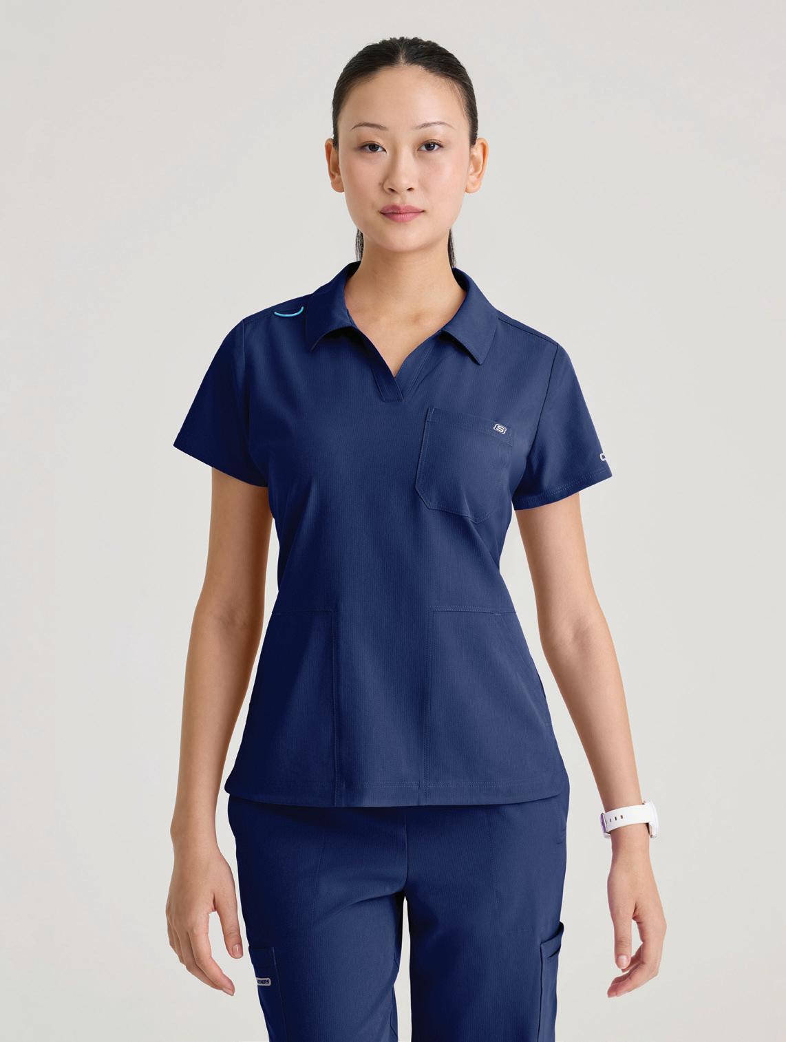 1-pocket banded curved V-neck, chest patch pocket, front and back princess seams, shoulder Steel badge loop, tulip hem top