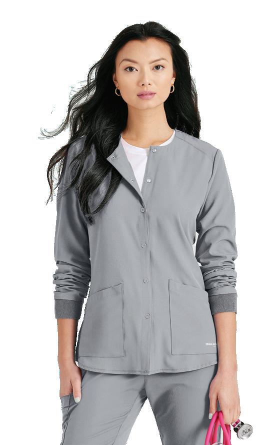 3-pocket banded collar, topentry waist pockets, inside left front pocket, self waistband, encased elastic cuffs, zip-front warm-up
