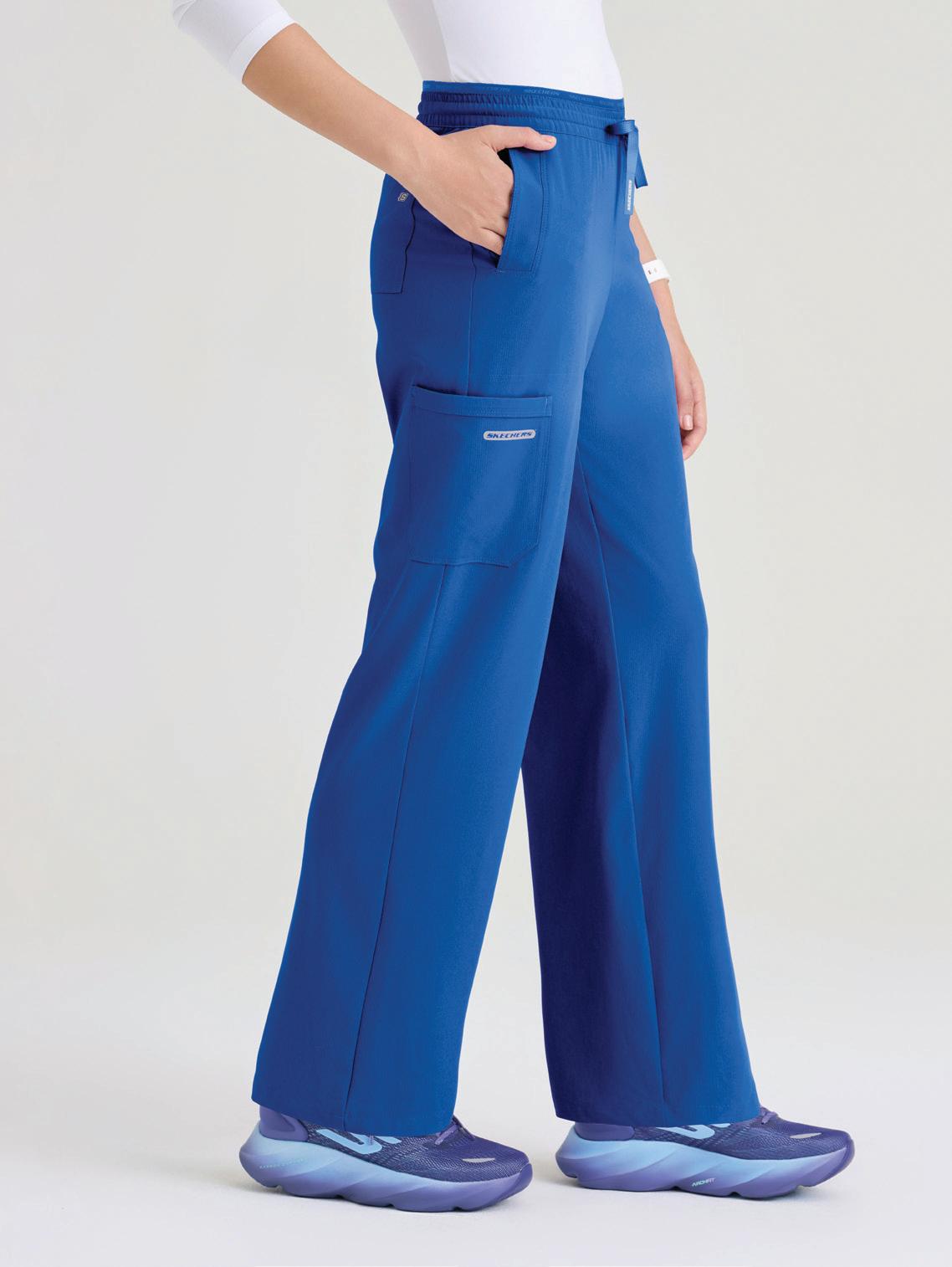 5-pocket shirred elastic waistband with tunneled drawcord, high-rise, on-seam slanted front pockets, bellows cargo pocket with adjustable inside pocket, patch back pocket wide leg pant