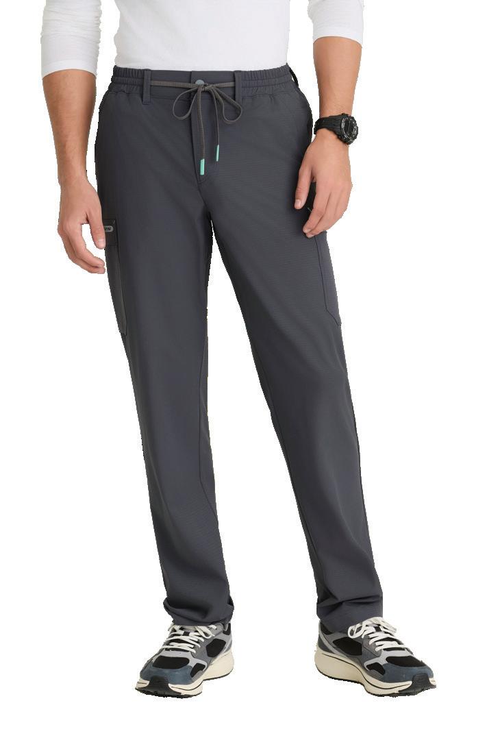 5-pocket encased elastic waistband with drawcord, on-seam zipper front pockets with shadow top stitching, patch cargo pocket with pen slot, ribbed cuff jogger
