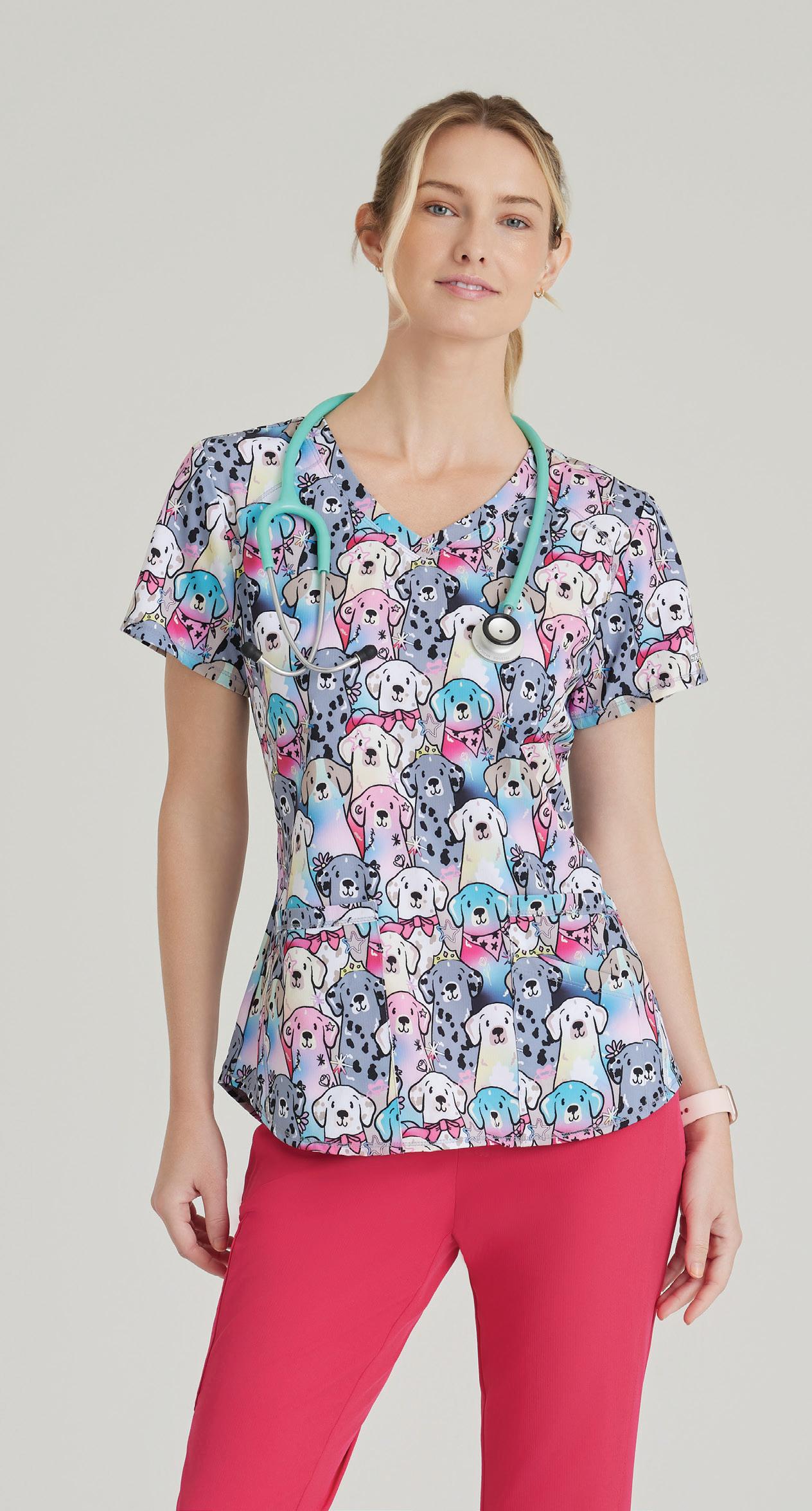 1-pocket banded curved v-neck, chest patch pocket, front and back princess seams, shoulder Steel badge loop, tulip hem top Sizes: XXS - 5XL, CB: 25.5"