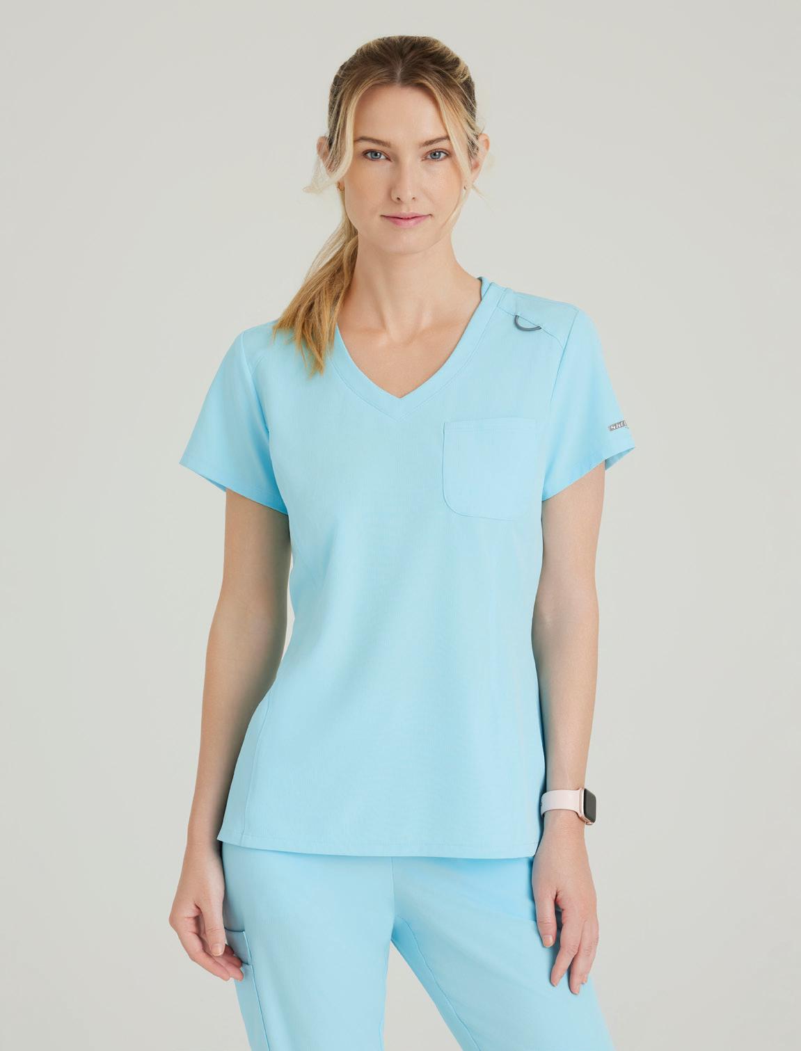 SK101 Breeze Top 3-pocket, virtual V-neck, shaped hem, detailed cover stitching, contrast back neck binding