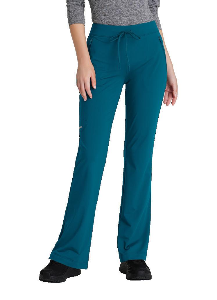 4-pocket flat waistband with drawcord and inside logo elastic, angled zipper front pockets, patch cargo pocket with pen slot, back patch pocket, fit & flare pant