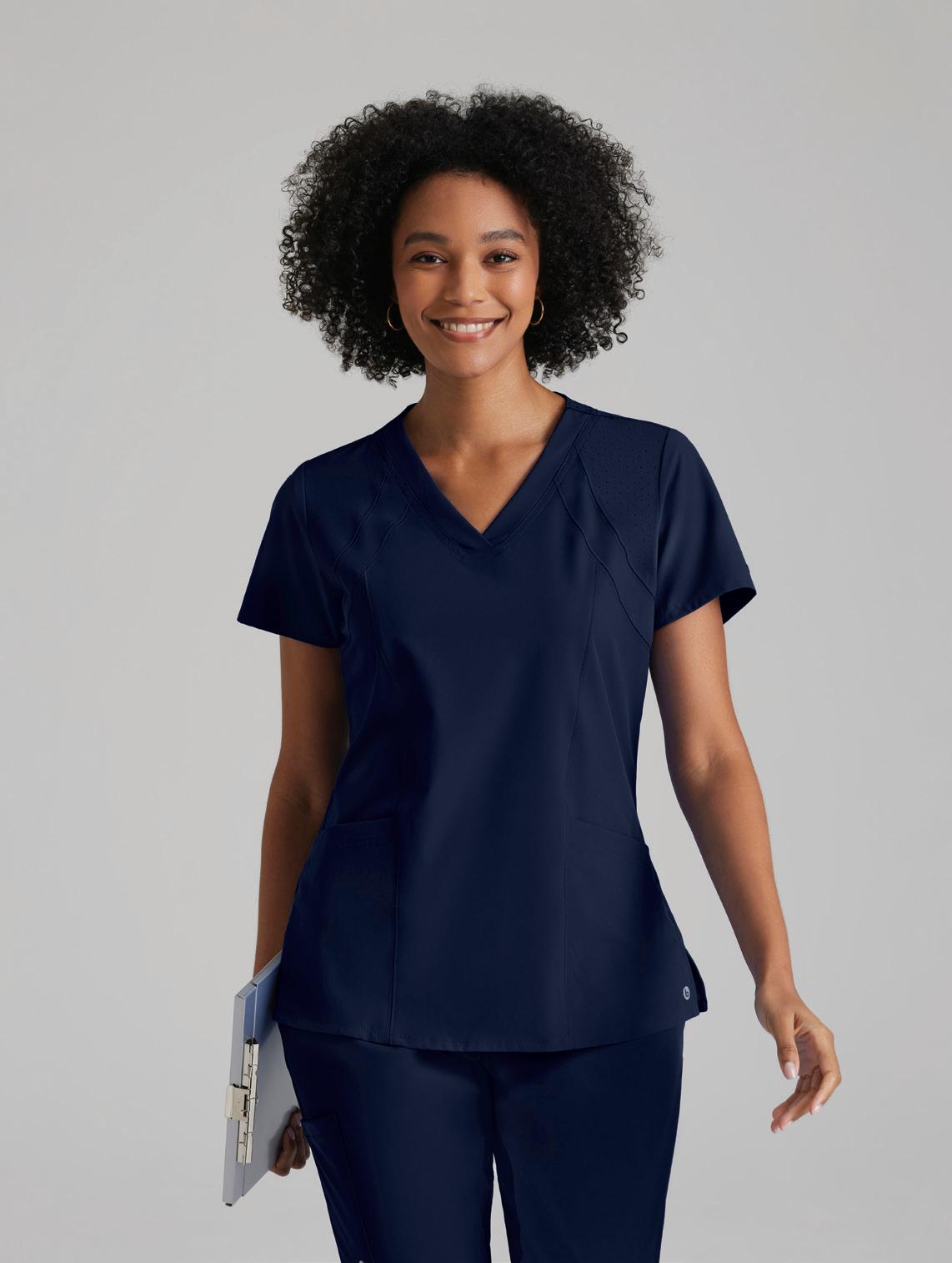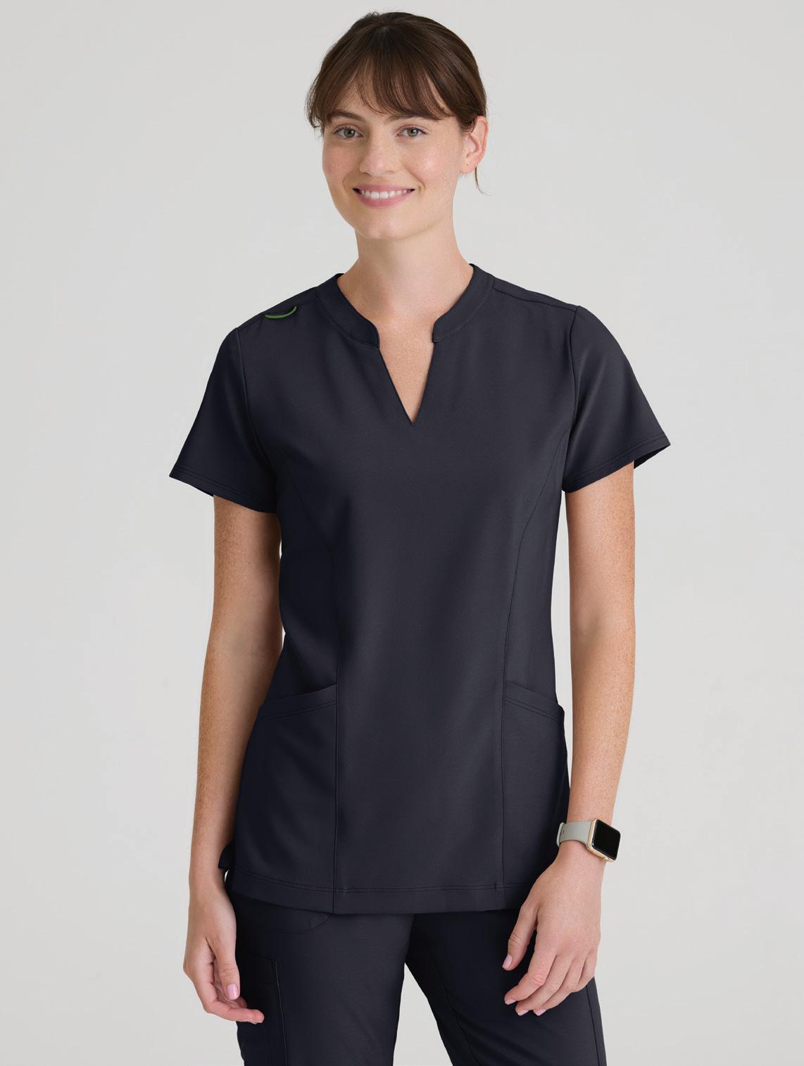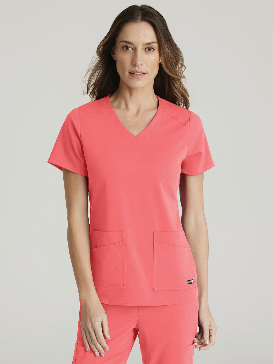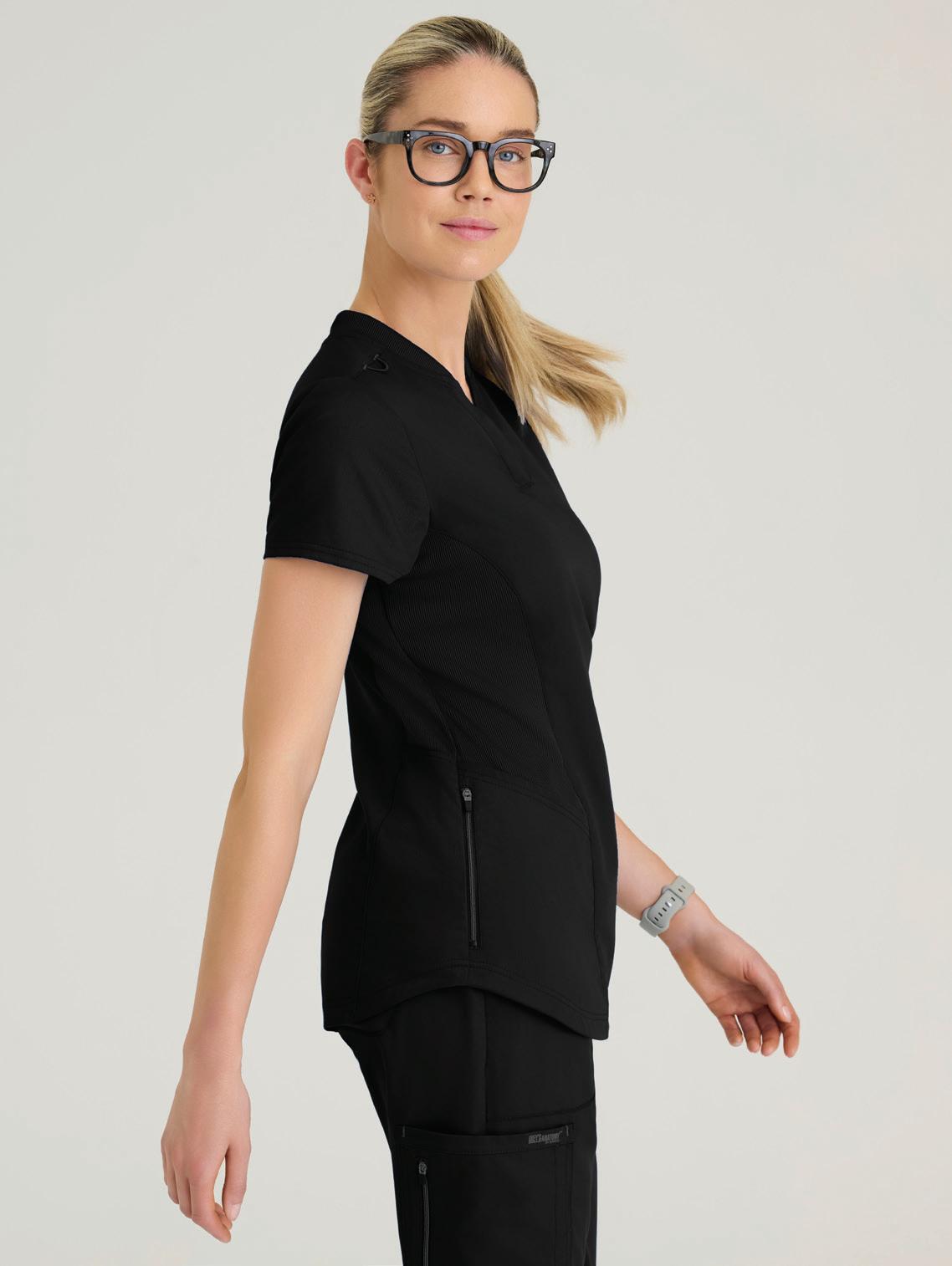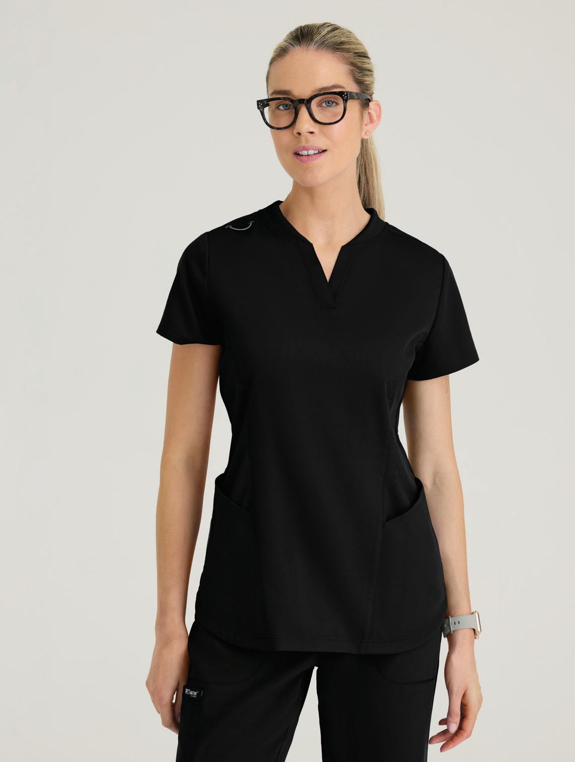 GRST045 Serena Top 3-pocket, ribbed V-neck, PDA pocket, logo tape side slit detail, rib knit back insets with princess seam, straight hem
