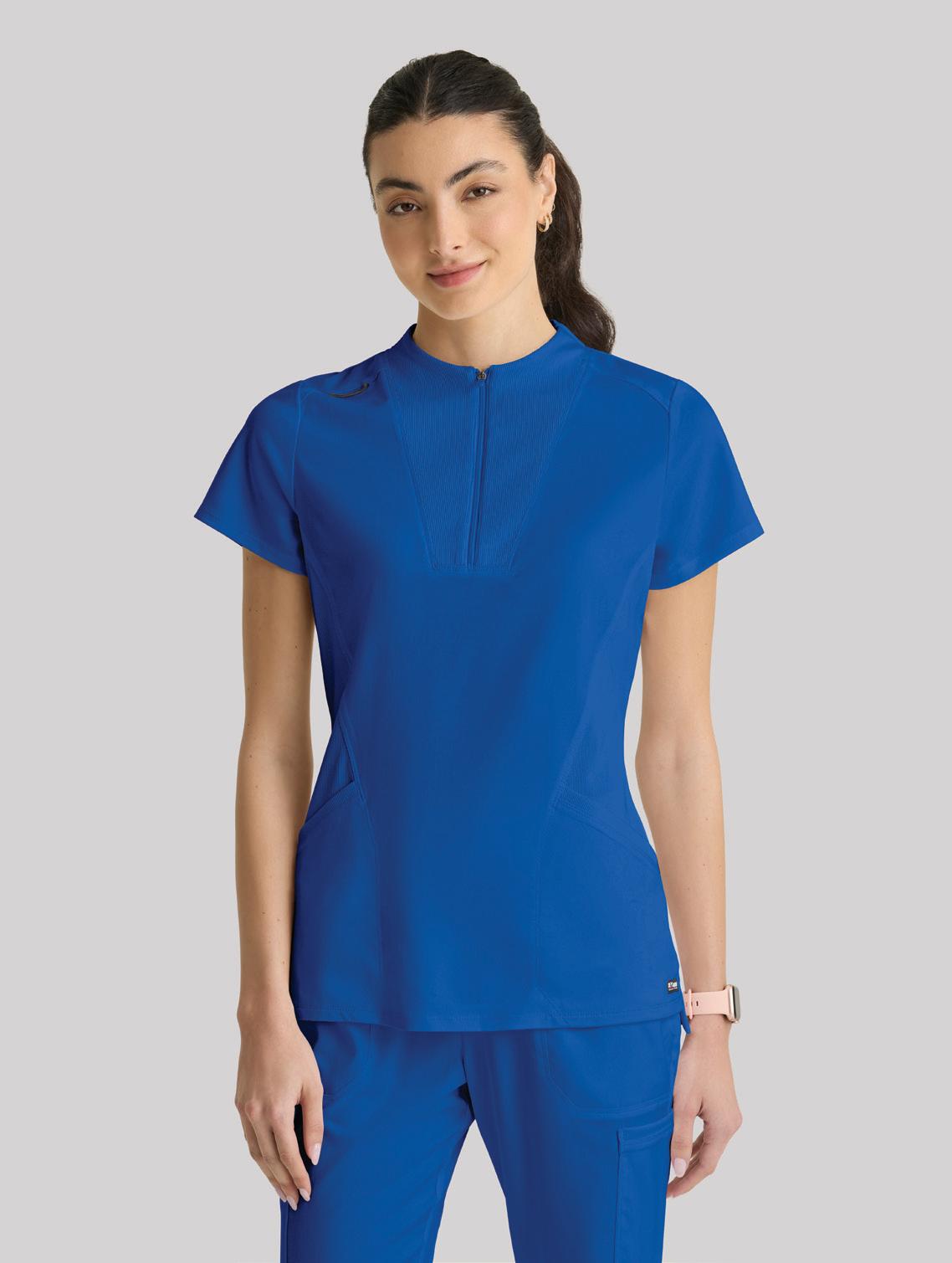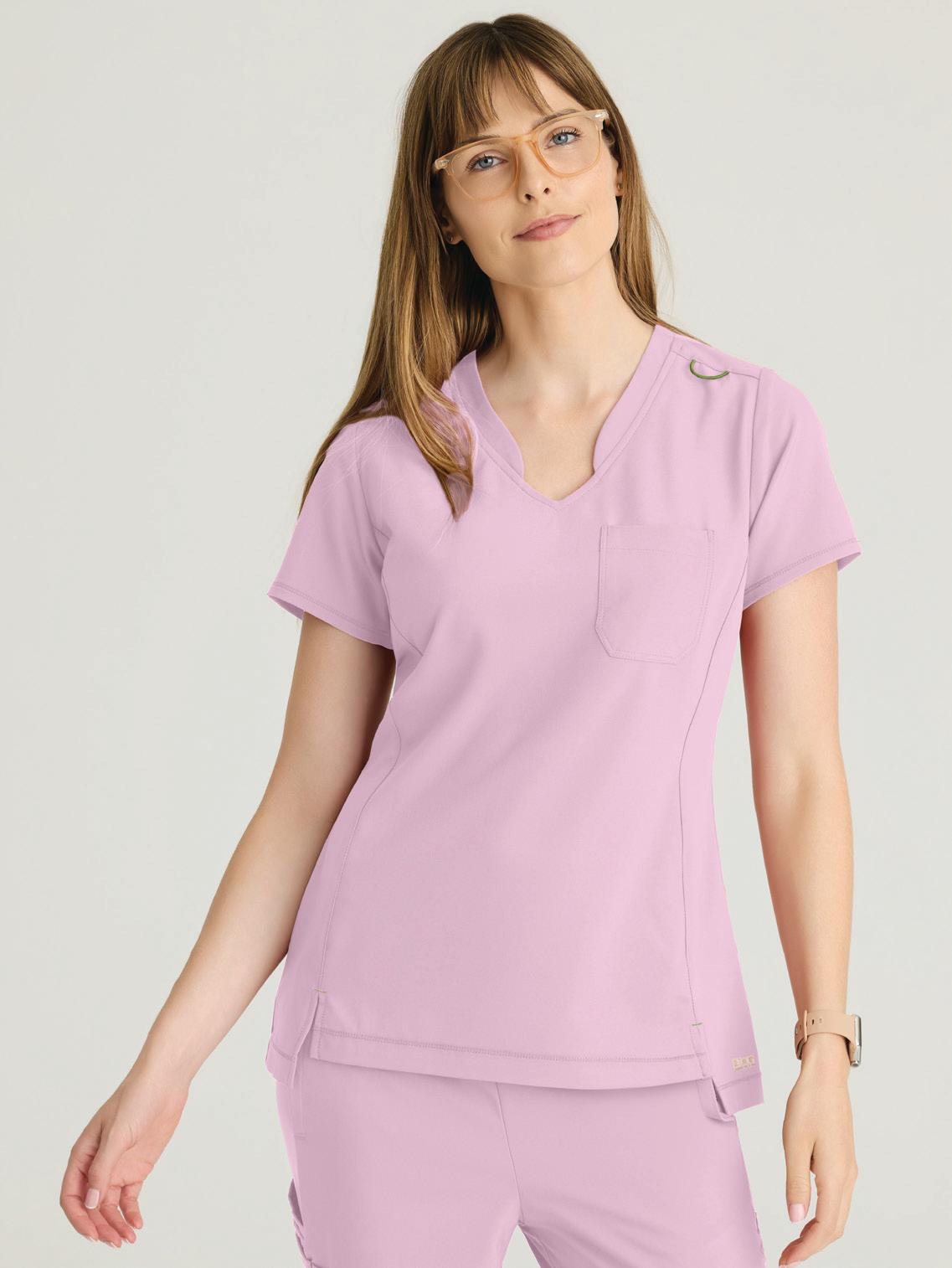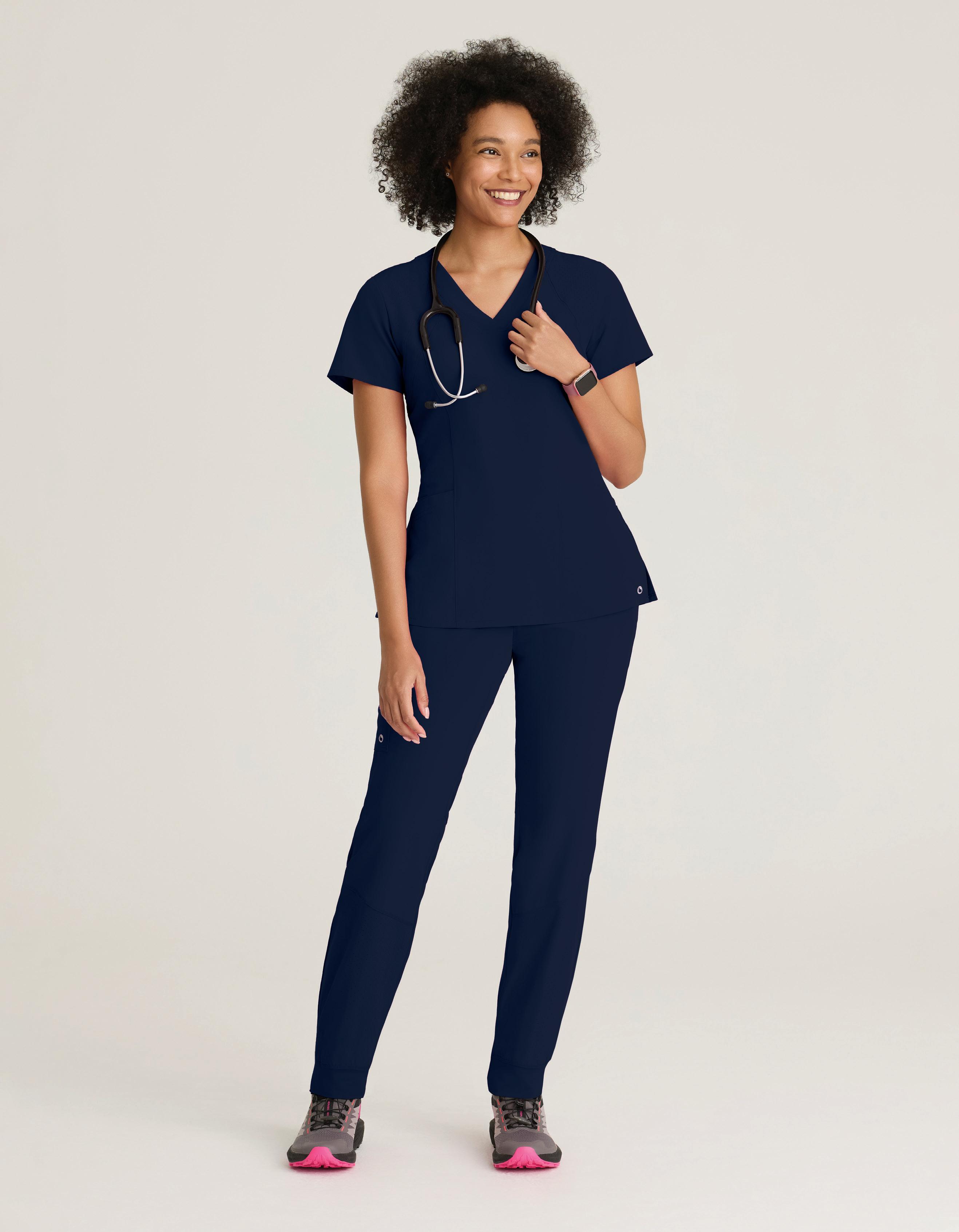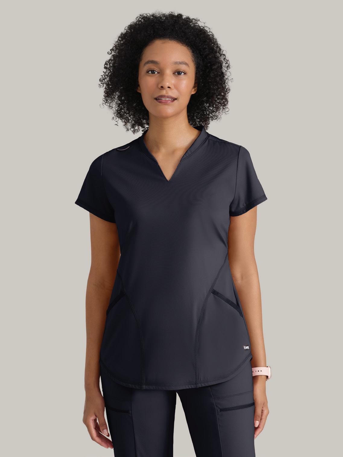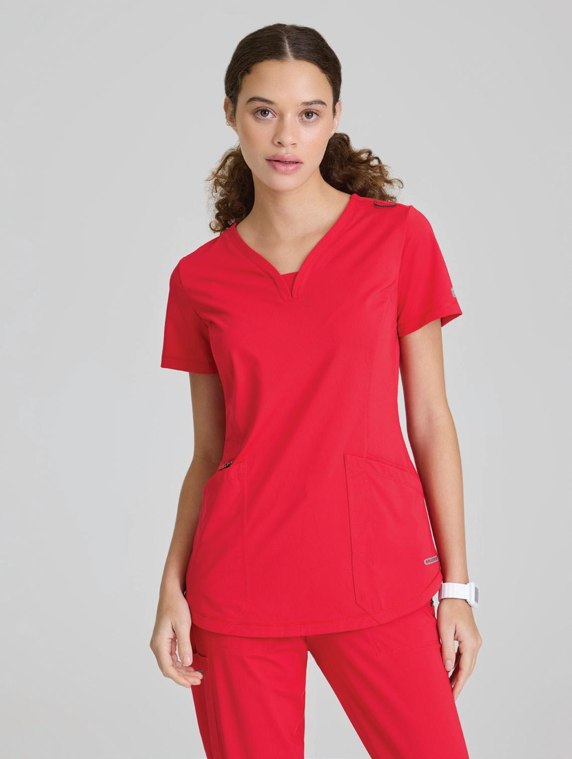 GRST045 Serena Top 3-pocket, ribbed V-neck, PDA pocket, logo tape side slit detail, rib knit back insets with princess seam, straight hem