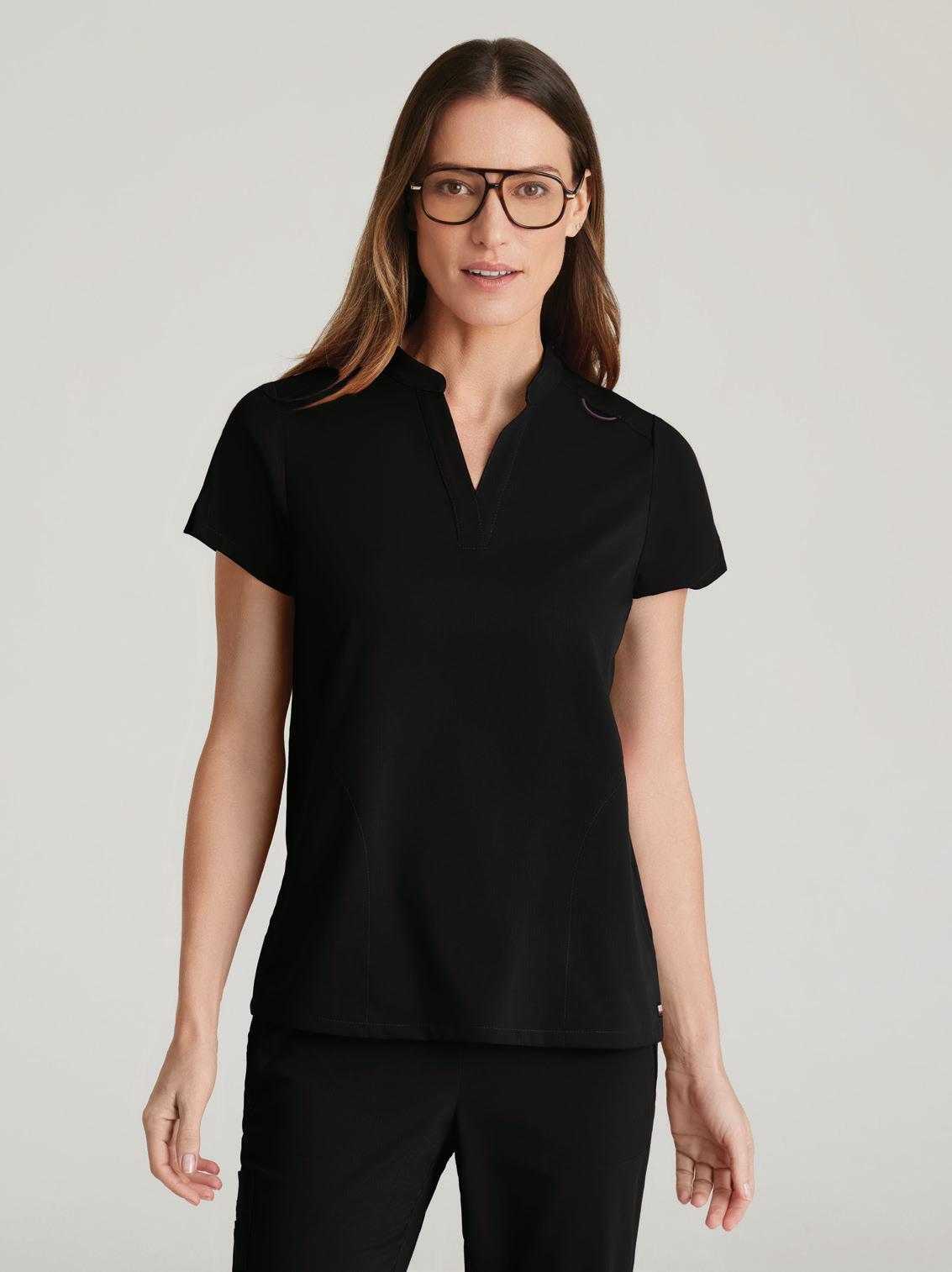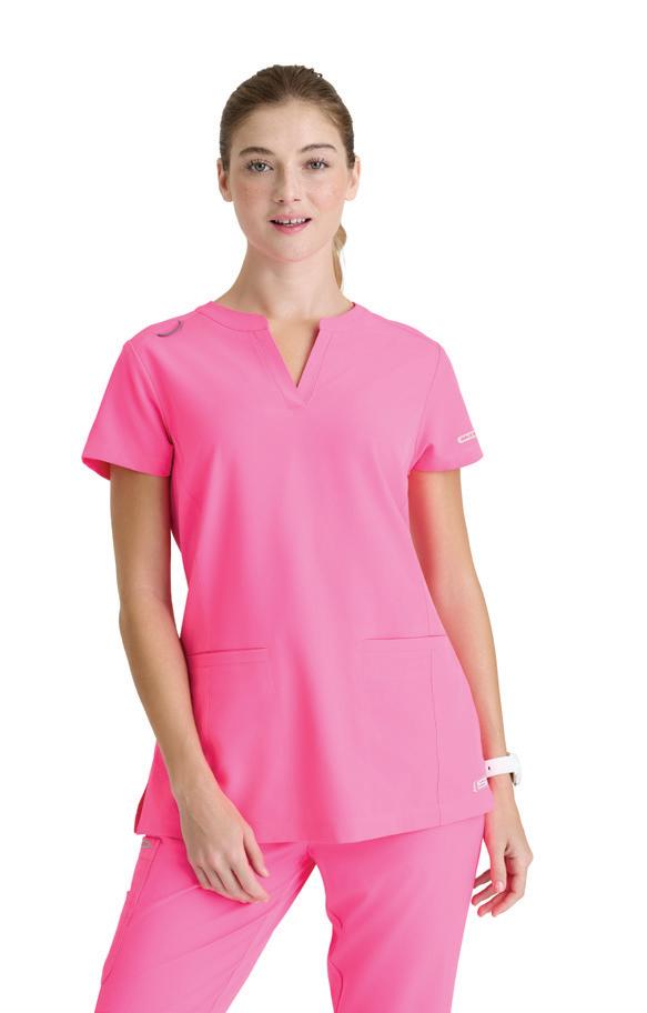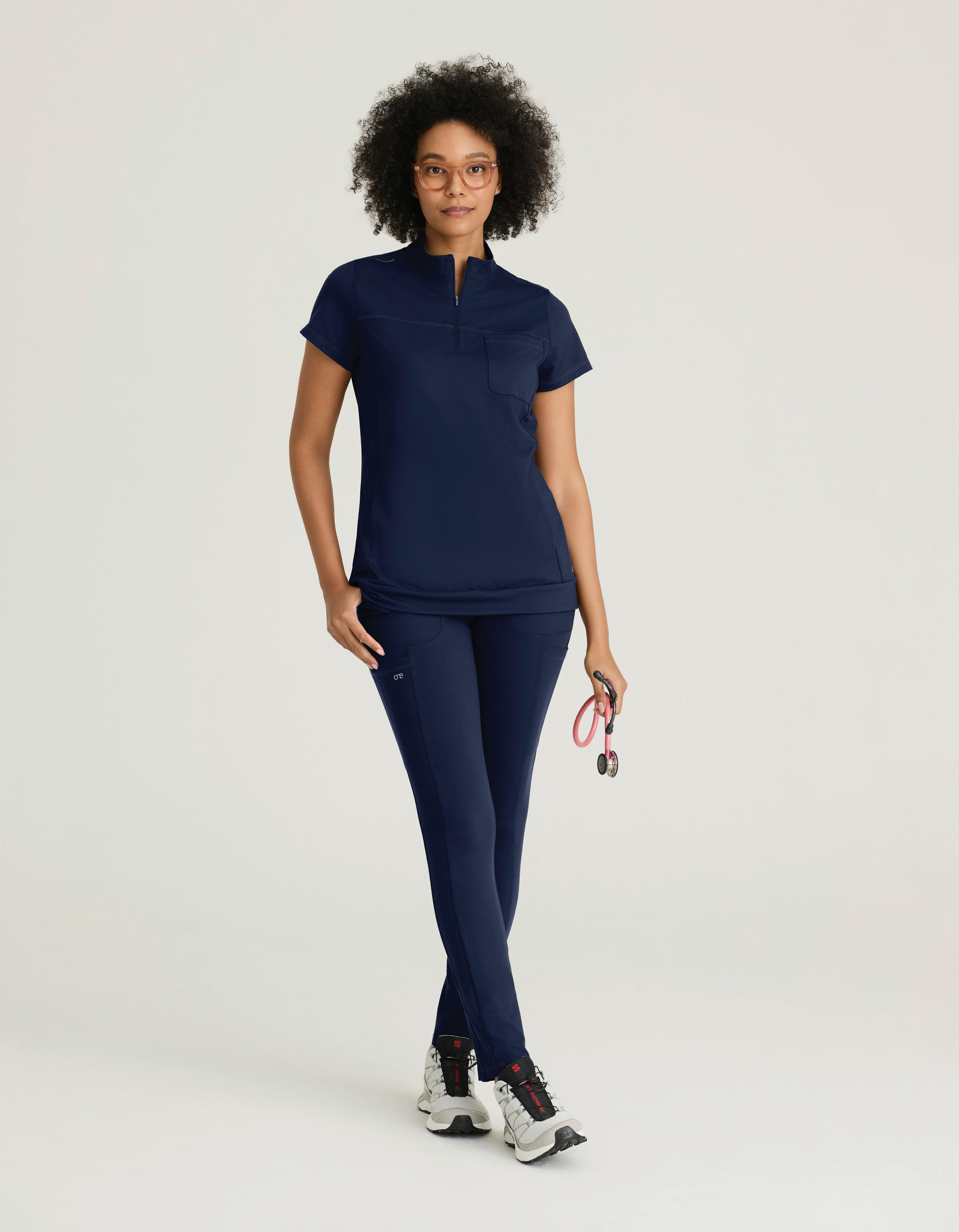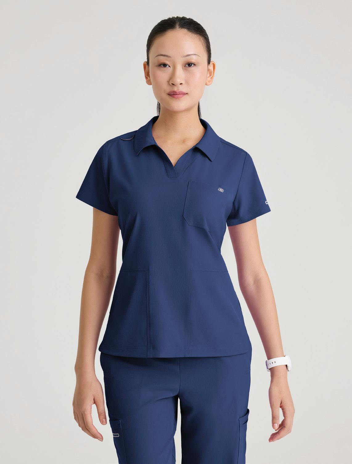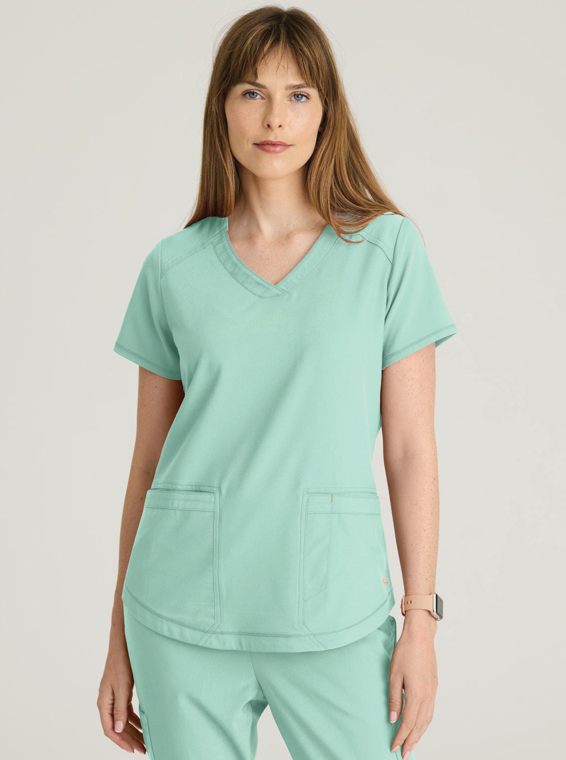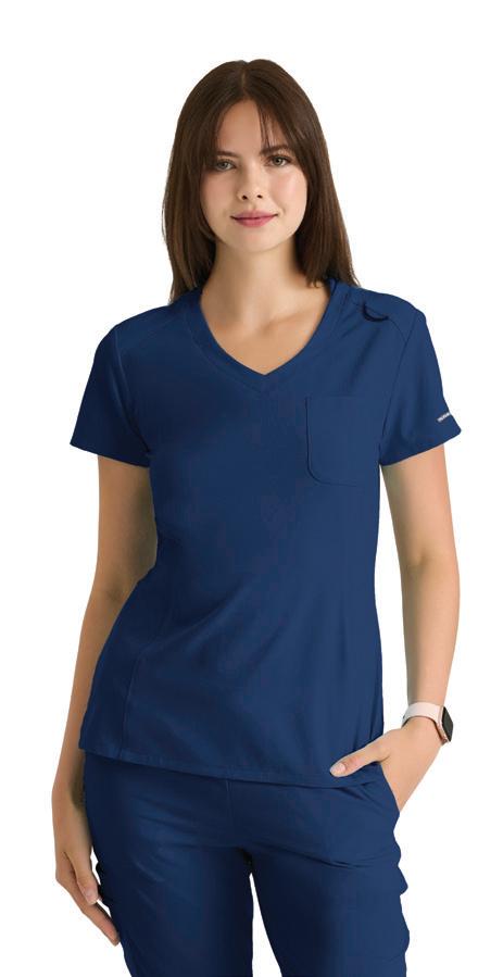 GRST045 Serena Top 3-pocket, ribbed V-neck, PDA pocket, logo tape side slit detail, rib knit back insets with princess seam, straight hem