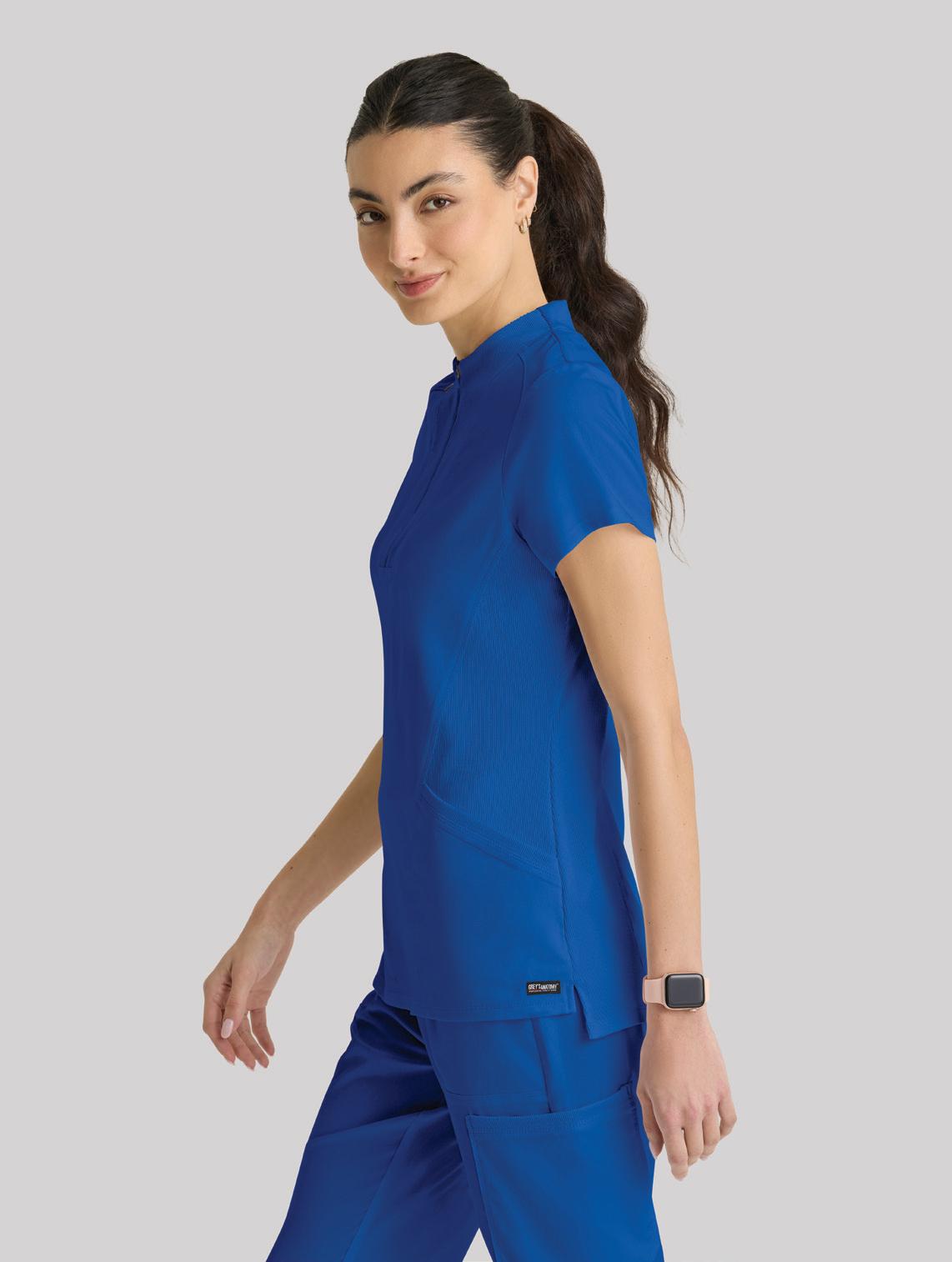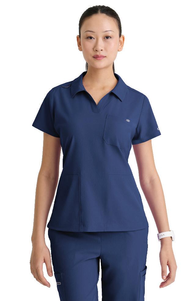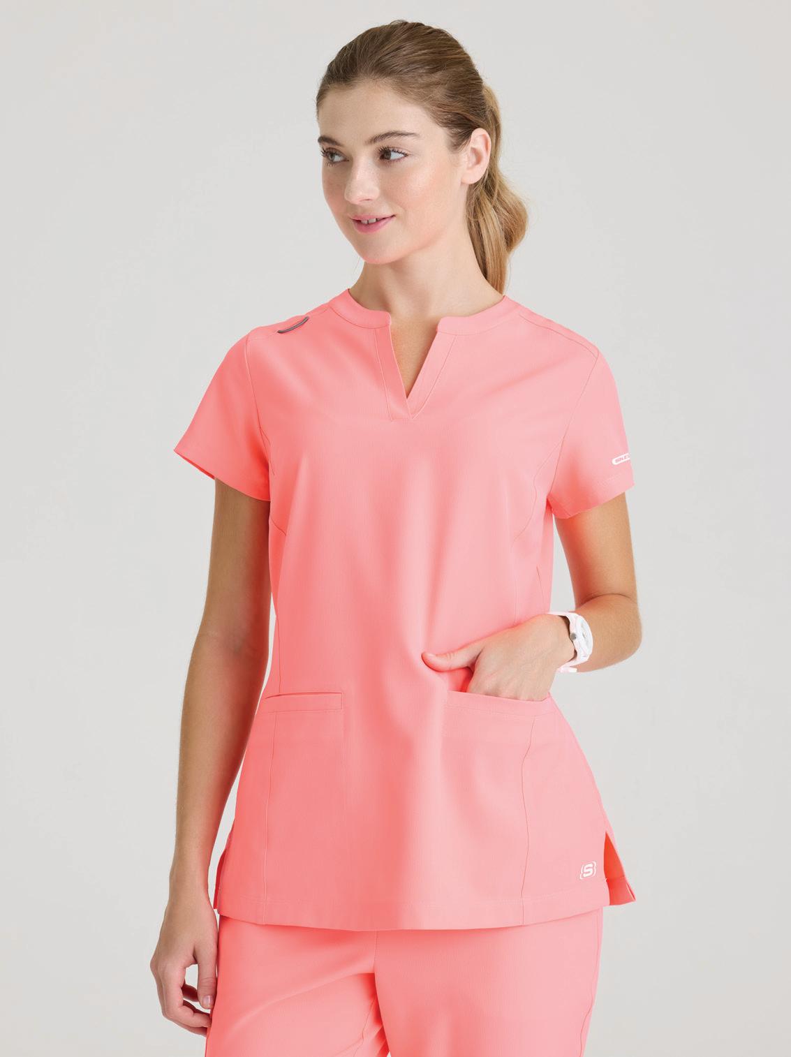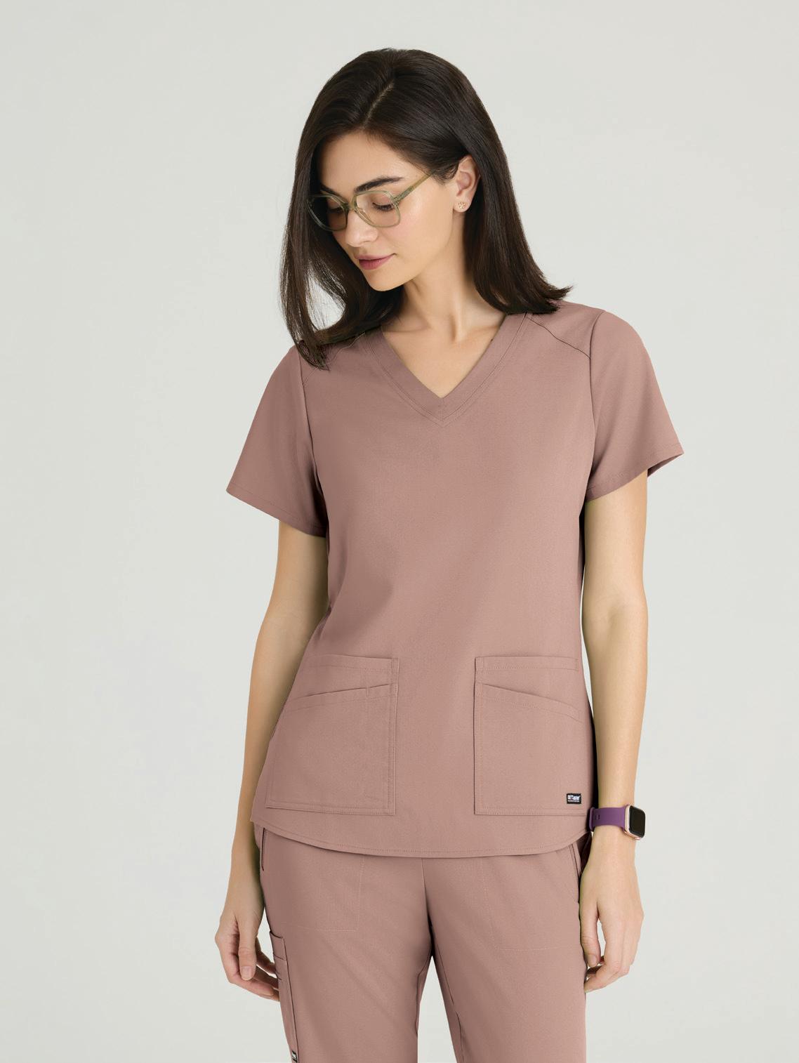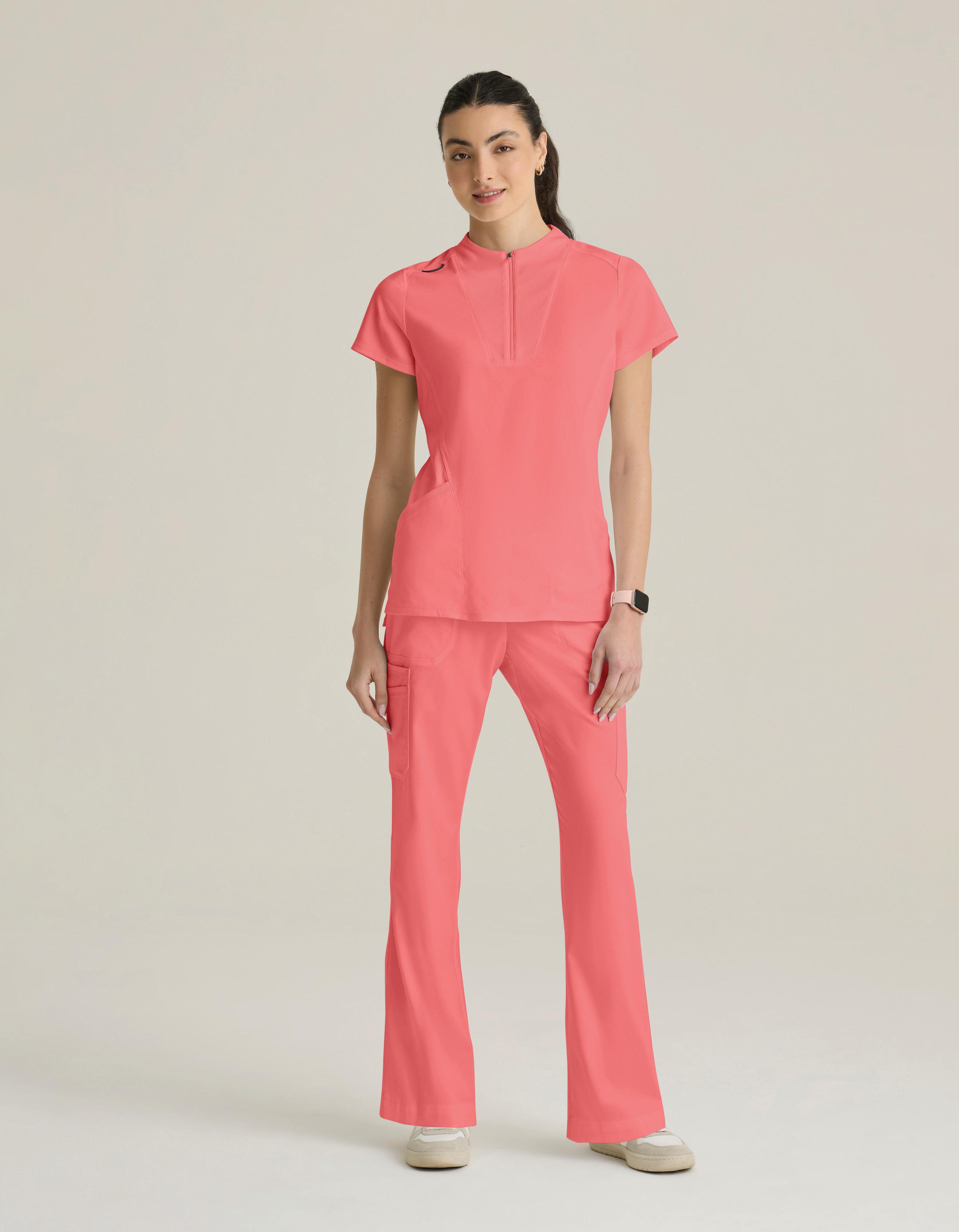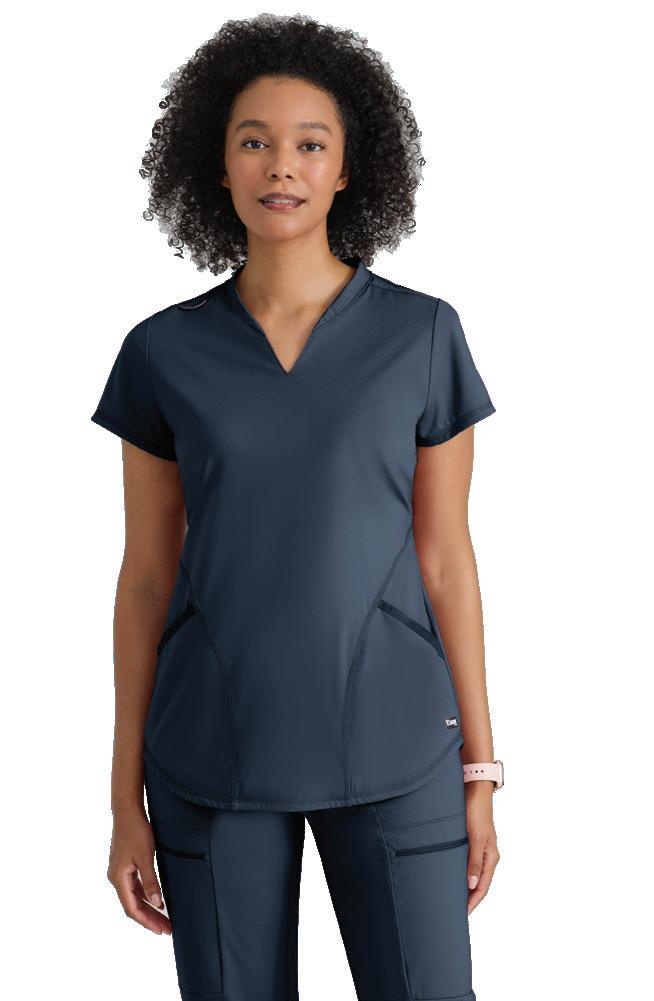 GRST045 Serena Top 3-pocket, ribbed V-neck, PDA pocket, logo tape side slit detail, rib knit back insets with princess seam, straight hem
