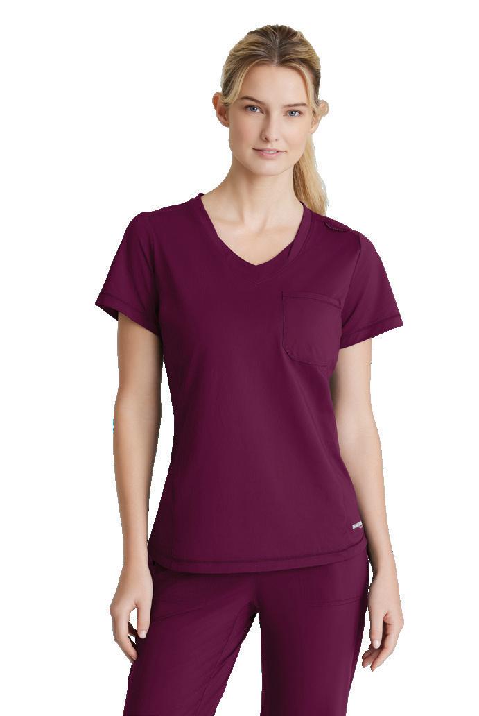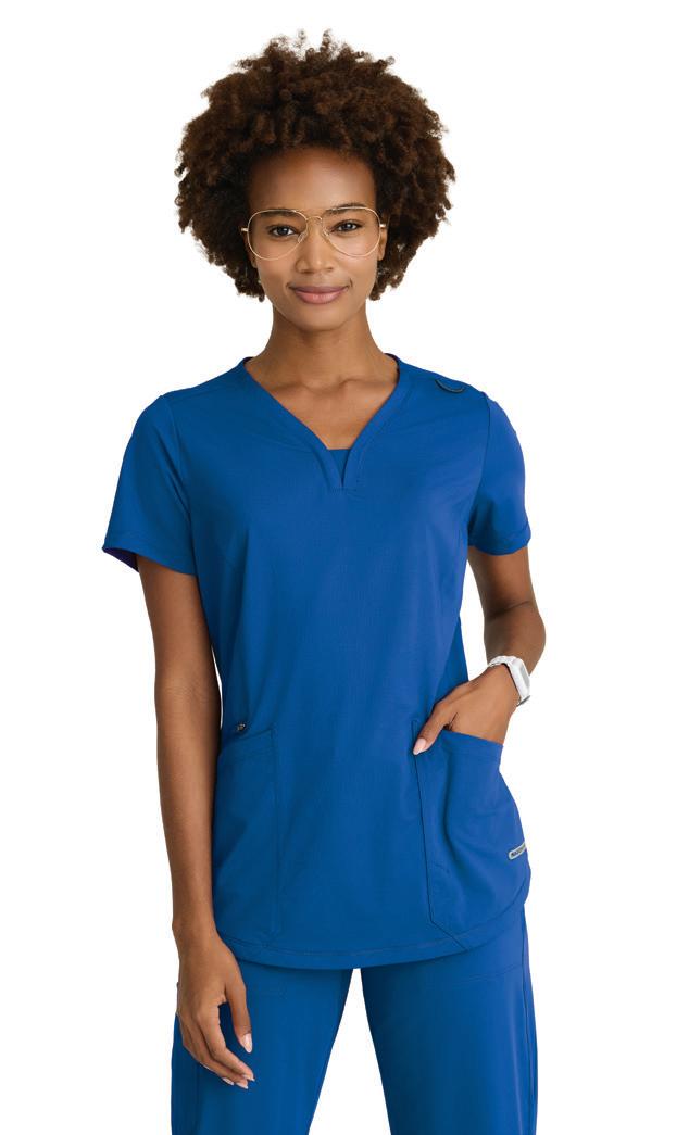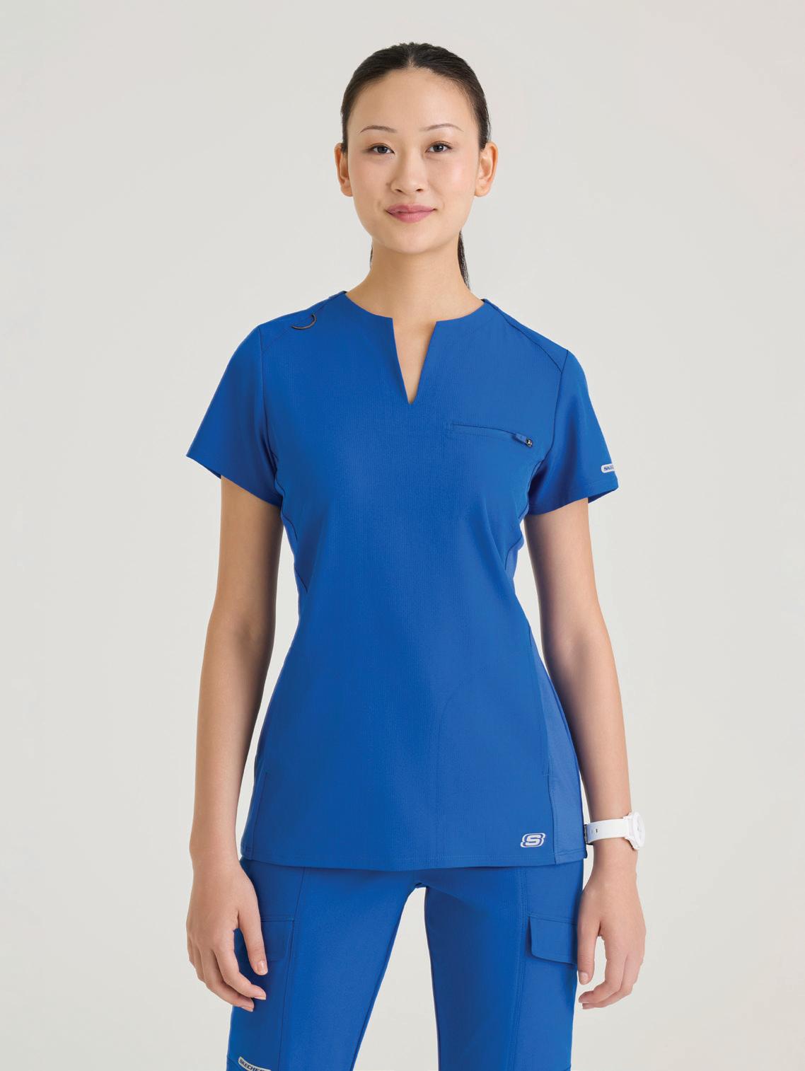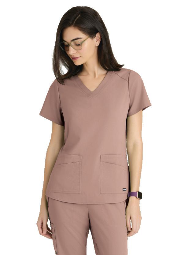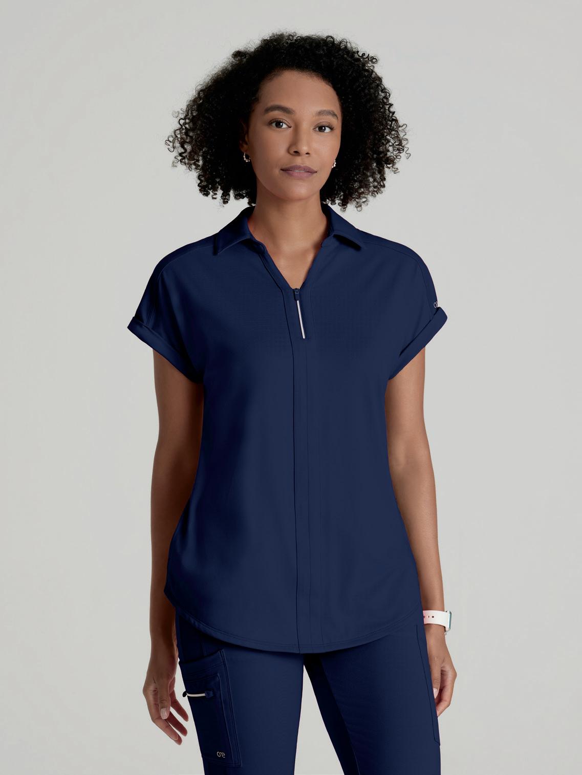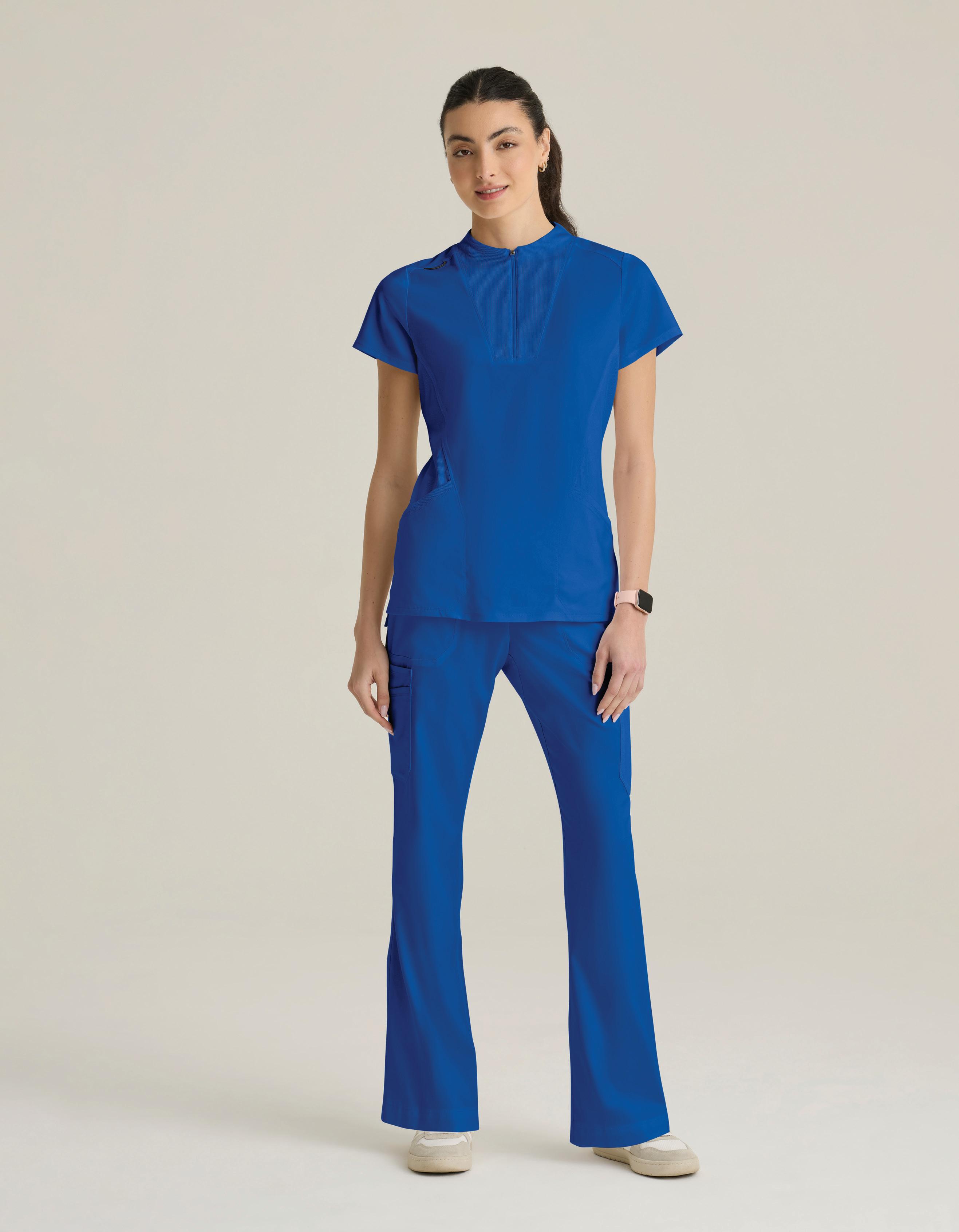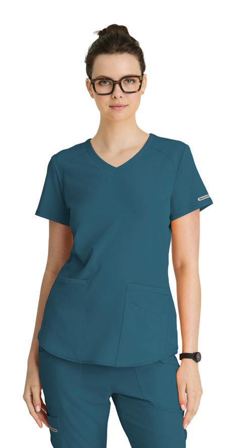 GRST045 Serena Top 3-pocket, ribbed V-neck, PDA pocket, logo tape side slit detail, rib knit back insets with princess seam, straight hem
