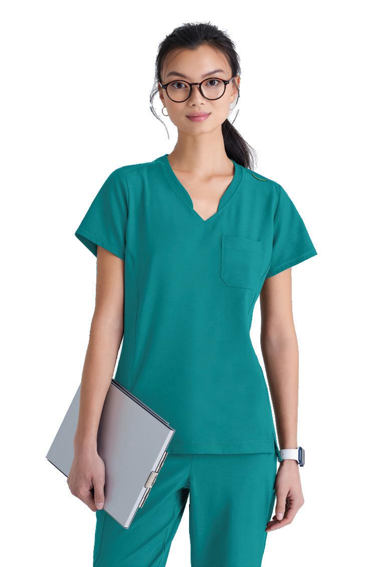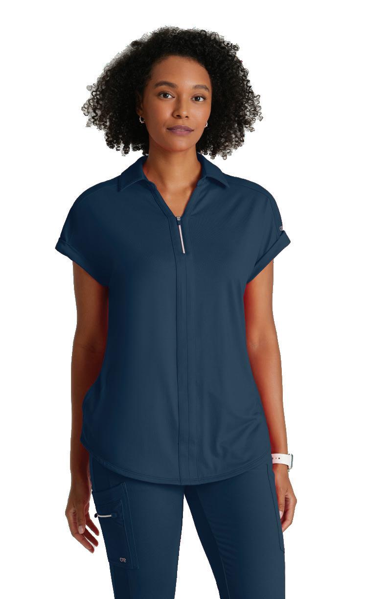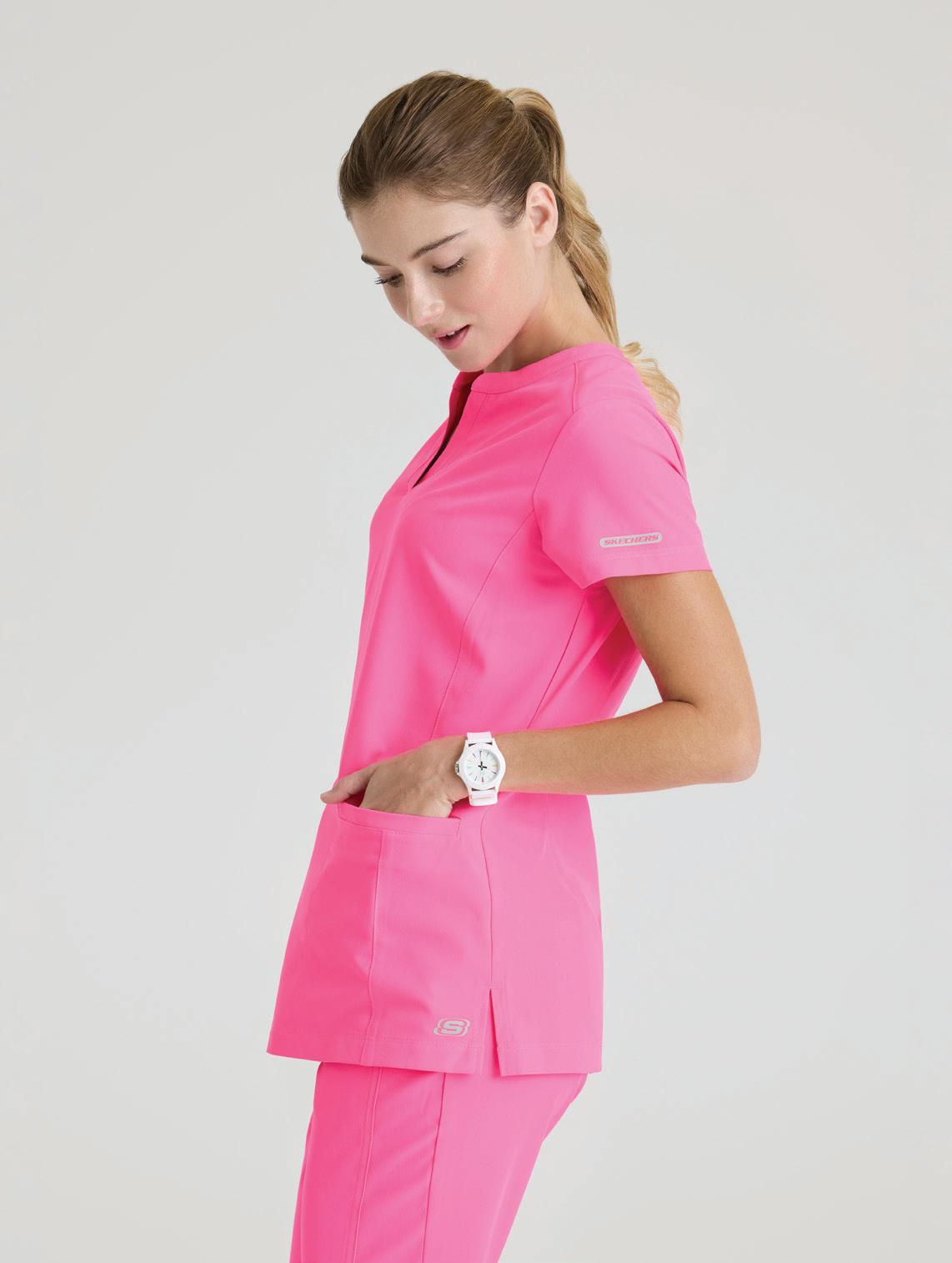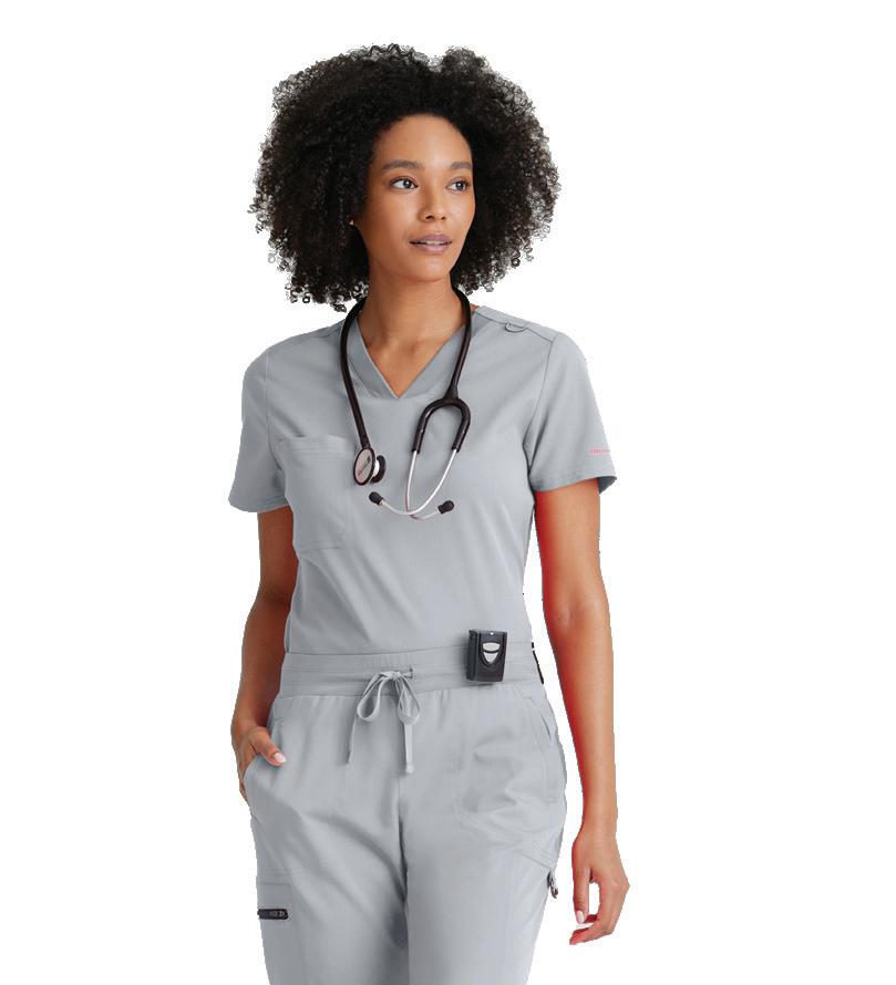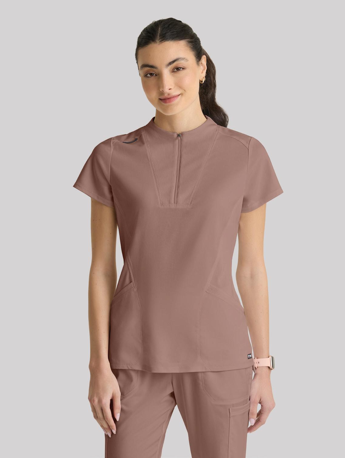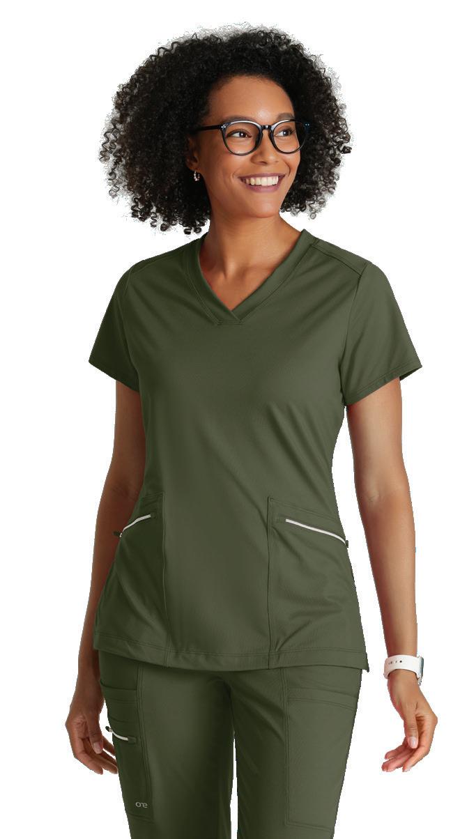 GRST045 Serena Top 3-pocket, ribbed V-neck, PDA pocket, logo tape side slit detail, rib knit back insets with princess seam, straight hem