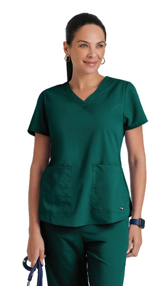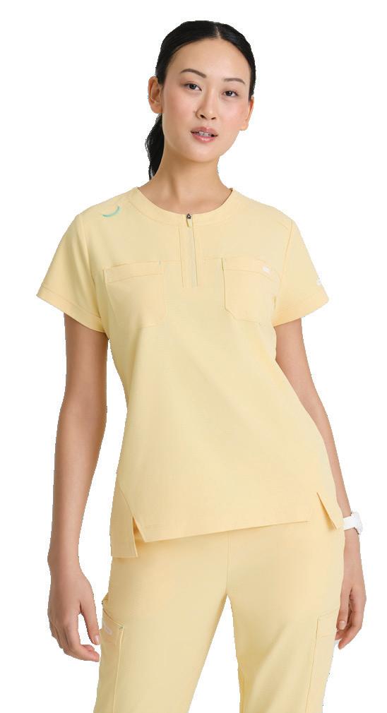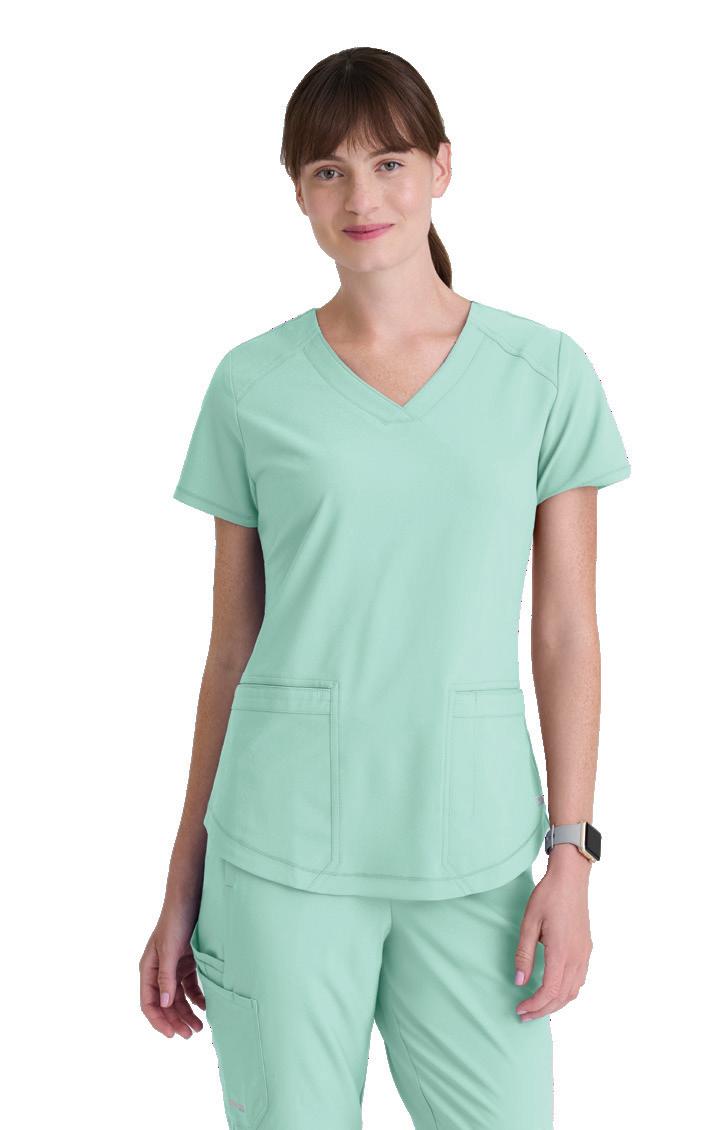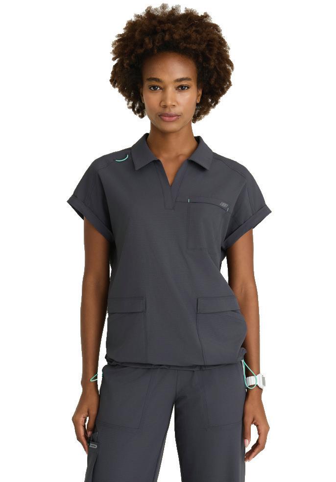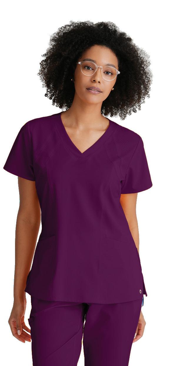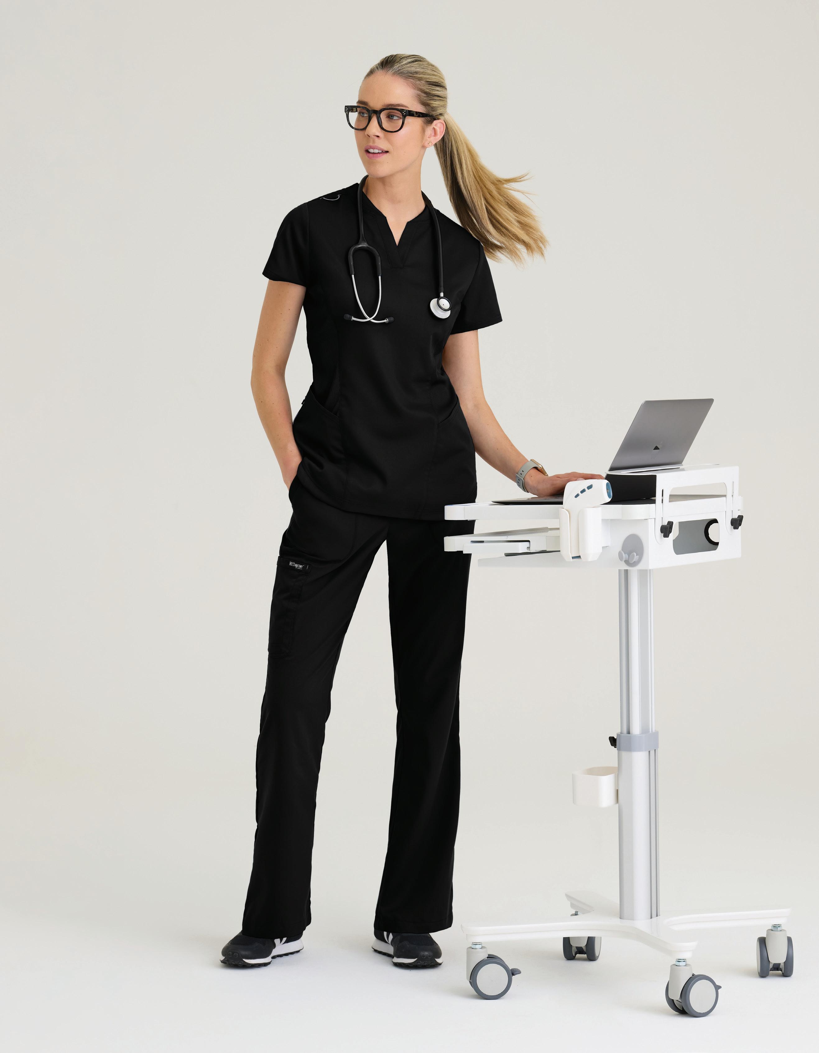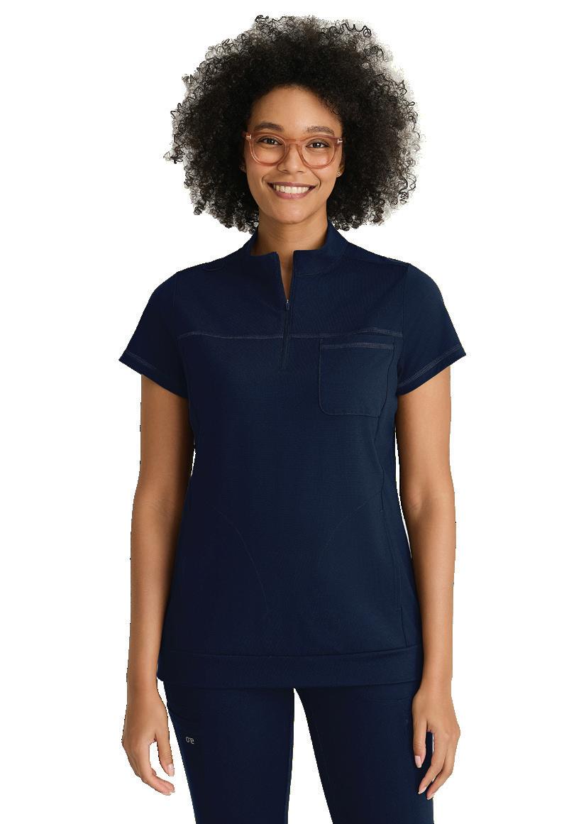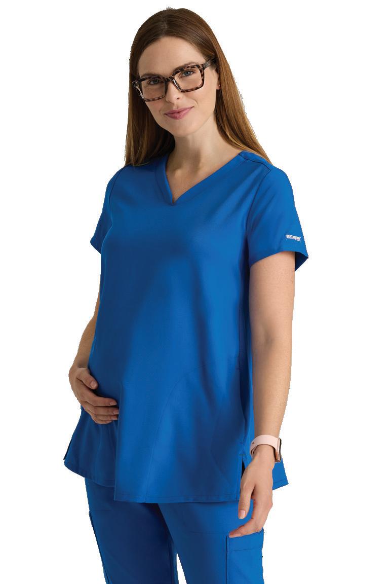 GRST045 Serena Top 3-pocket, ribbed V-neck, PDA pocket, logo tape side slit detail, rib knit back insets with princess seam, straight hem
