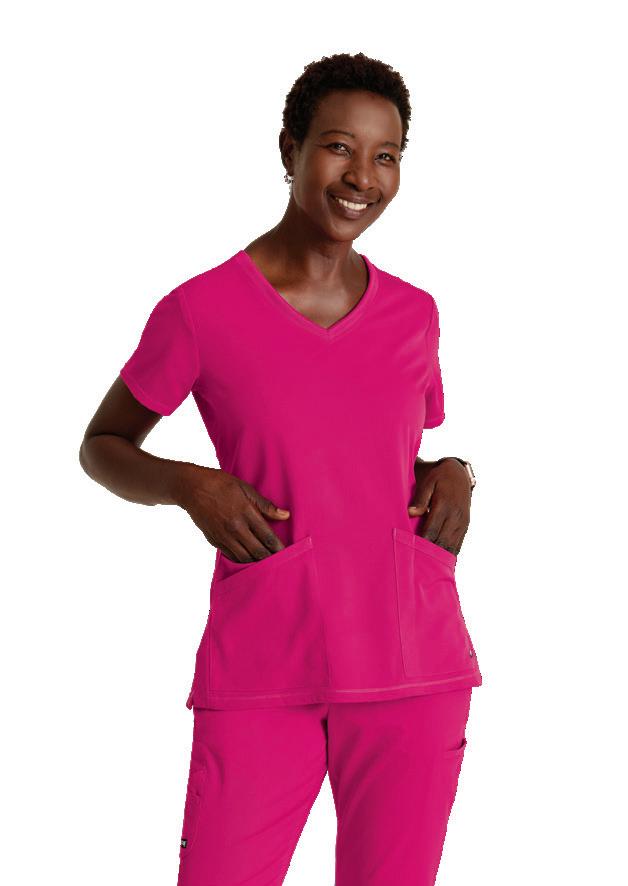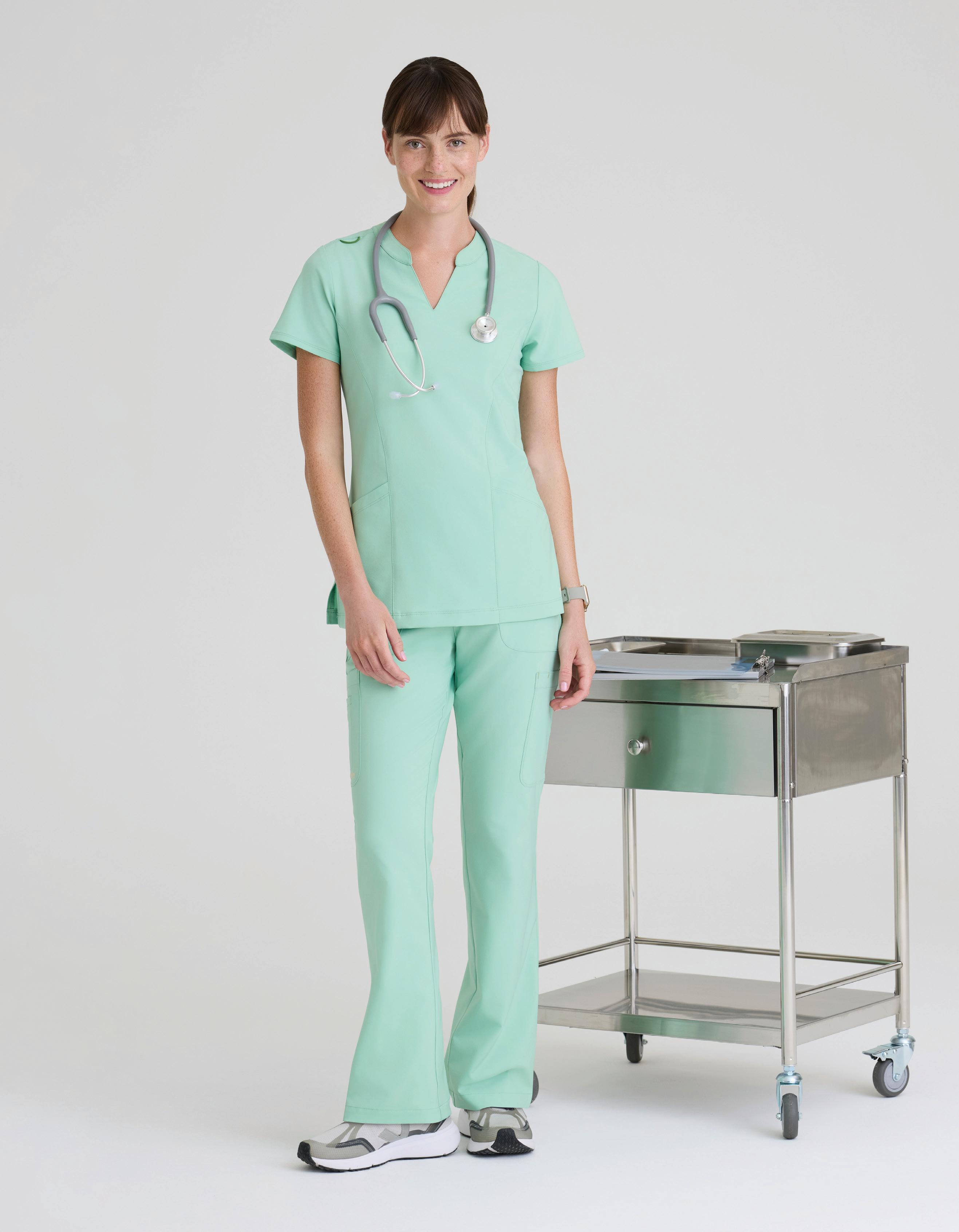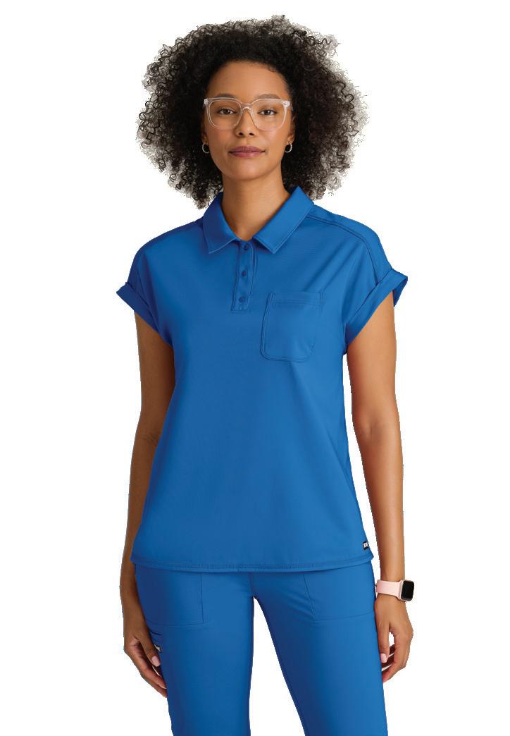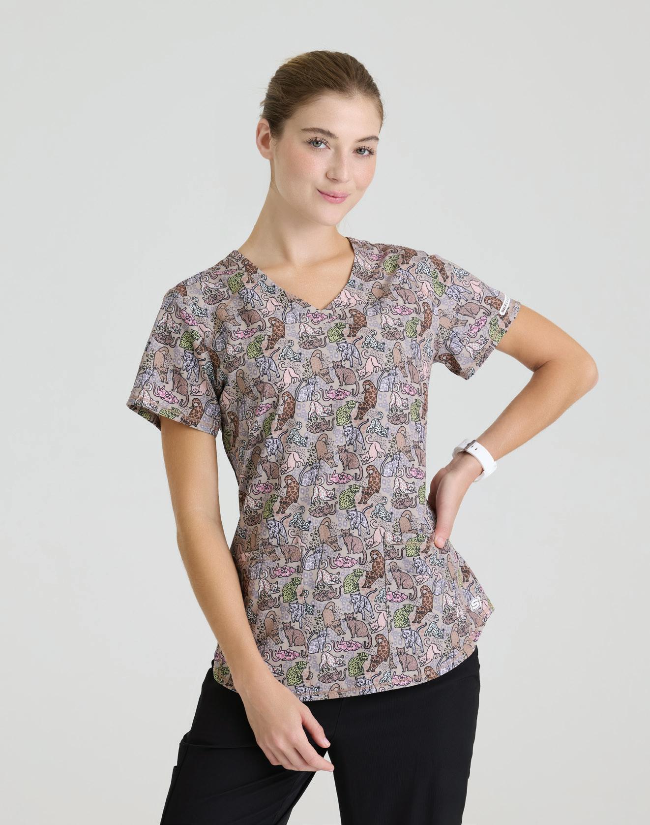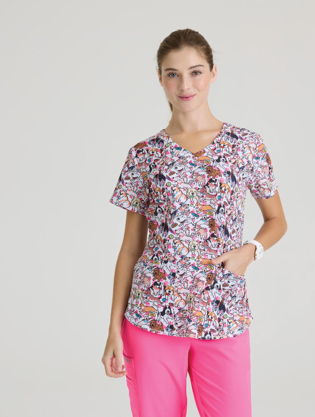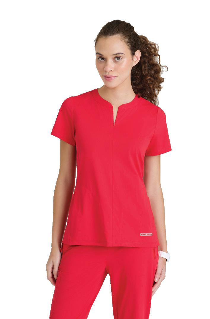 GRST045 Serena Top 3-pocket, ribbed V-neck, PDA pocket, logo tape side slit detail, rib knit back insets with princess seam, straight hem