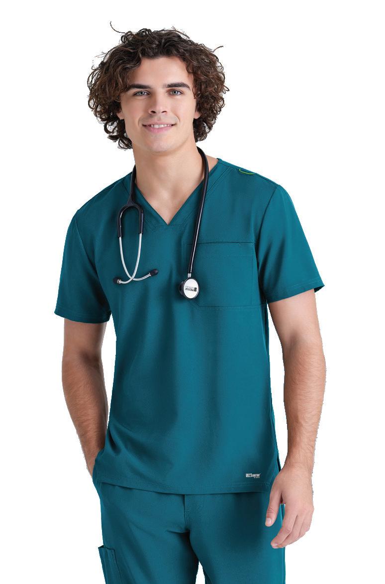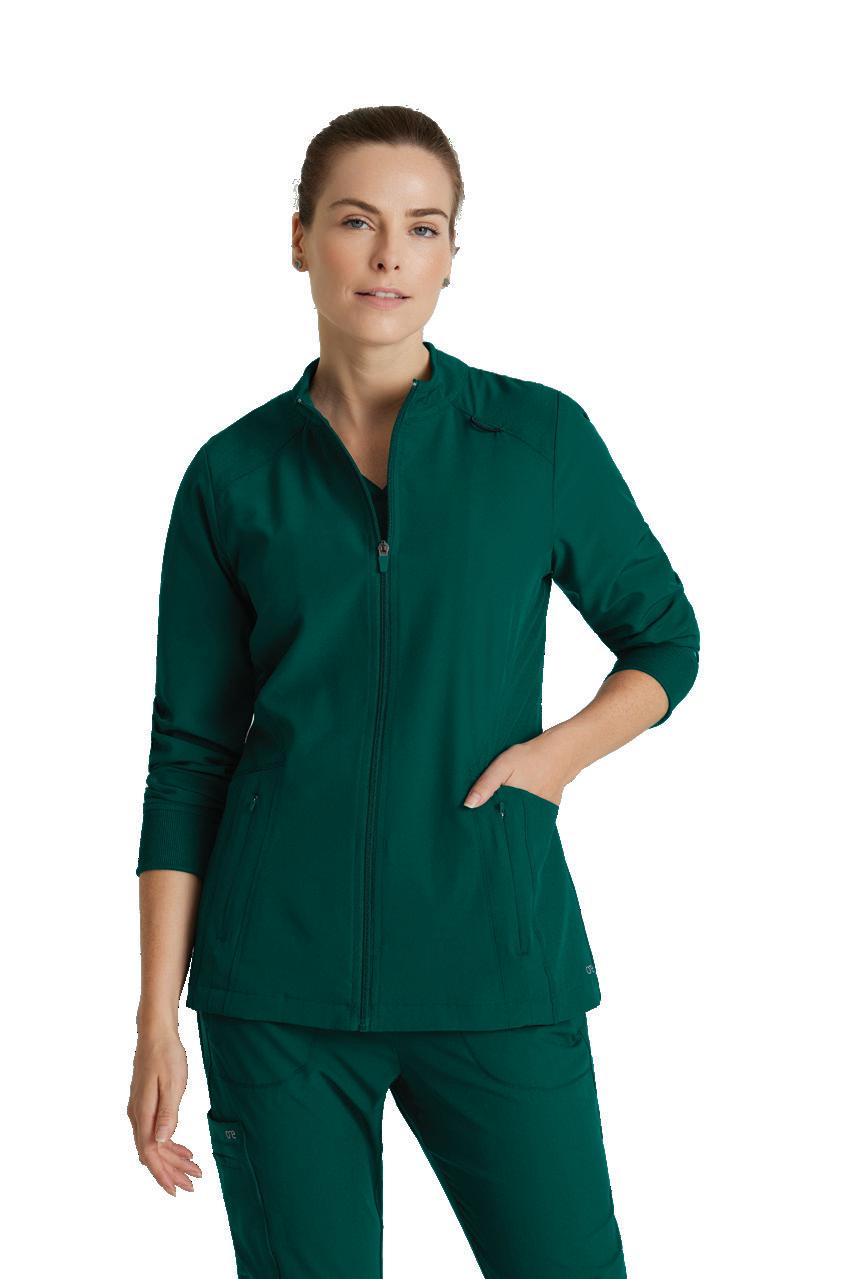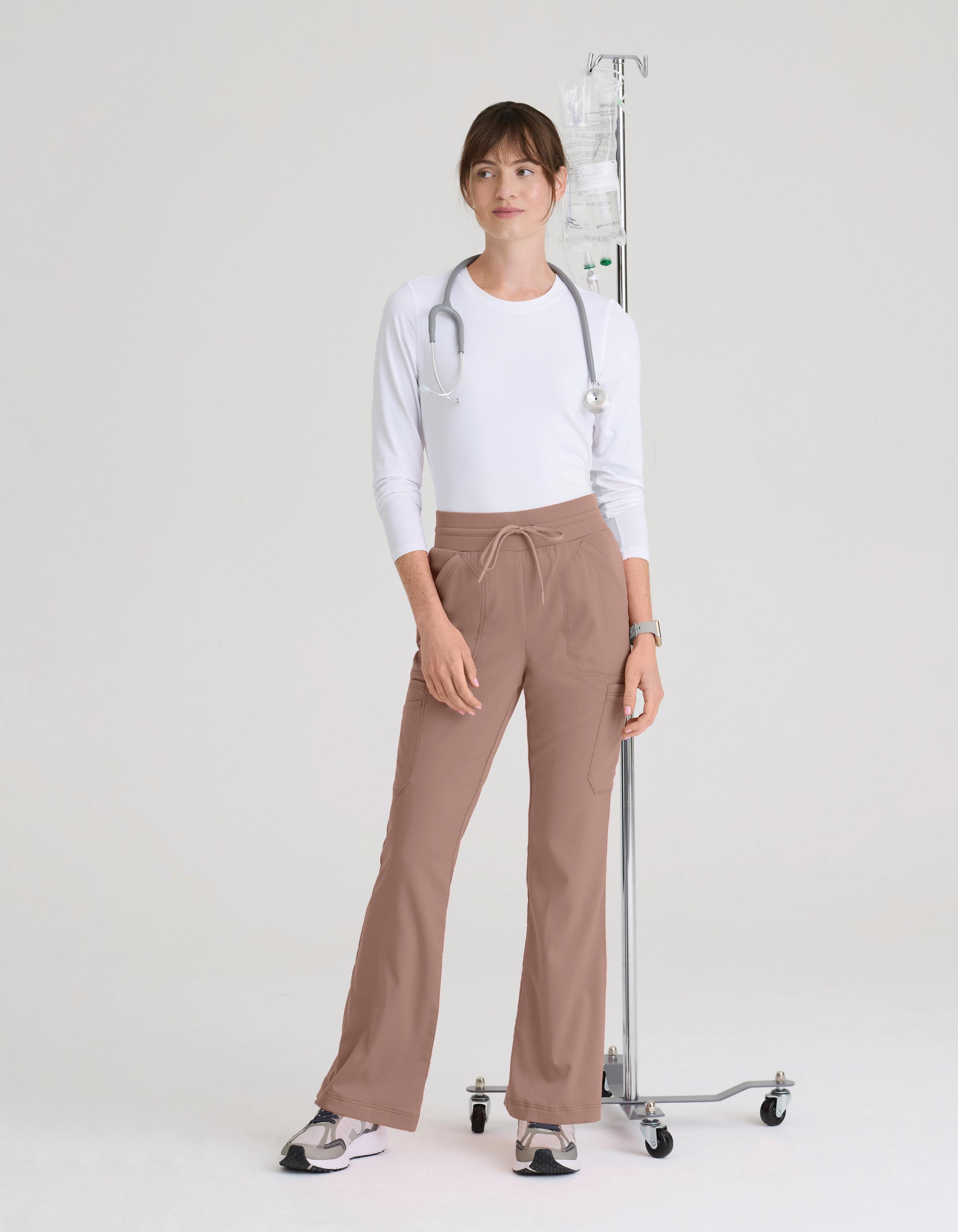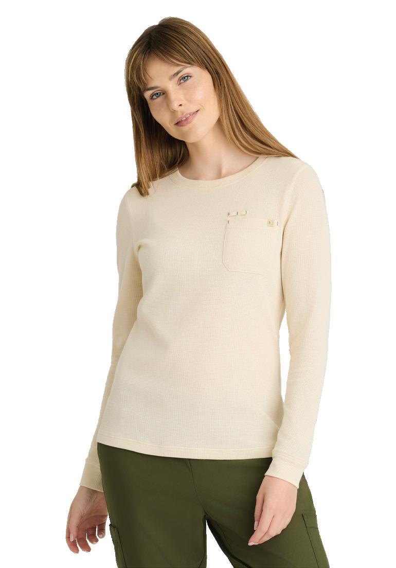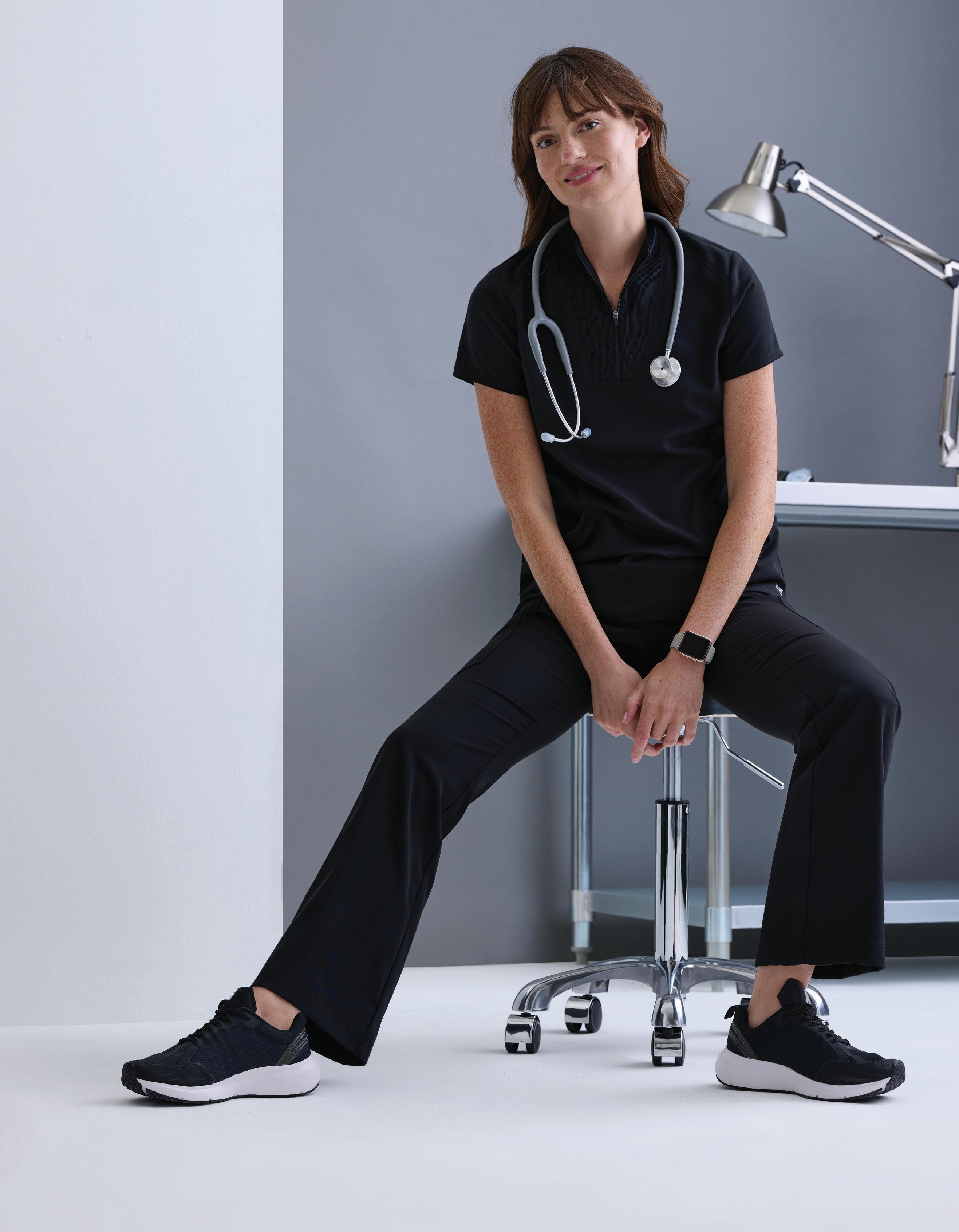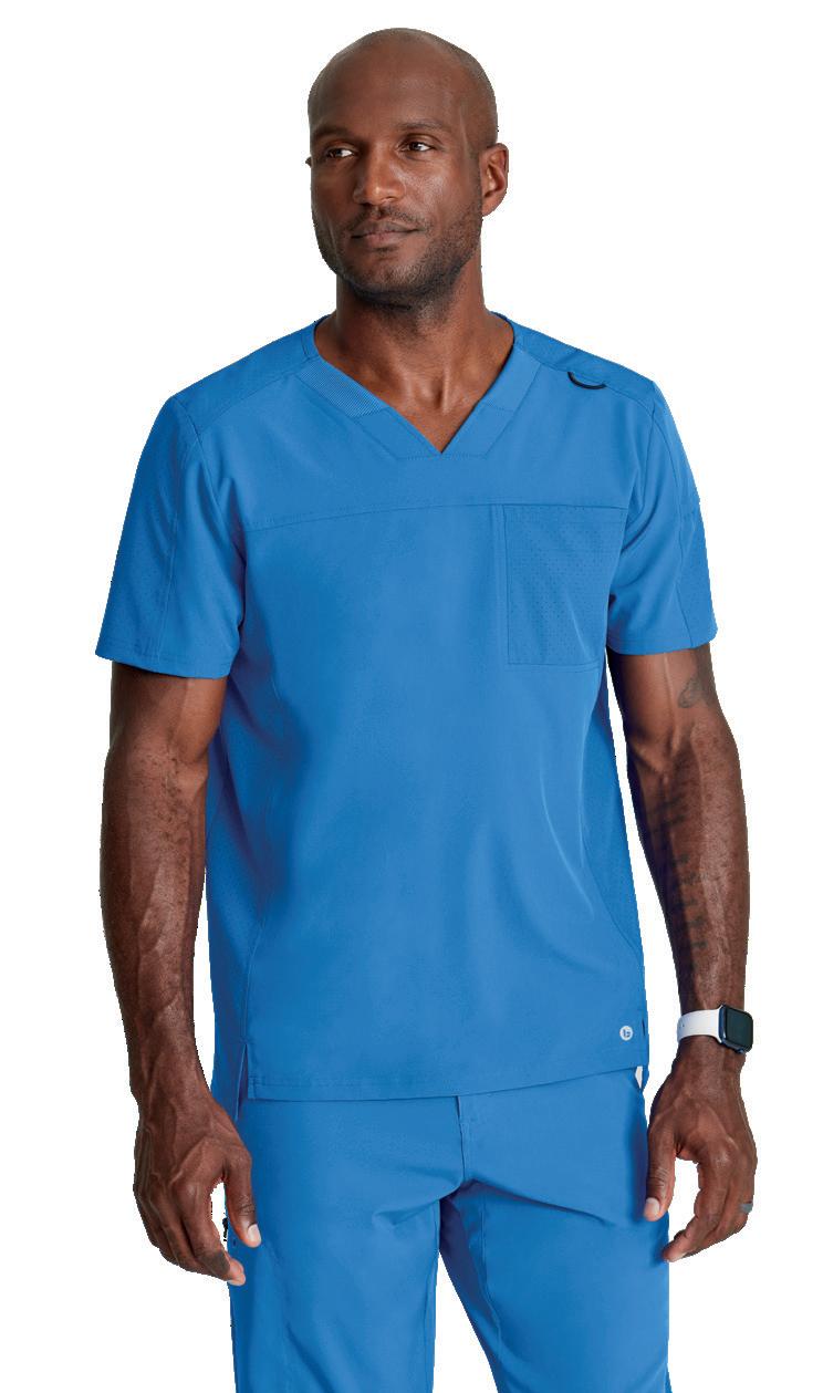 GRST045 Serena Top 3-pocket, ribbed V-neck, PDA pocket, logo tape side slit detail, rib knit back insets with princess seam, straight hem