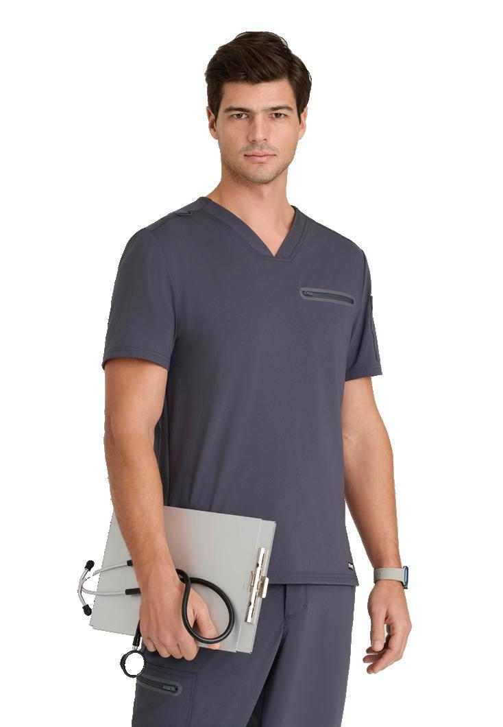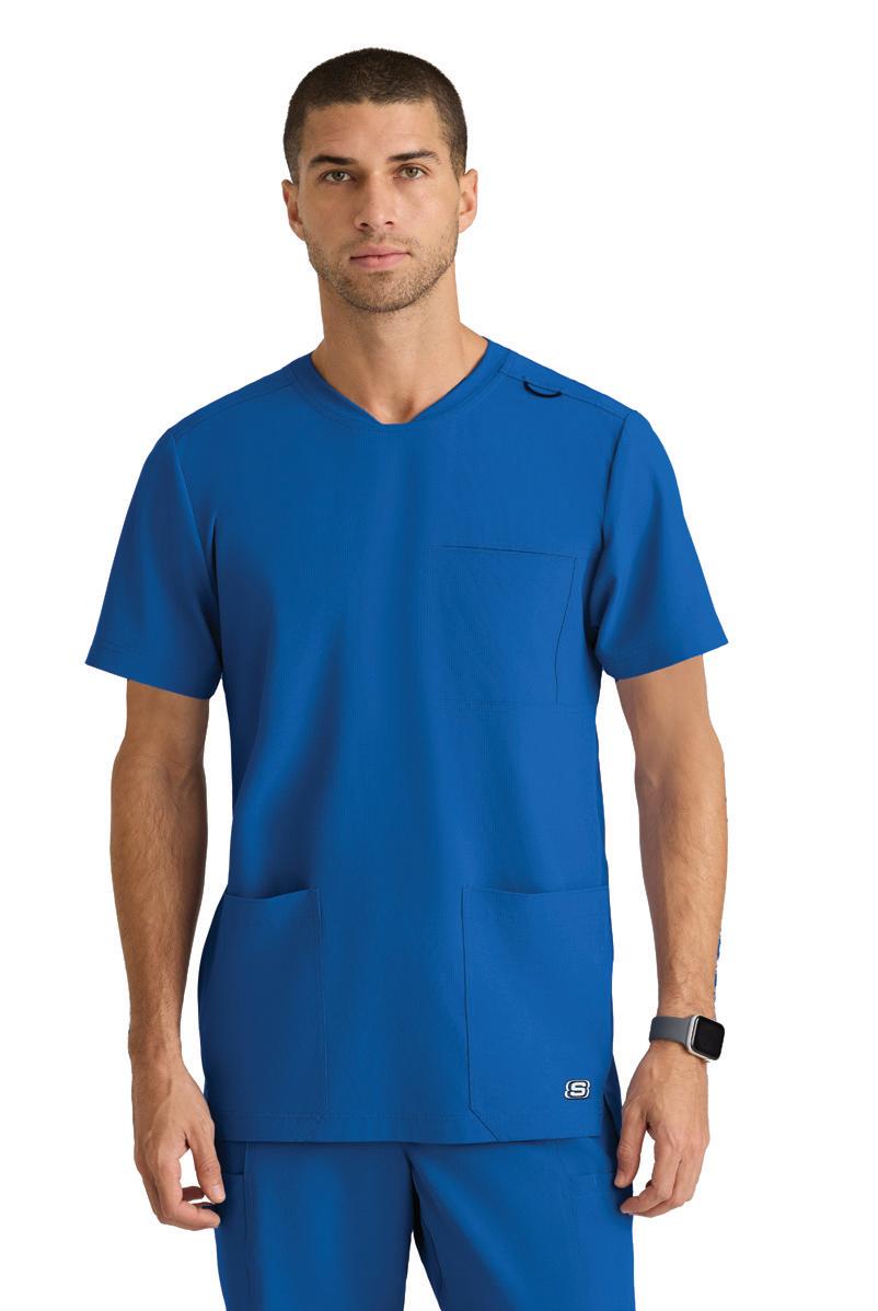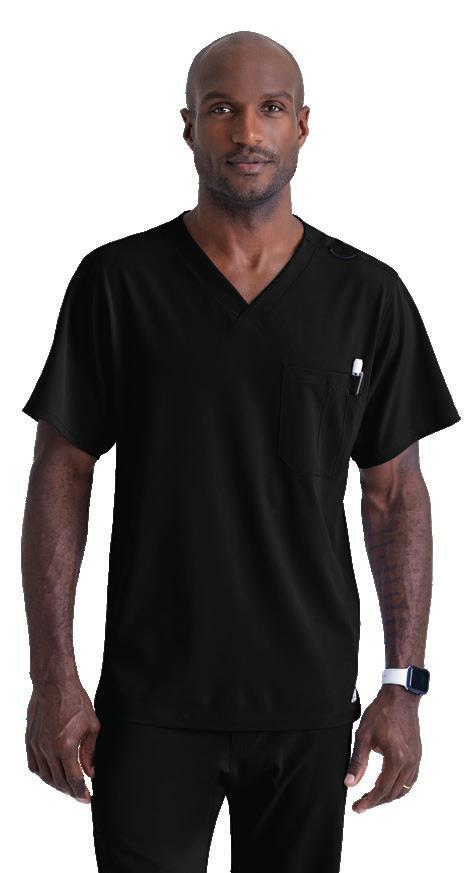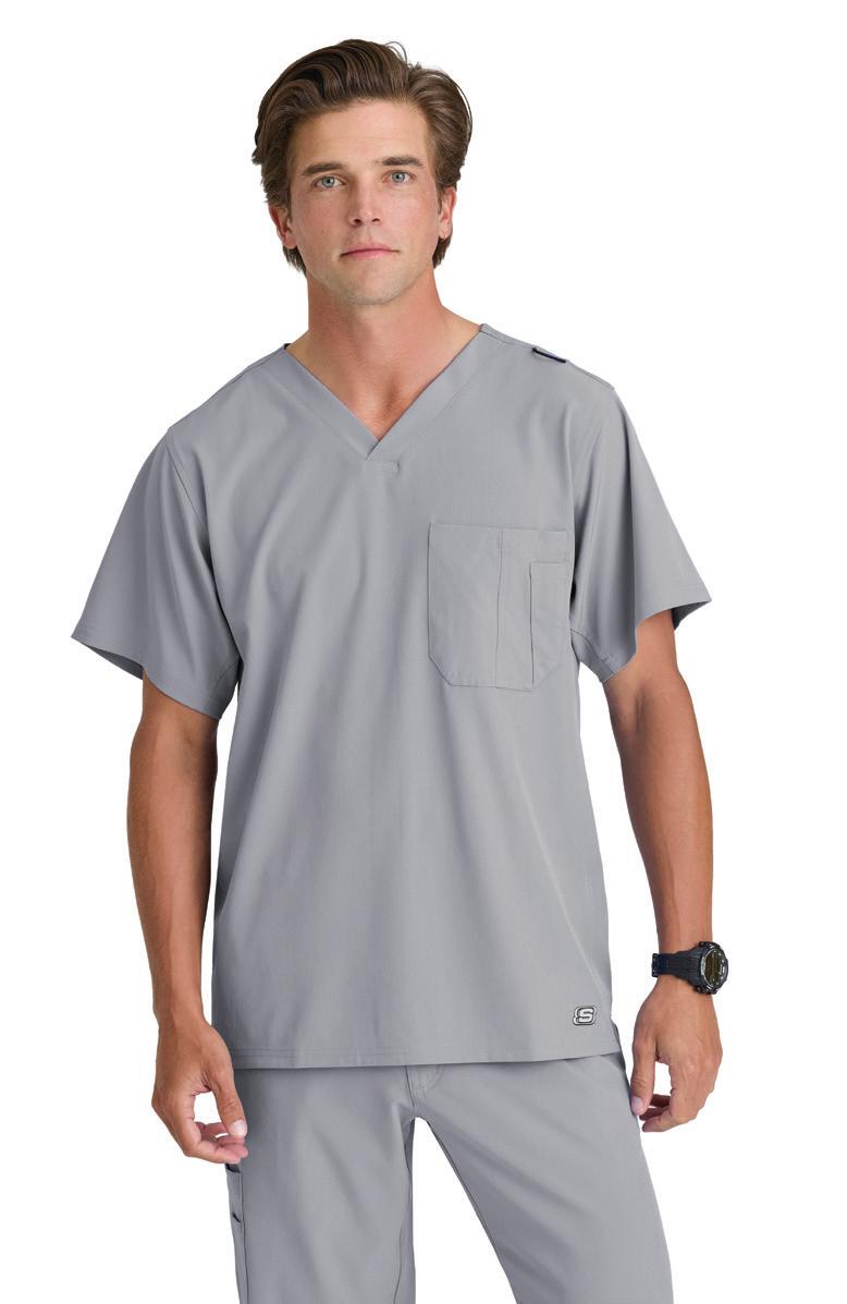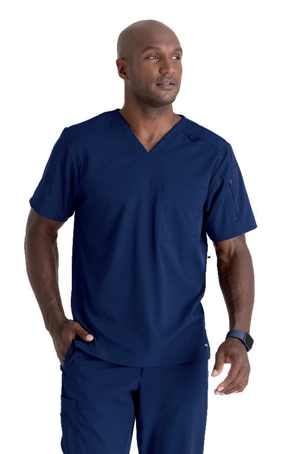 Men’s 2-pocket banded V-neck, right shoulder badge loop, framed zipper chest pocket, left sleeve patch pocket, notched high-low hem top