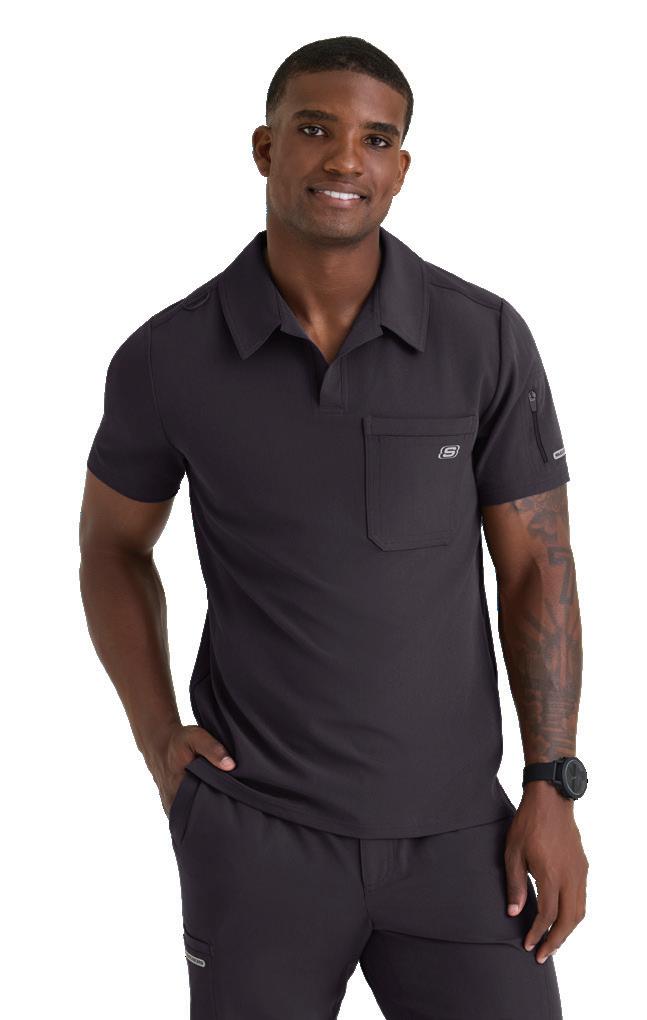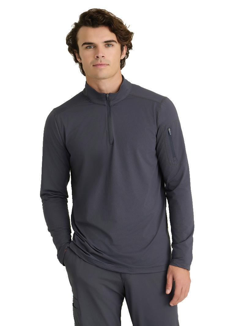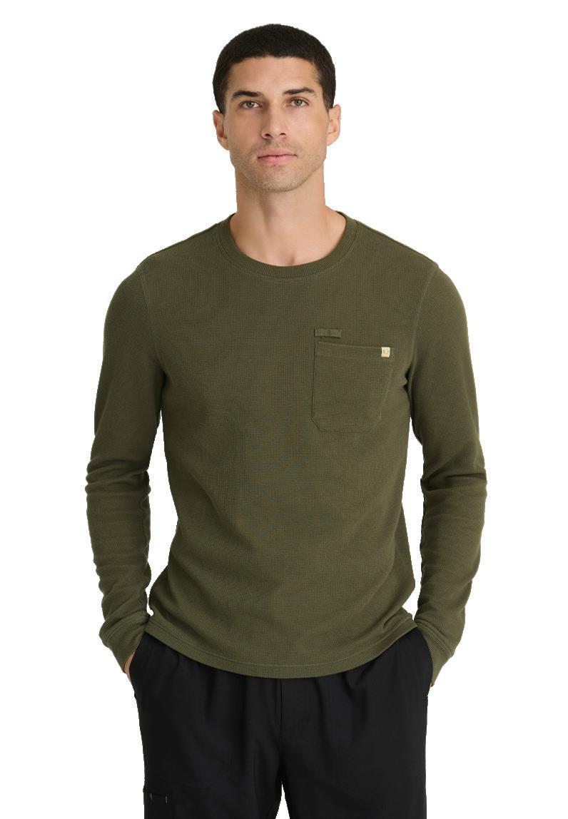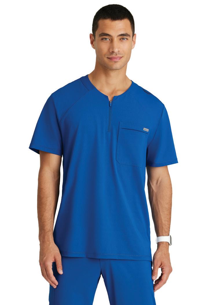Men’s 2-pocket banded V-neck, right shoulder badge loop, framed zipper chest pocket, left sleeve patch pocket, notched high-low hem top
