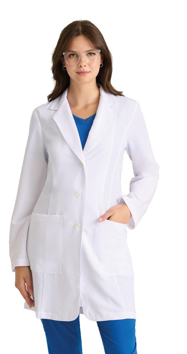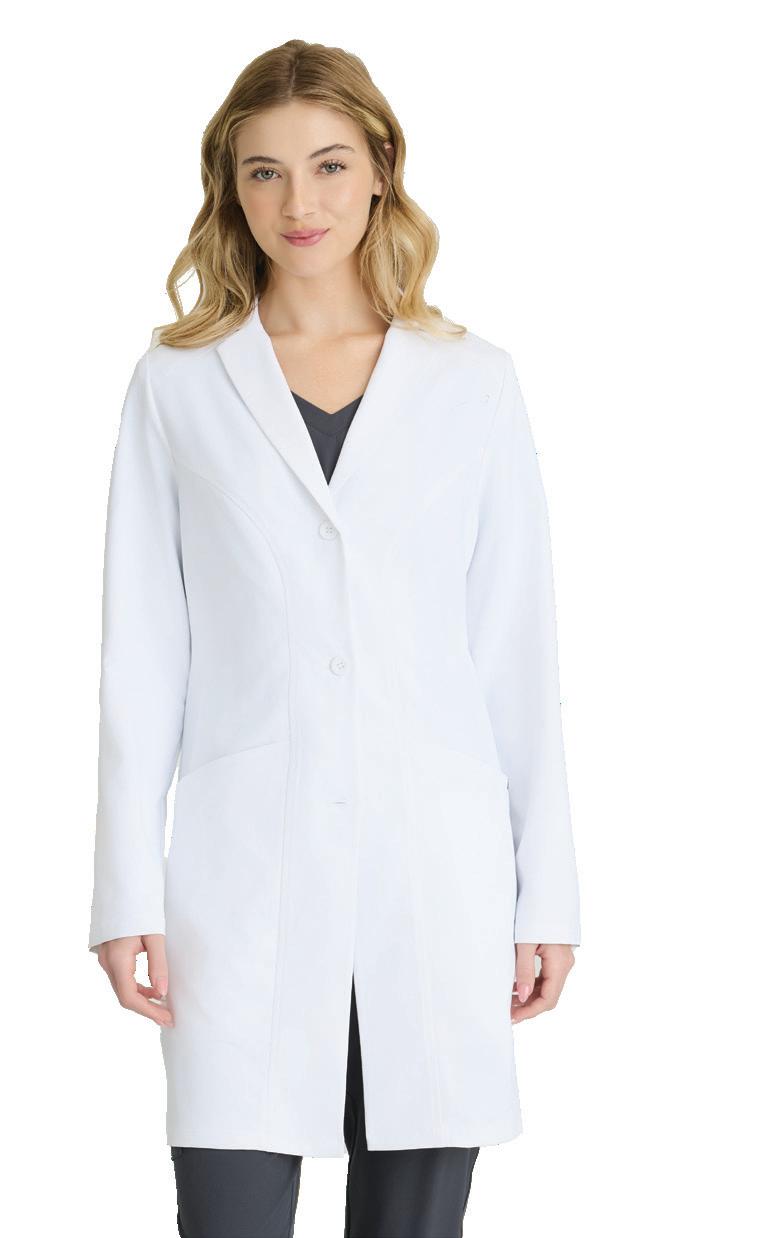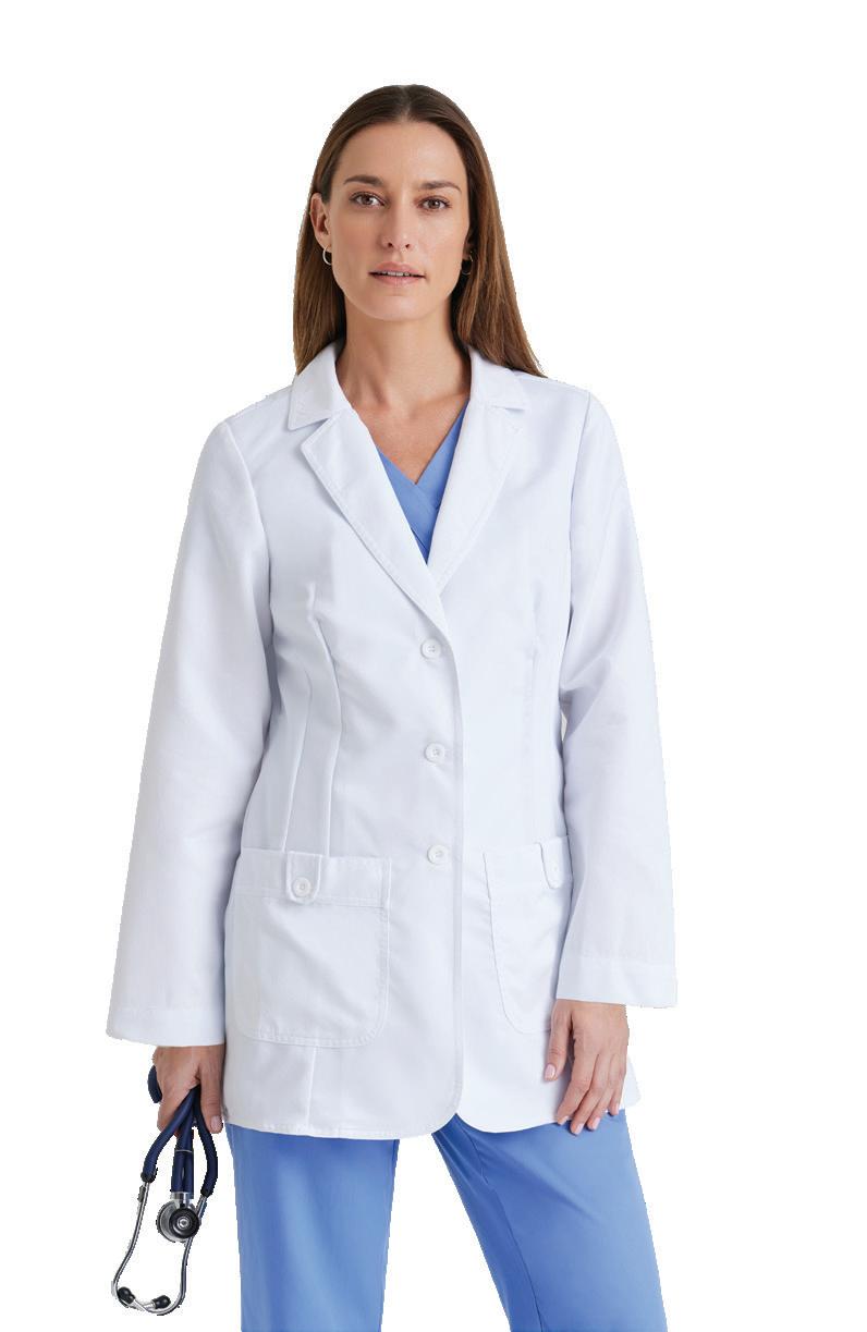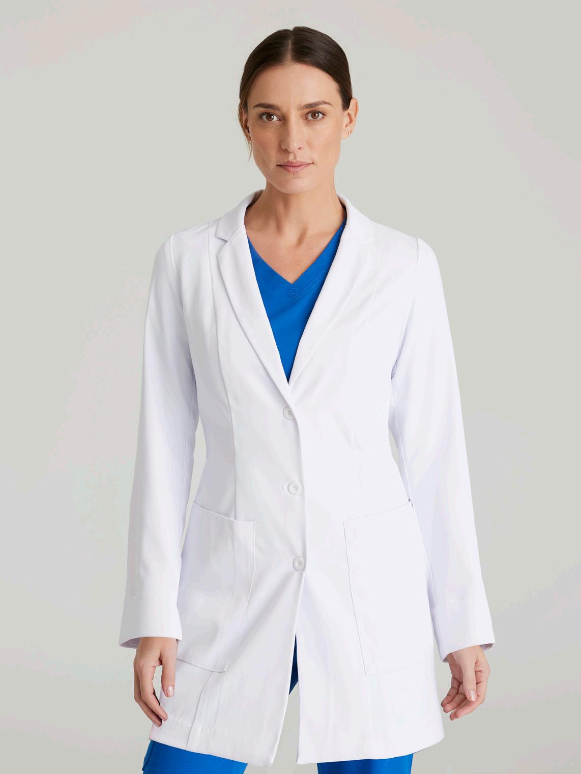 Women’s 4-pocket long sleeve lab coat, notch lapel, angled front yoke with on-seam pocket and pen slots, half-circle front princess seams with curved on-seam tablet friendly pockets, and back princess seams with vents. SEMI-FITTED