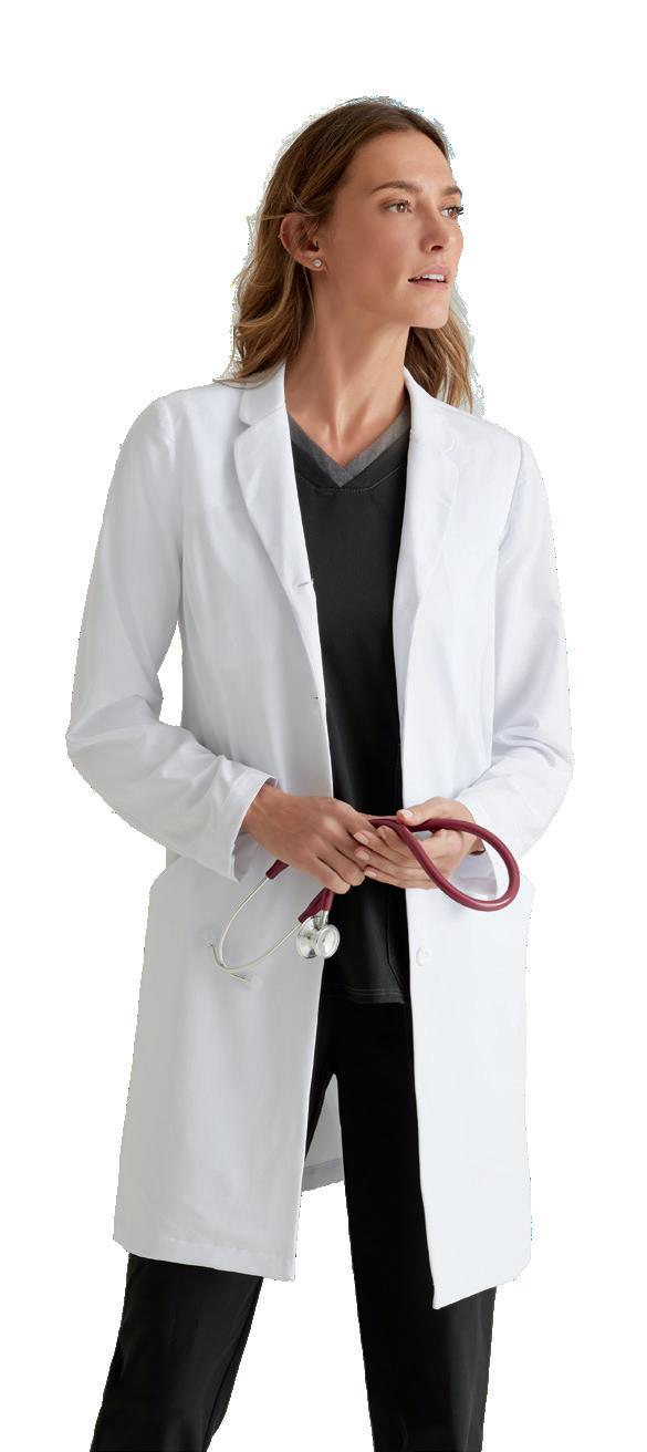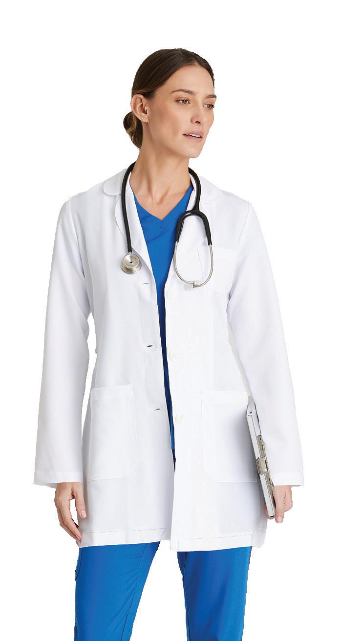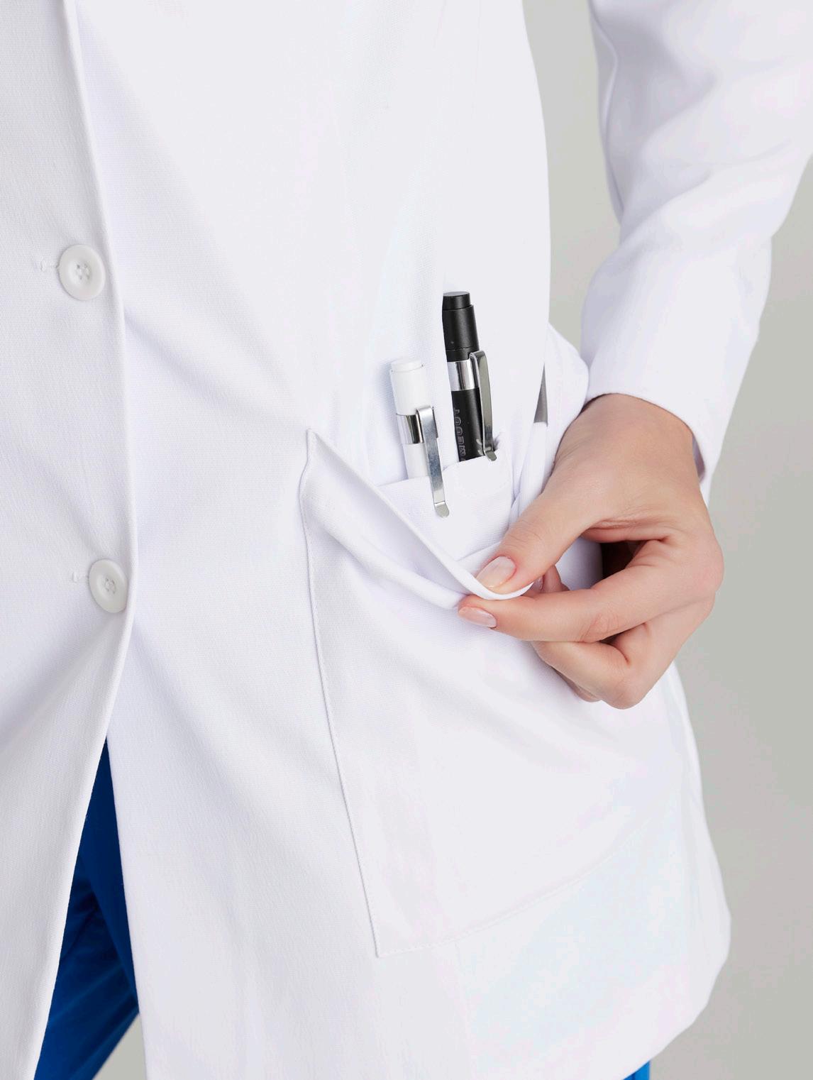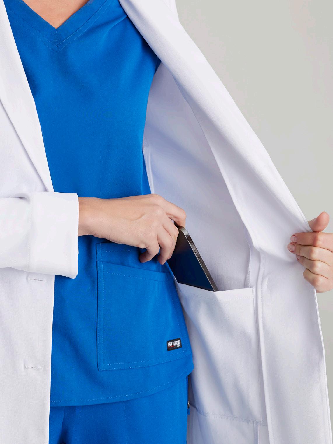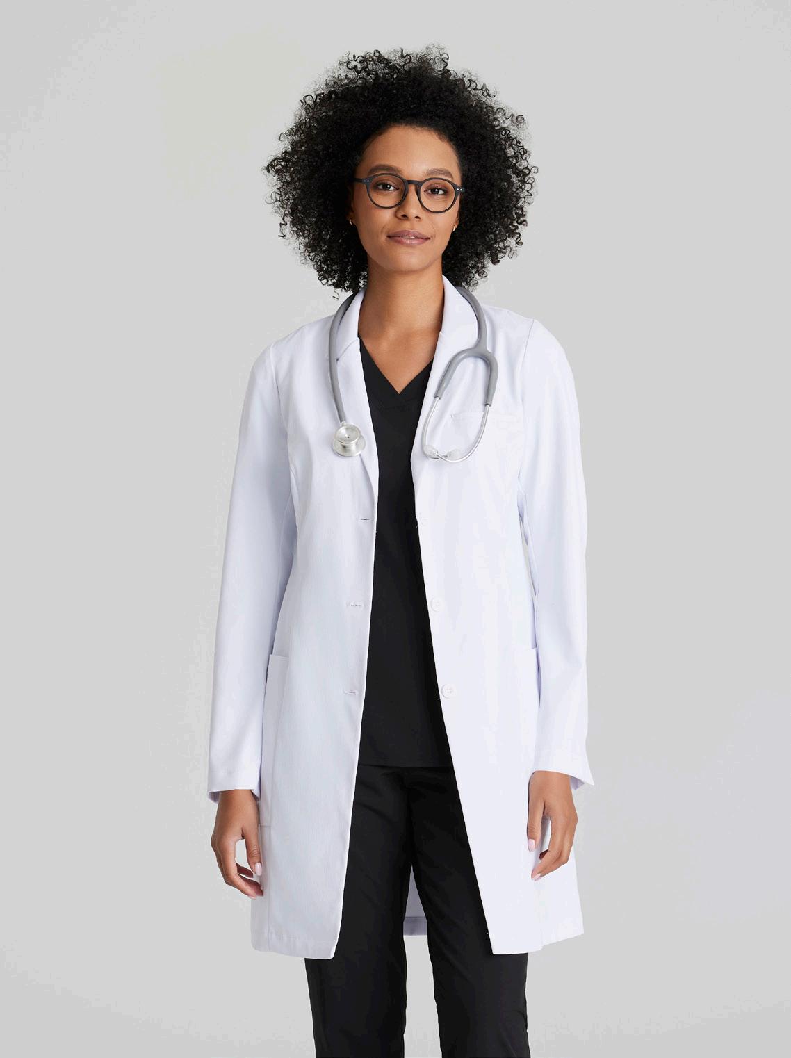 Women’s 4-pocket long sleeve lab coat, notch lapel, angled front yoke with on-seam pocket and pen slots, half-circle front princess seams with curved on-seam tablet friendly pockets, and back princess seams with vents. SEMI-FITTED