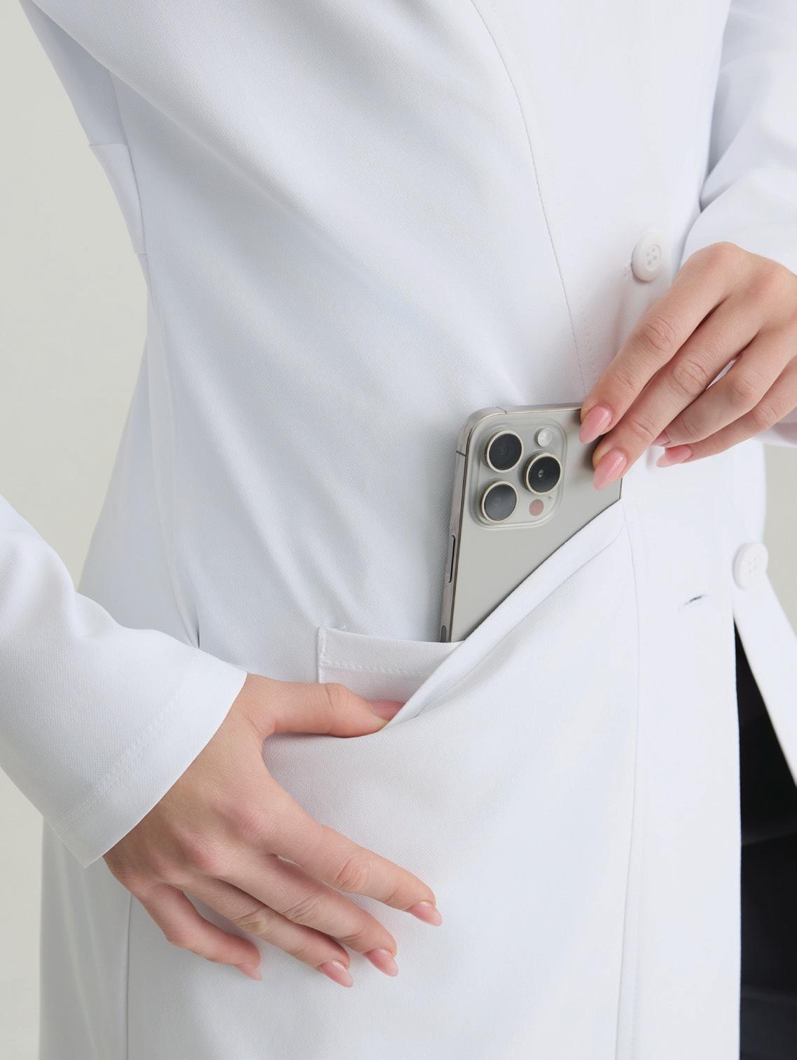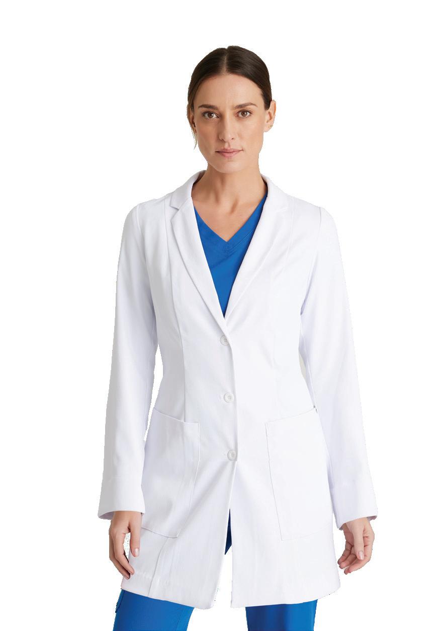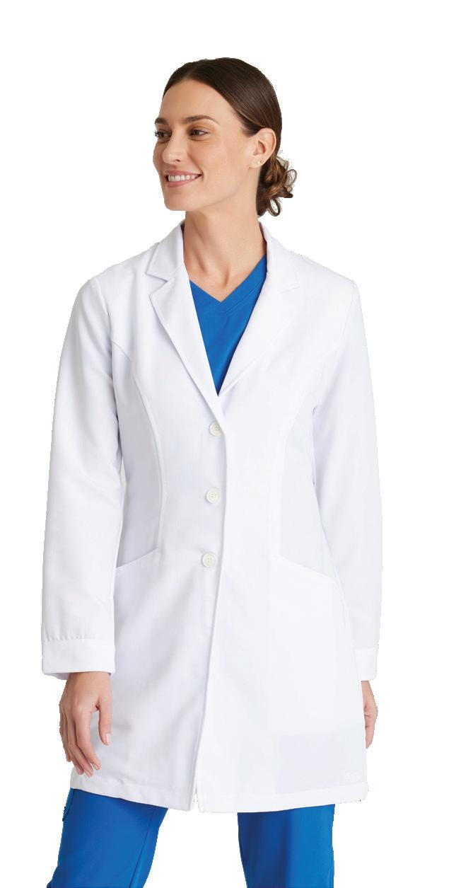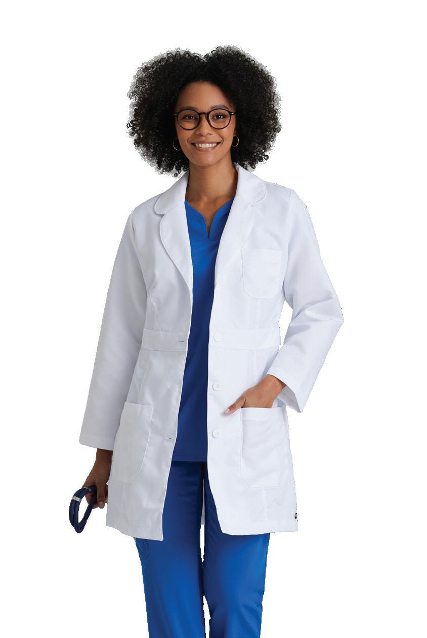 Women’s 4-pocket long sleeve lab coat, notch lapel, angled front yoke with on-seam pocket and pen slots, half-circle front princess seams with curved on-seam tablet friendly pockets, and back princess seams with vents. SEMI-FITTED