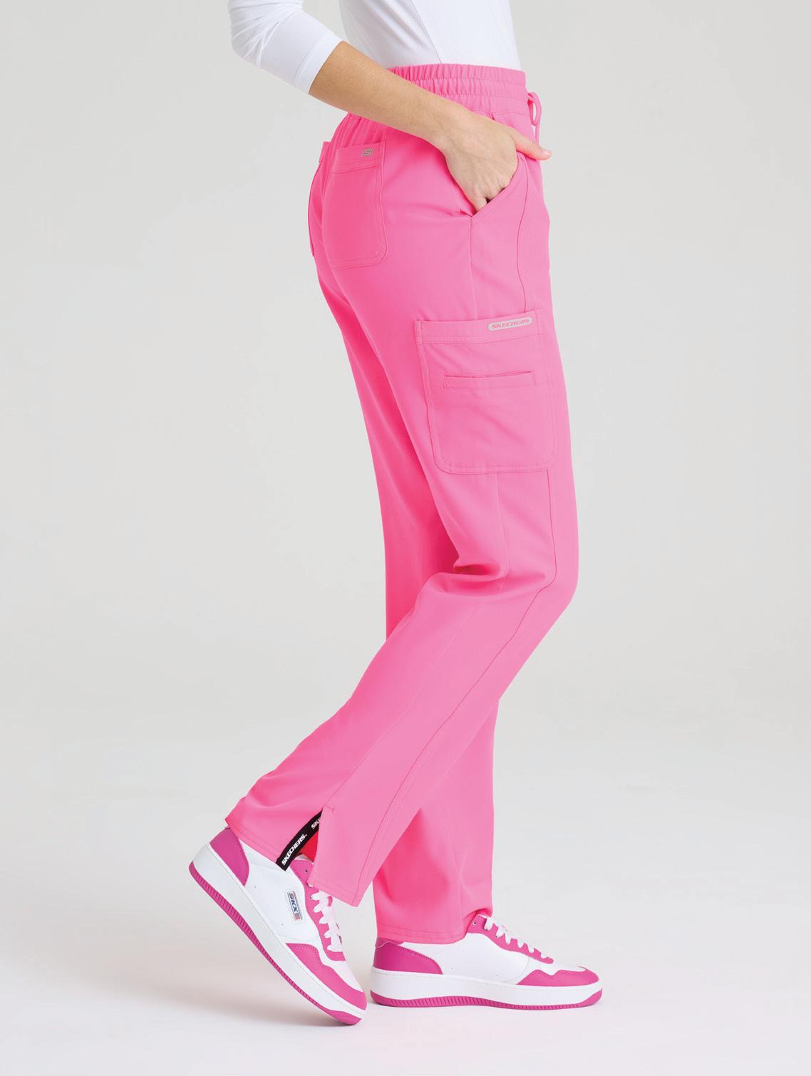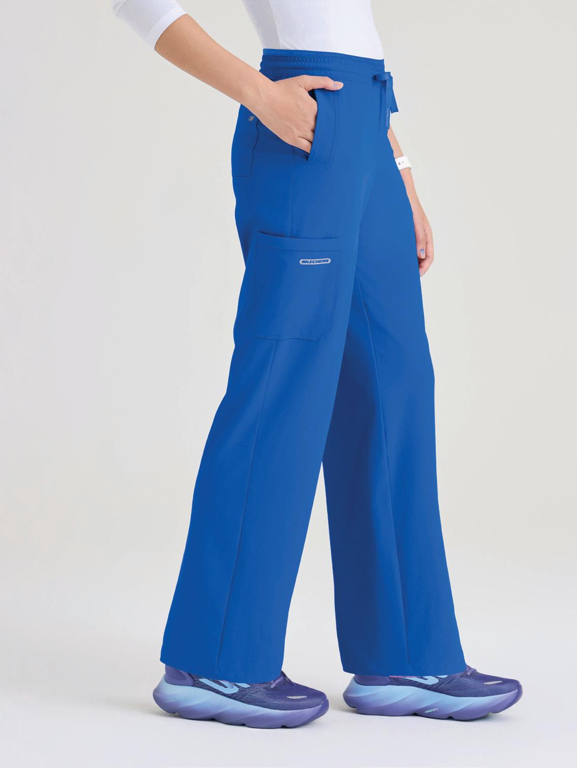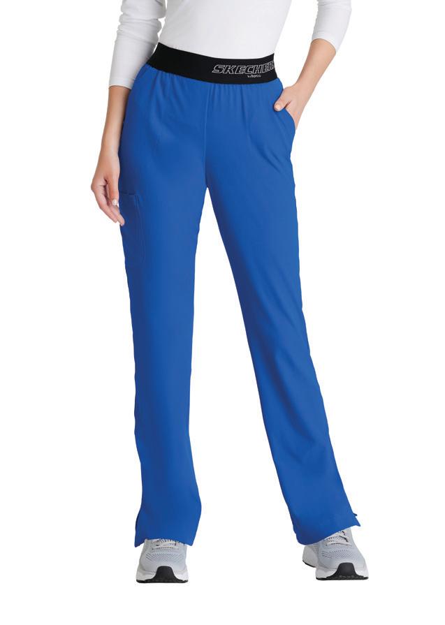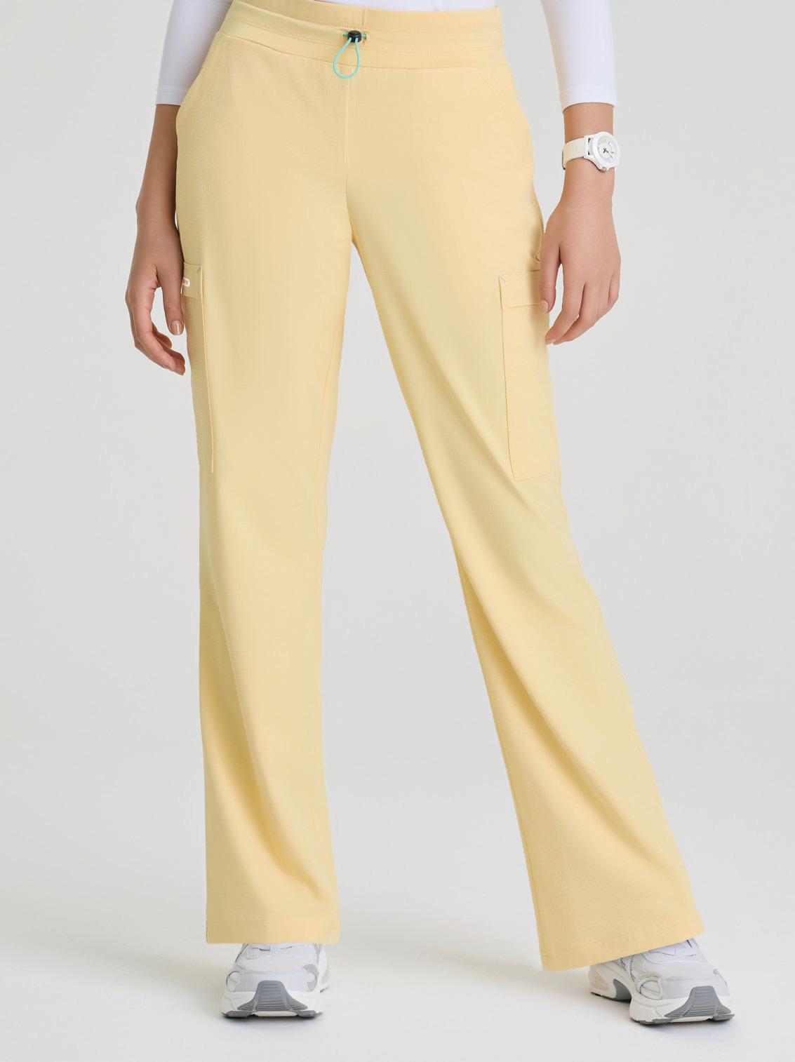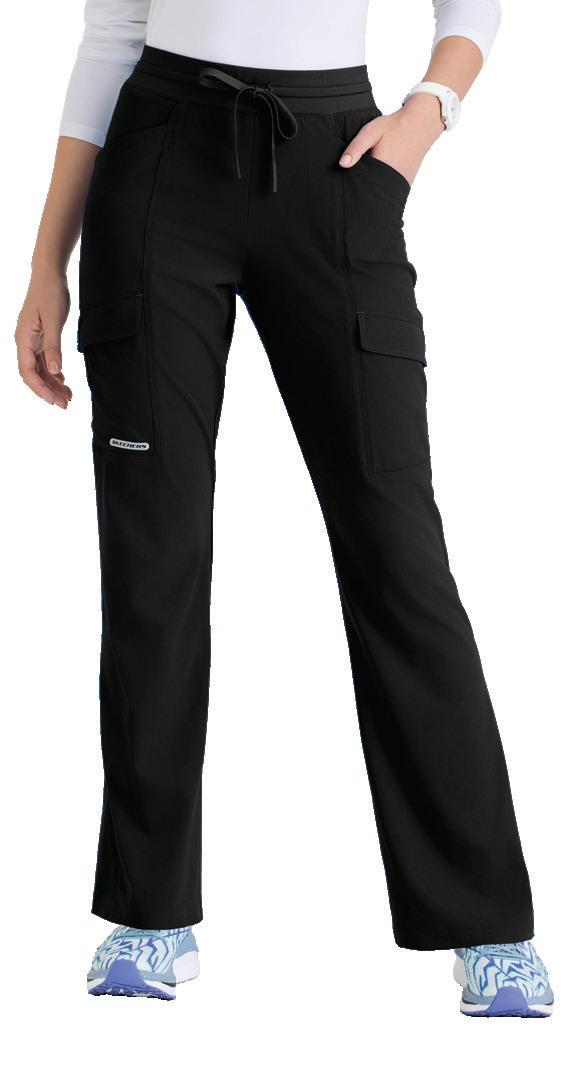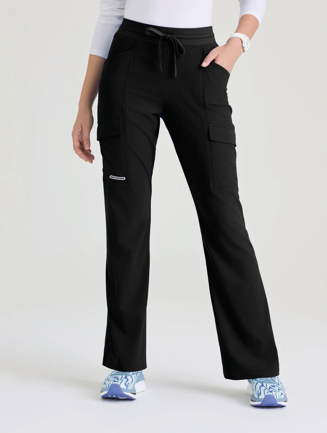 7-pocket, duchess knit waistband with drawcord, mid-rise, patch pockets, double cargo, slit hem, logo tape detail tapered leg