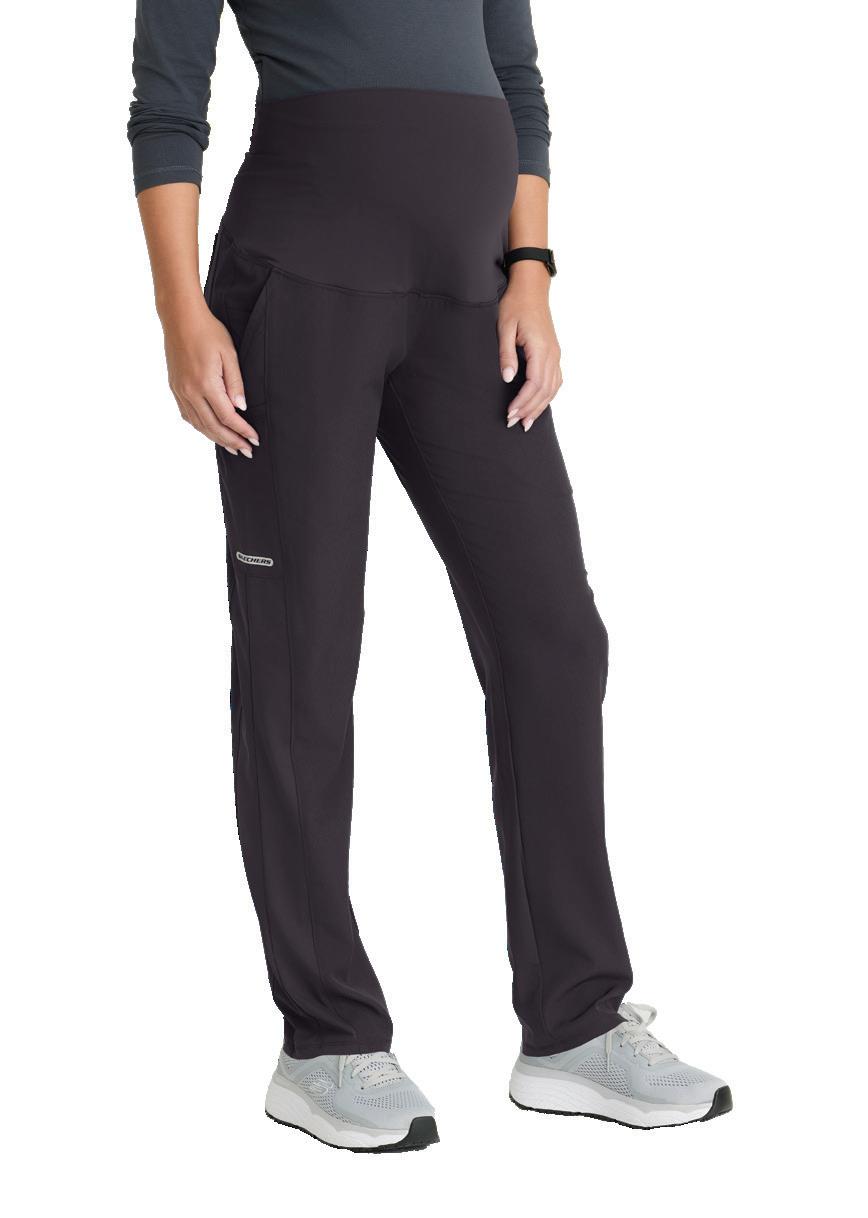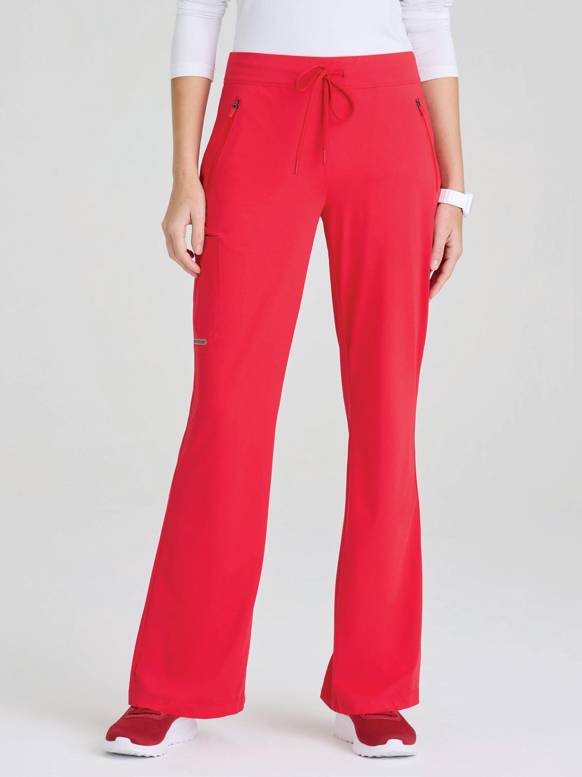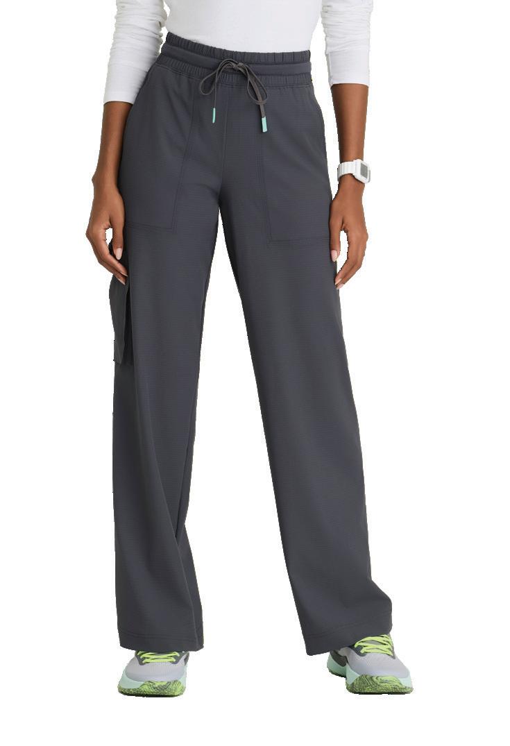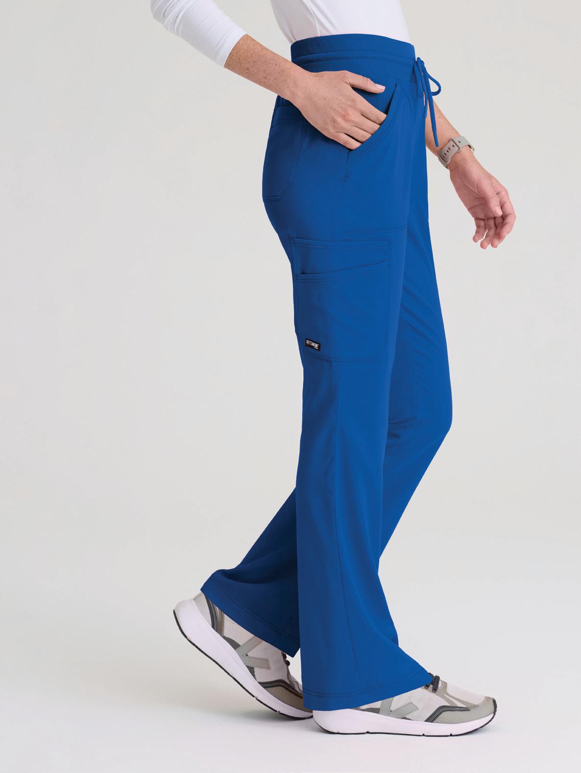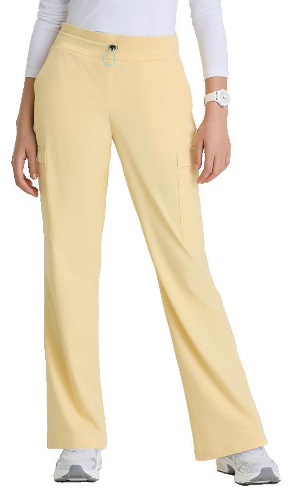 7-pocket, duchess knit waistband with drawcord, mid-rise, patch pockets, double cargo, slit hem, logo tape detail tapered leg