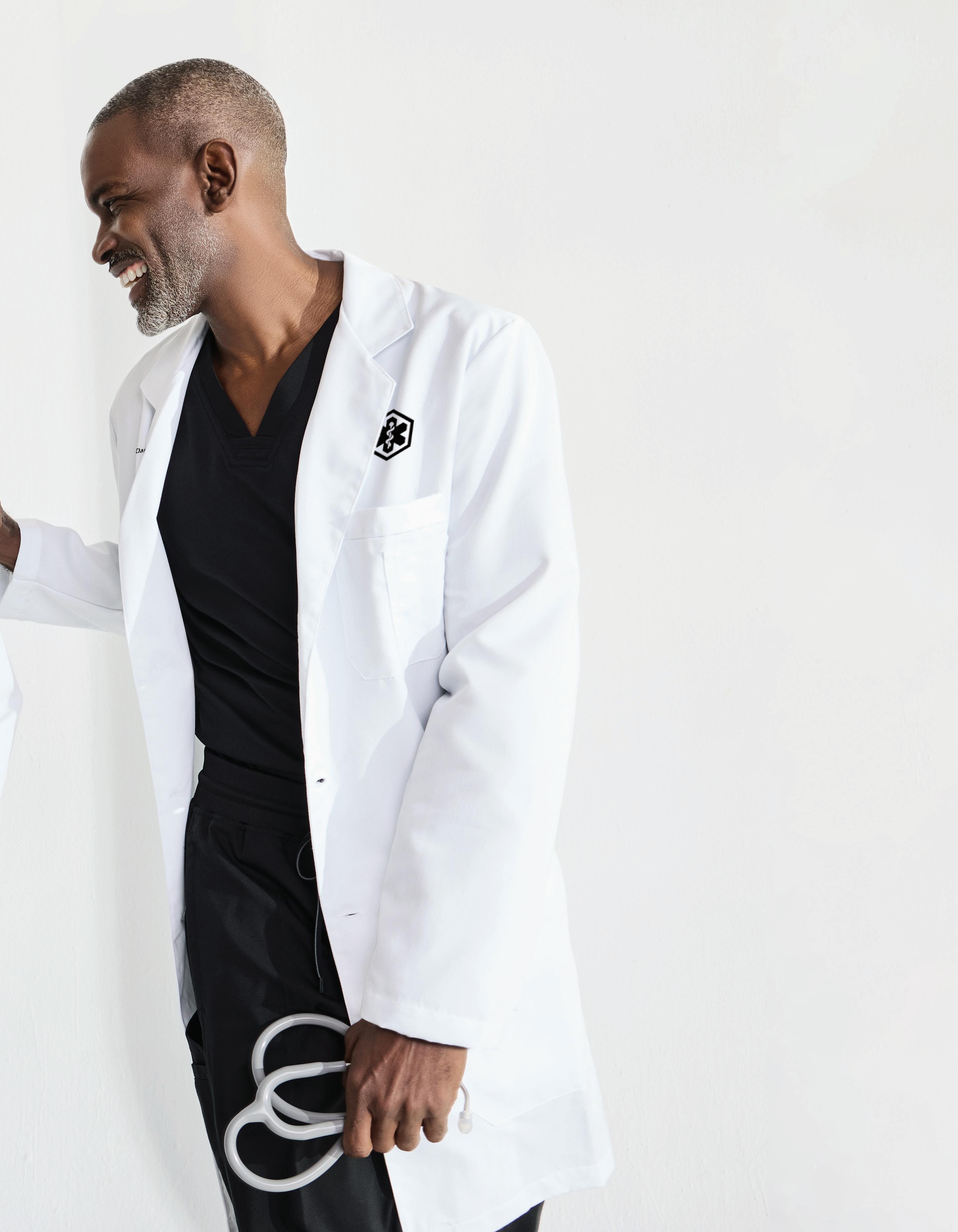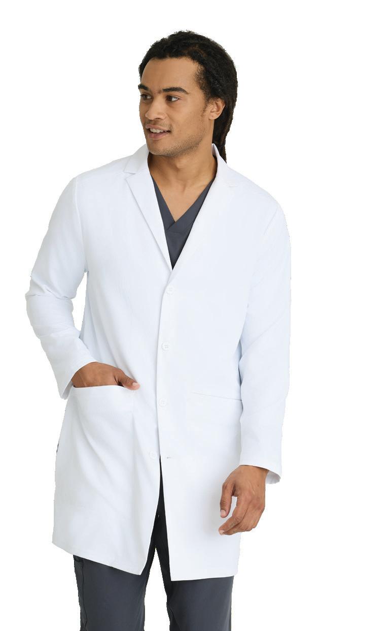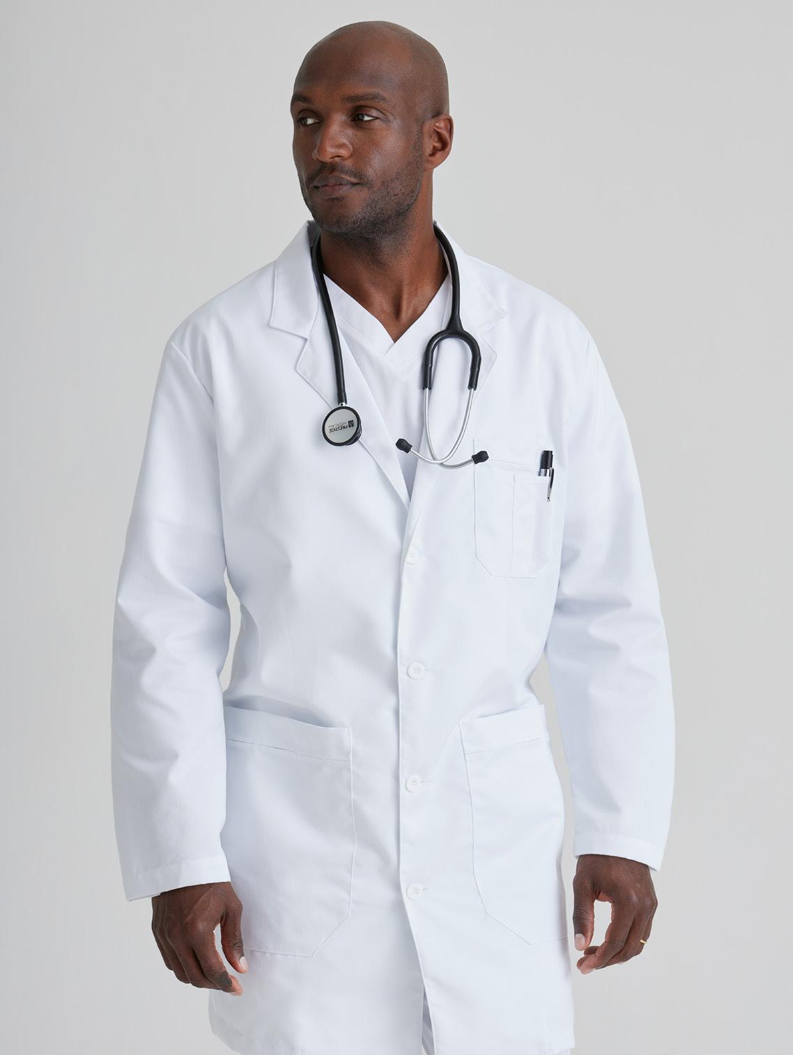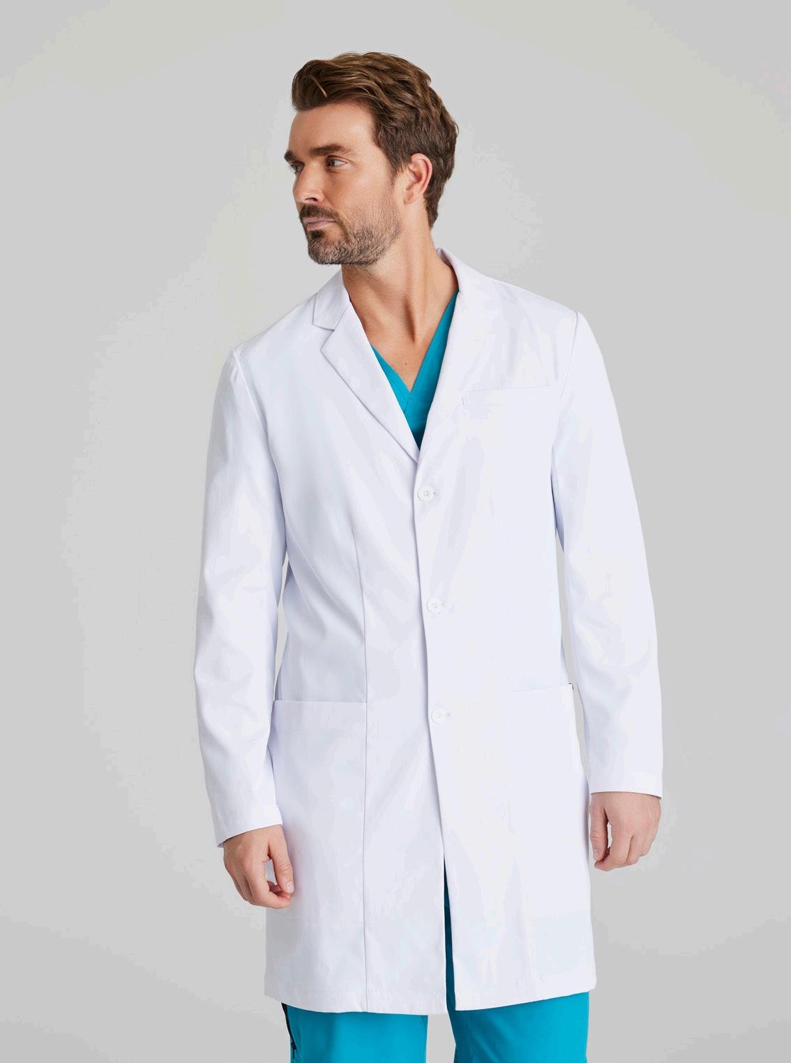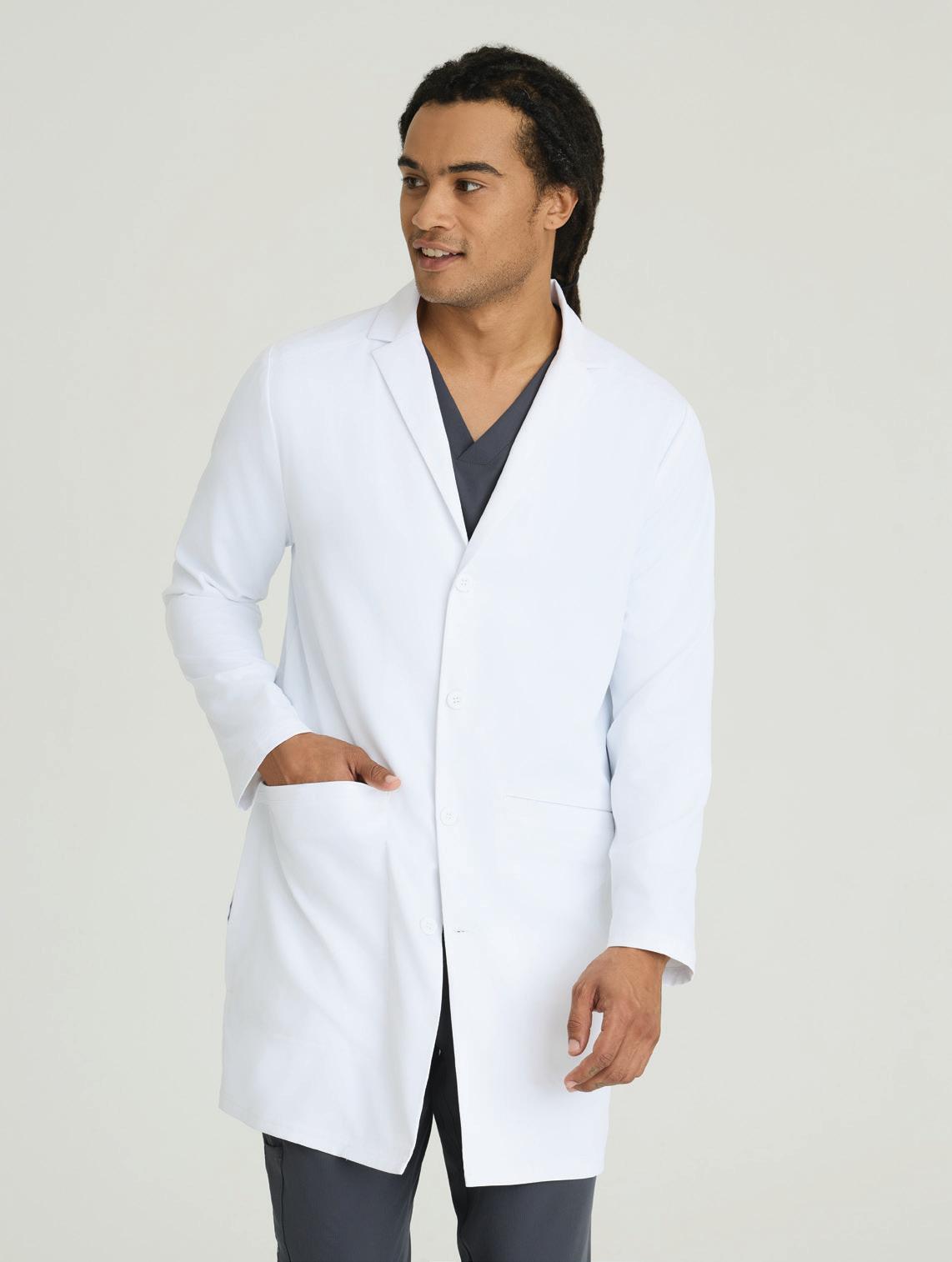 Men’s 6-pocket long sleeve notch lapel lab coat, welt chest pocket, tablet pocket, angled front body seams with top-entry waist pockets, 2 waist welt pockets, tablet pockets, angled back yoke seam, extended vent opening at the side seams, and vented sleeve opening with 2-button closure. RELAXED FIT