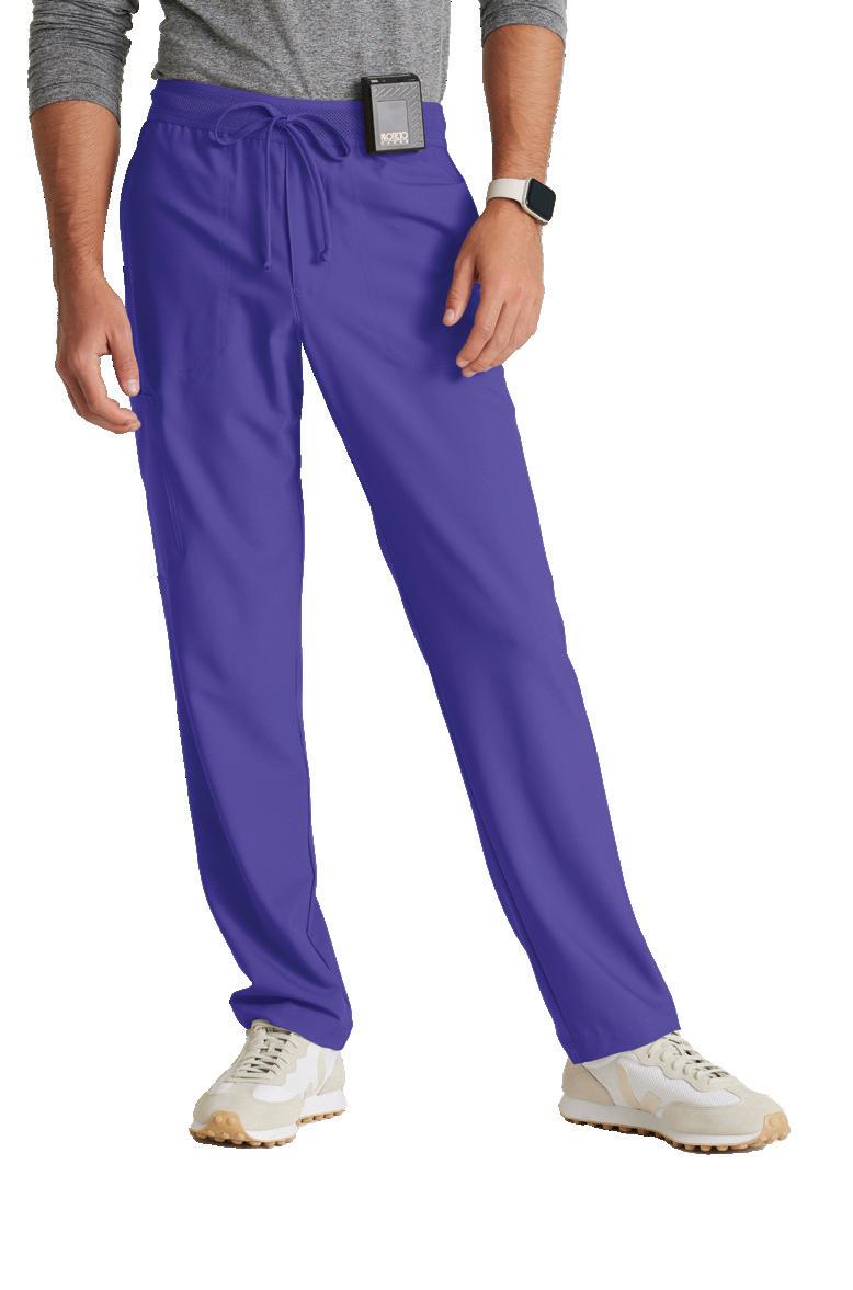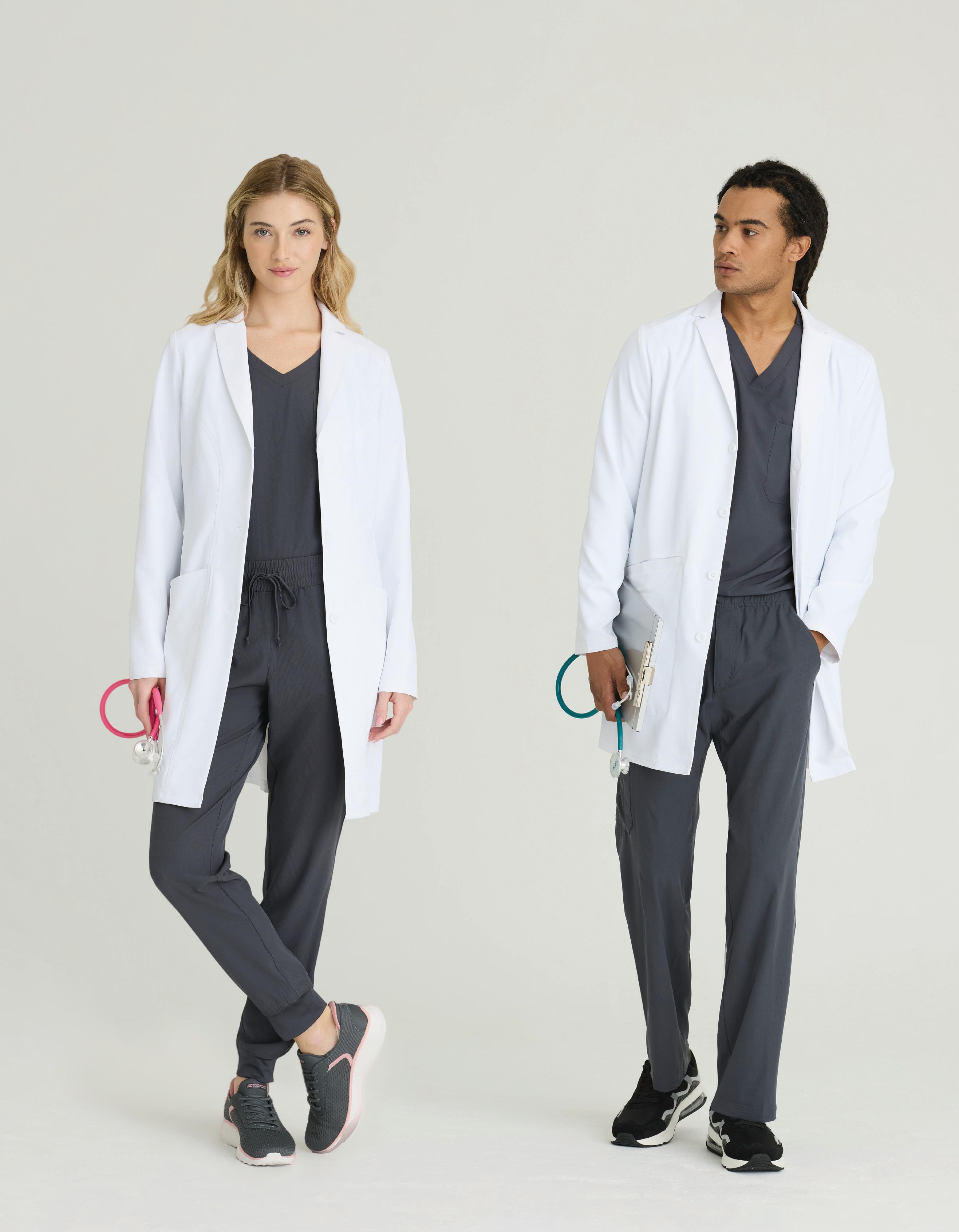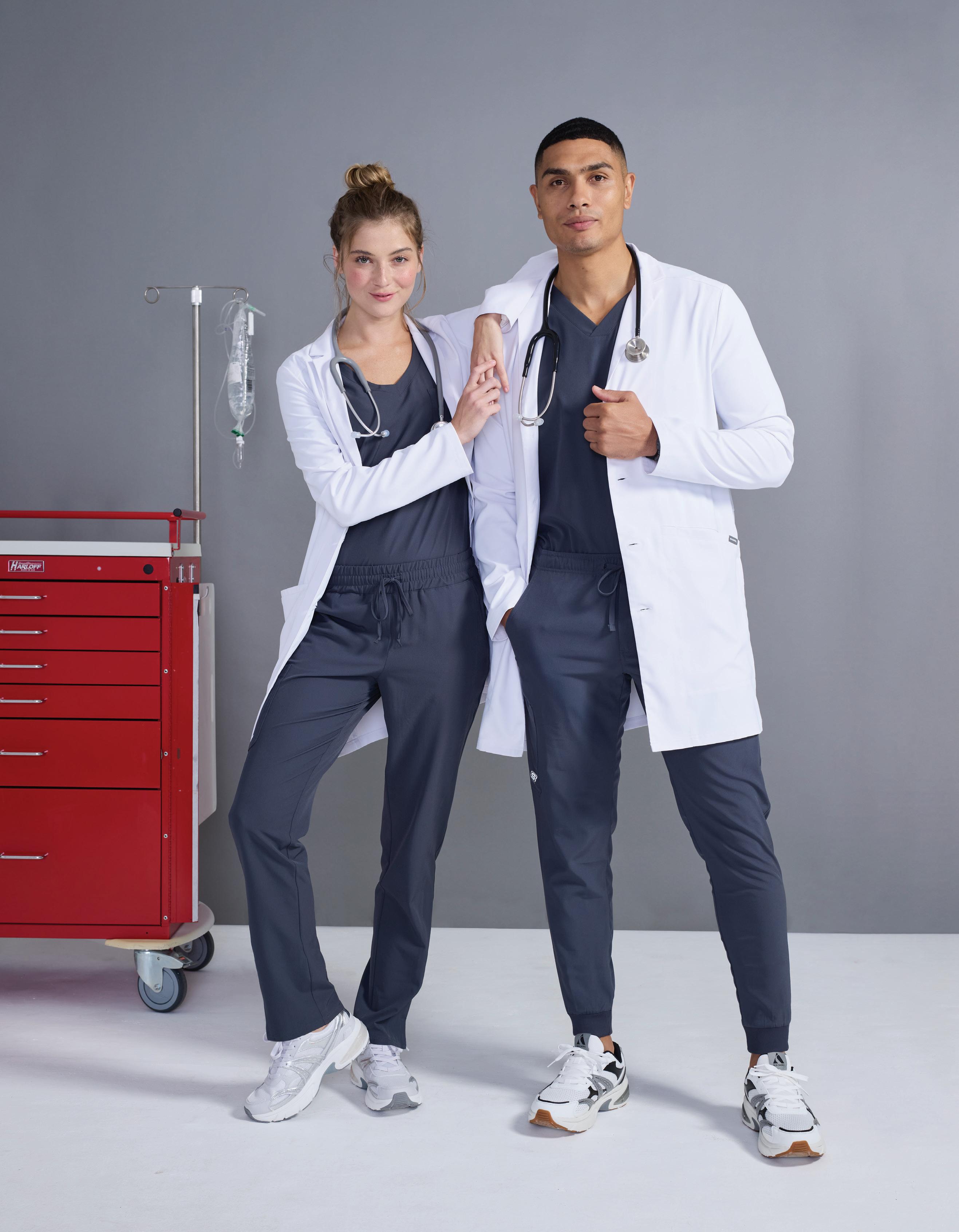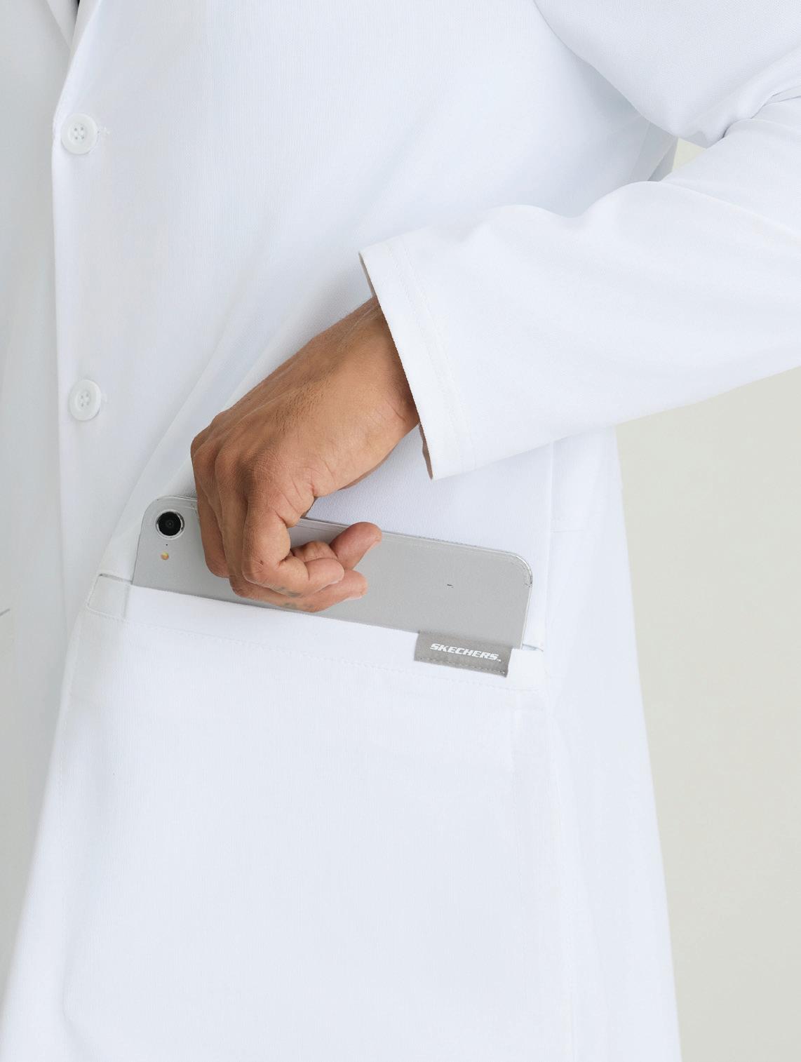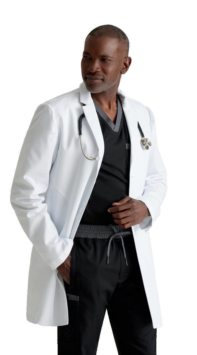 Men’s 6-pocket long sleeve notch lapel lab coat, welt chest pocket, tablet pocket, angled front body seams with top-entry waist pockets, 2 waist welt pockets, tablet pockets, angled back yoke seam, extended vent opening at the side seams, and vented sleeve opening with 2-button closure. RELAXED FIT