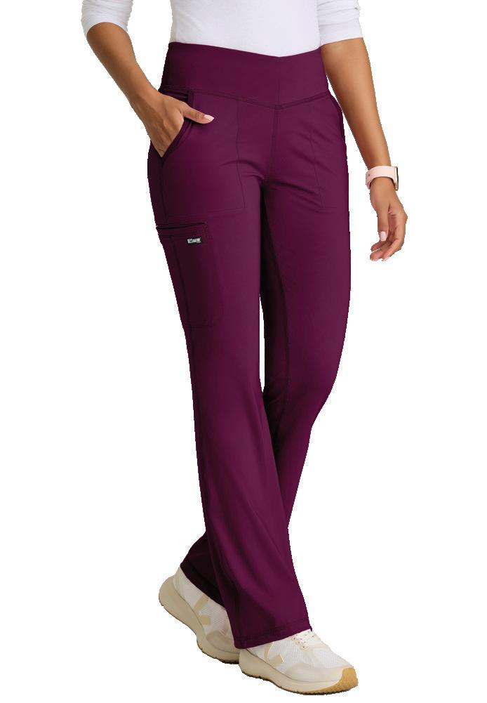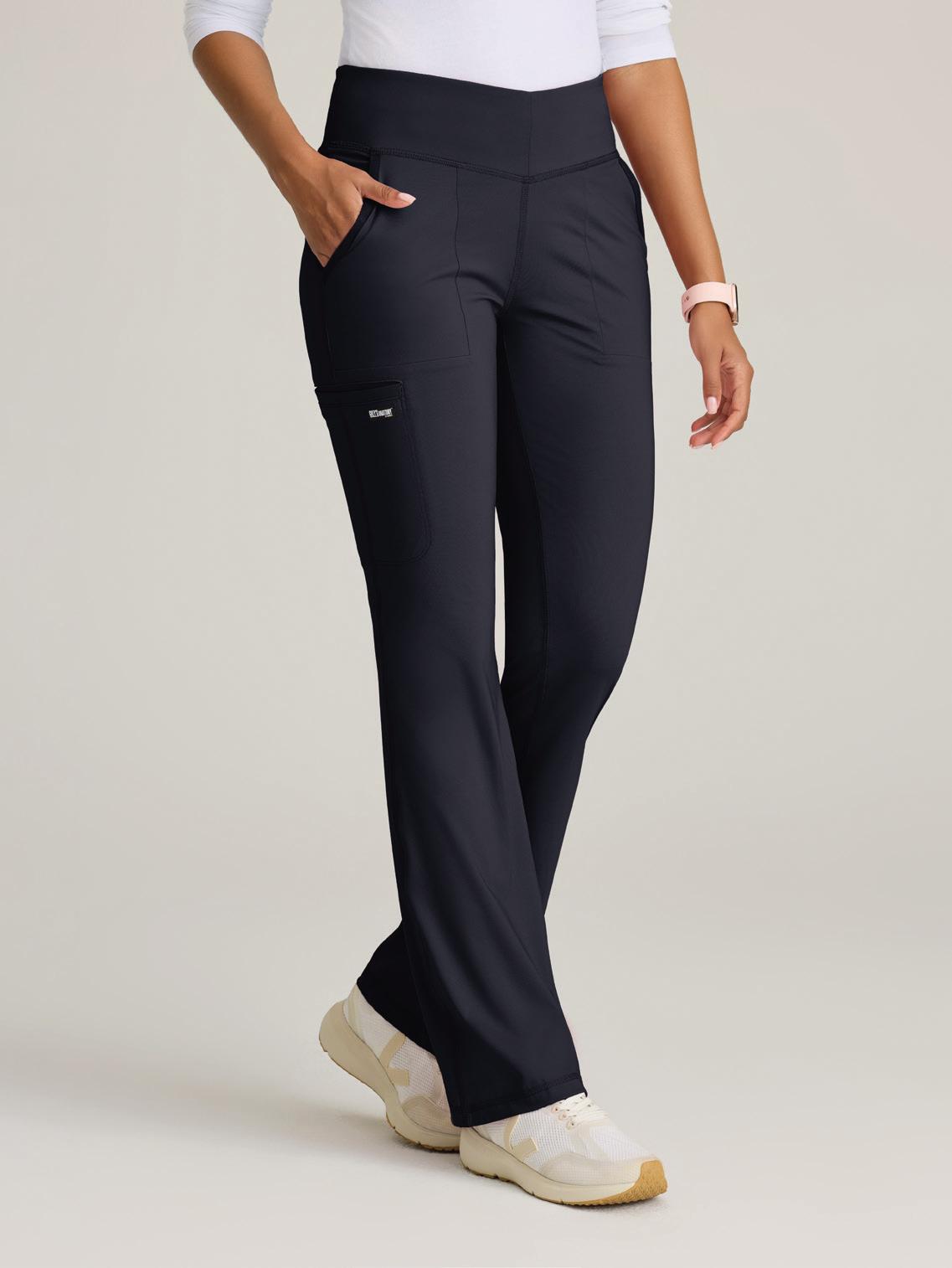 5-pocket high-rise, V-front waistband, fit & flare leg pant