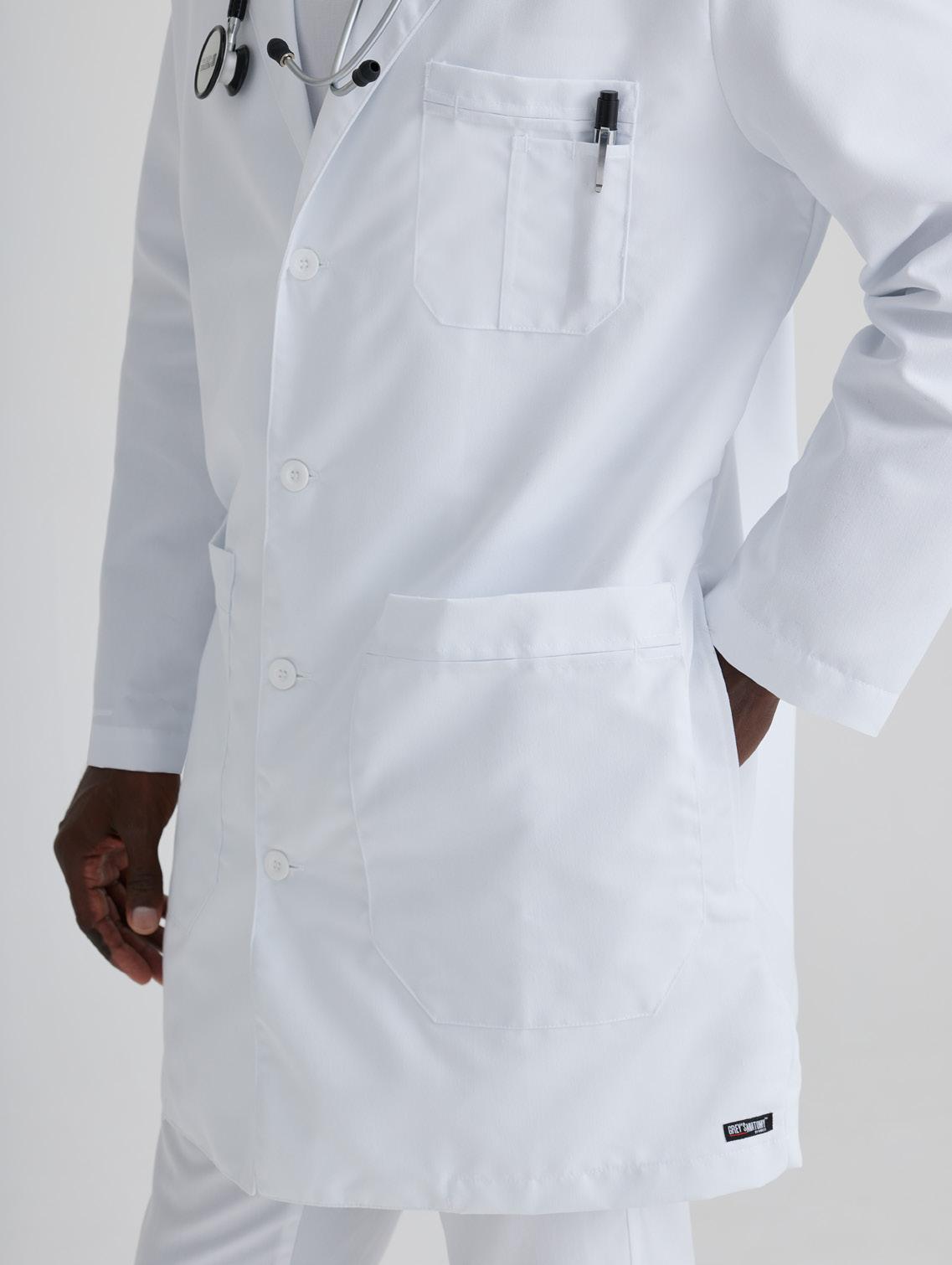 Men's 3-pocket long sleeve lab coat, notch lapel, welt chest pocket, tablet friendly top entry waist pockets with interior pen slots, center back vent, sleeve vents, side slits for pant access, and pocket label
