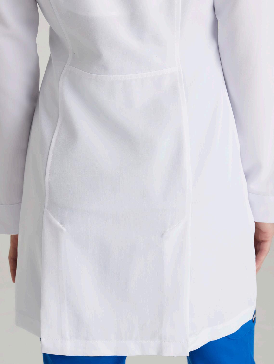 Women's round notch collar lab coat, with 2 front pockets, 1 chest pocket, pen slot, and back belt detail. SEMI-FITTED