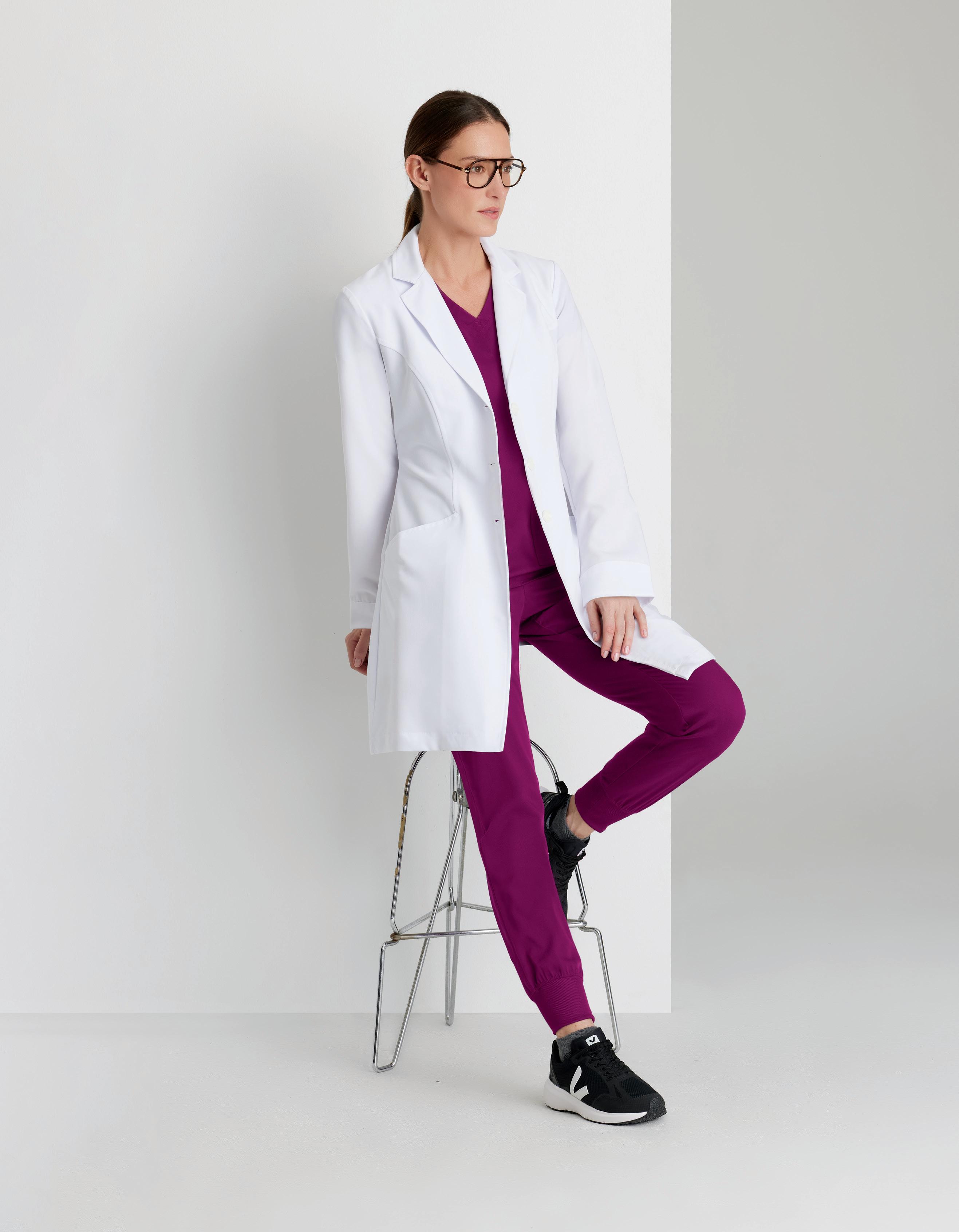 Women's lab coat with 2 front pockets, long sleeve, princess front and back with 2 back vents. SEMI-FITTED