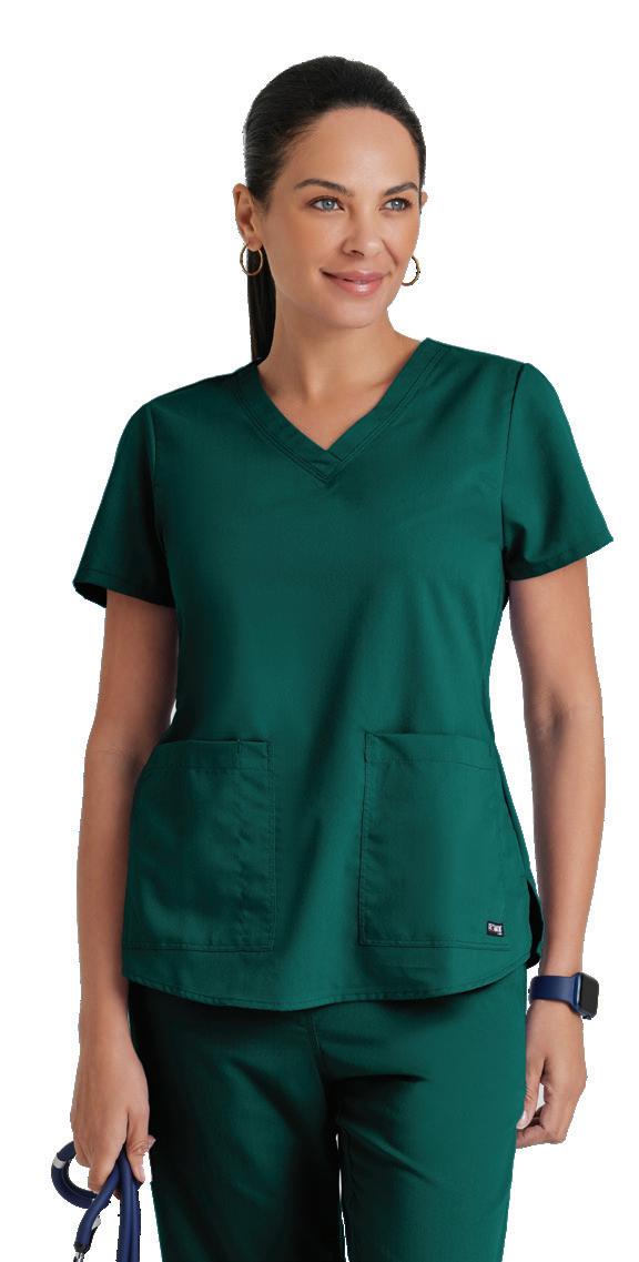 GRST045 Serena Top 3-pocket, ribbed V-neck, PDA pocket, logo tape side slit detail, rib knit back insets with princess seam, straight hem Sizes: XXS - 3XL, CB: 25.5"