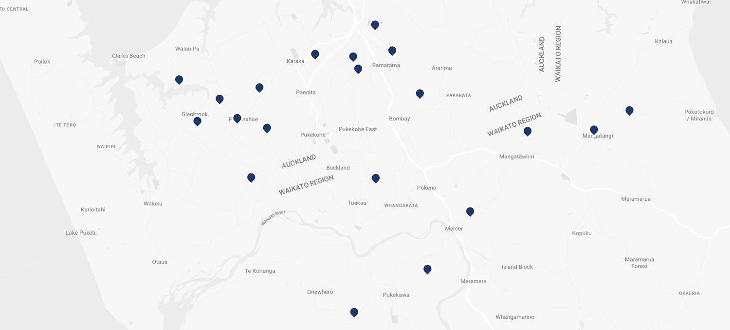 Bombay, Buckland, Drury, Glenbrook, Hunua, Kaiaua, Kingseat, Mangatangi, Mangatawhiri, Mauku, Mercer, Onewhero, Otaua, Paerata, Patumahoe, Pokeno, Port Waikato, Pukekawa, Pukekohe, Pukekohe East, Puni, Pukekohe, Ramarama, Runciman, Tuakau, Waiau Pa, Waiuku & Whakatiwai.