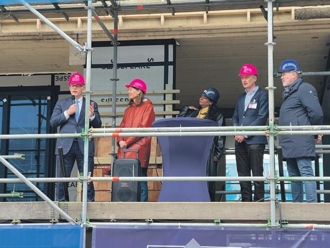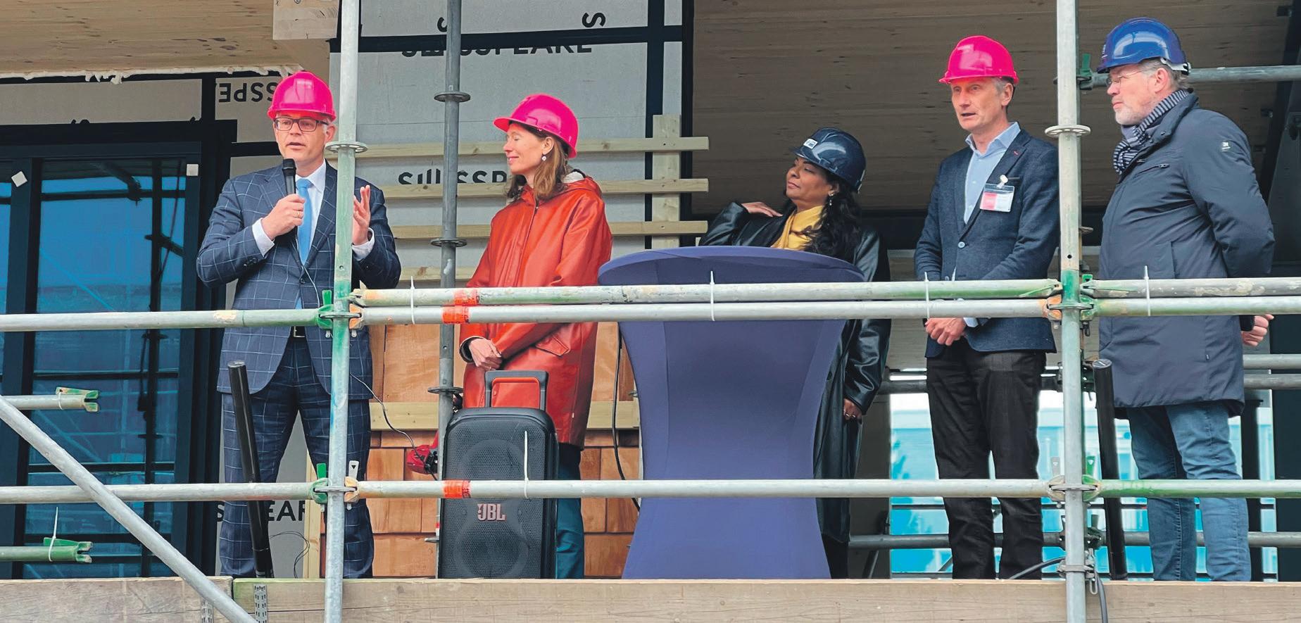 Wethouder Kees van der Duijn Schouten met naast hem van links naar rechts Anne Koning (gedeputeerde Provincie Zuid-Holland), de directeur van BIK bouw, Harro Zanting (directeur Wooncompas) en de directeur van Giesbers Bouw.