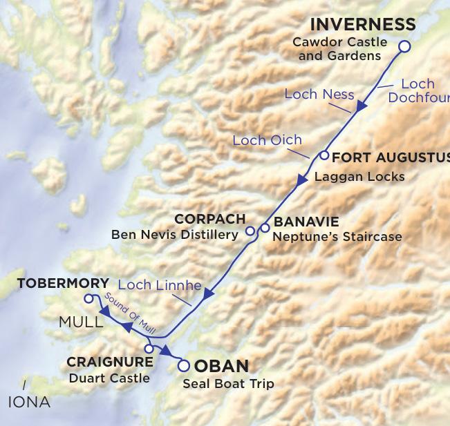 Wednesday Enjoy free time to explore Inverness, the Capital of the Highlands, before we sail along the historic Caledonian Canal, built between 1803 and 1822 to link the four lochs of the Great Glen. En route, we visit the enchanting Cawdor Castle & Gardens. The day ends with our ascent through the impressive locks at Fort Augustus.