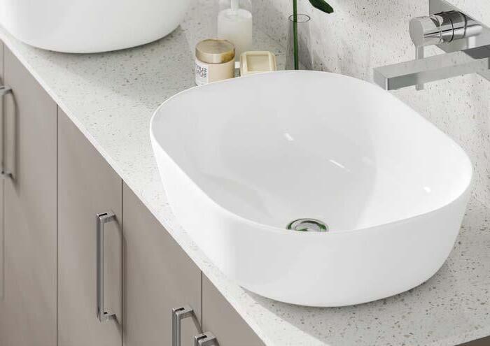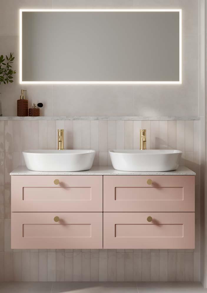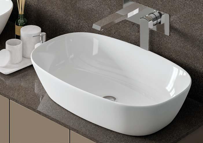 Three of our popular colours are now available as basins - Matt Antique Rose, Matt Parisian Blue & Stone Matt. The distinctive curves of the basin contrast stylishly with the inset, geometric lines of the white units.