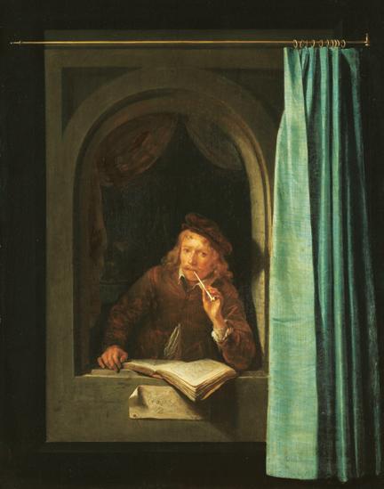 ← En Autorretrato con pipa y libro (c. 1650), el flamenco Gerrit Dou (1613-1675) recrea el célebre trampantojo de la cortina de Parrasio.