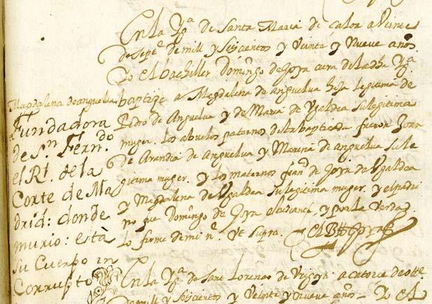 Empezamos con la monja mercedaria Magdalena Anguelua Ugalde. Tal y como vemos en la imagen fue bautizada en la parroquia de Santa María de Zaloa el 20 de septiembre de 1629. Monja mercedaria, vivió durante más de 30 años en el convento de Ibarra, en Orozko. En 1676, fue designada por el general de la orden de la Merced para participar en la fundación del convento de San Fernando de Madrid, donde vivió hasta su muerte en 1706 y donde, tal y como consta en la nota marginal, está su cuerpo incorrupto.