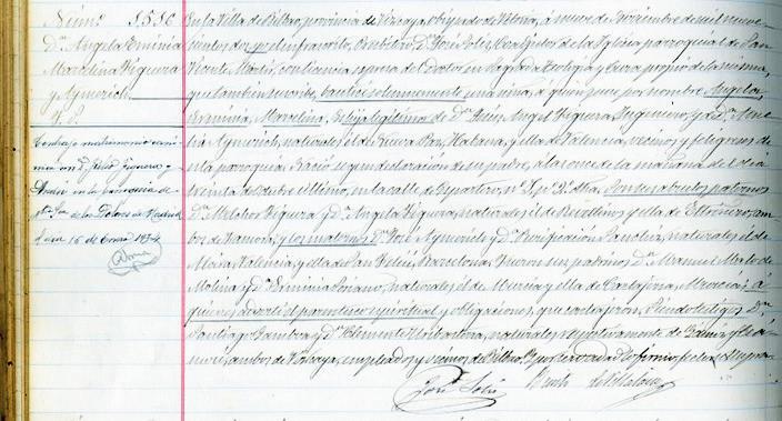 PARTIDA DE BAUTISMO DE ANGELA ERMINIA MARCELINA FIGUERA, PROCEDENTE DE SAN VICENTE MÁRTIR, DE ABANDO, BILBAO