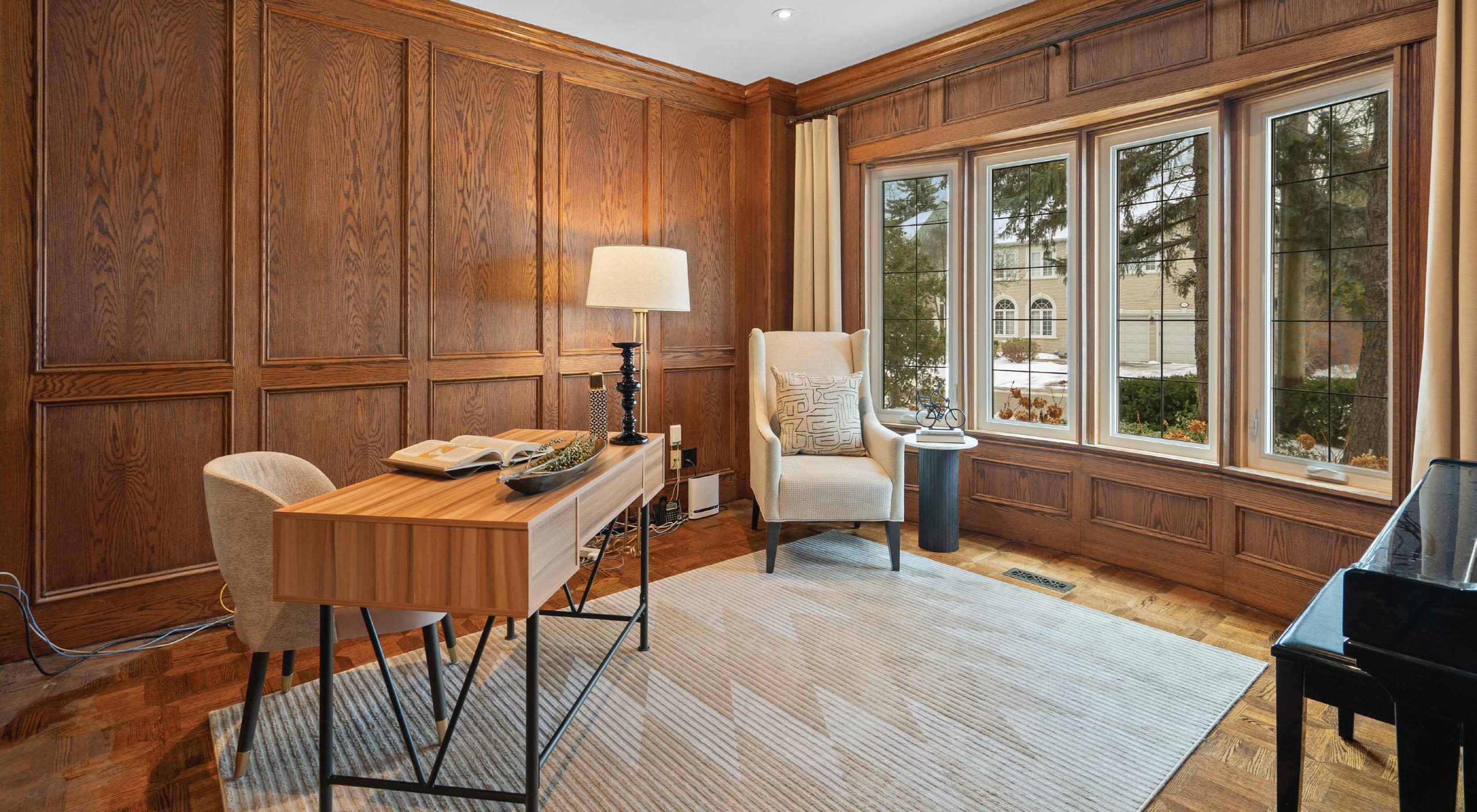 Positioned off of the entrance hall beyond French doors, the distinguished office overlooks the front gardens through custom bow windows with luxurious drapery. It features custom wood wall paneling throughout, wood floors, a built-in floor-to-ceiling bookcase and pot lights.