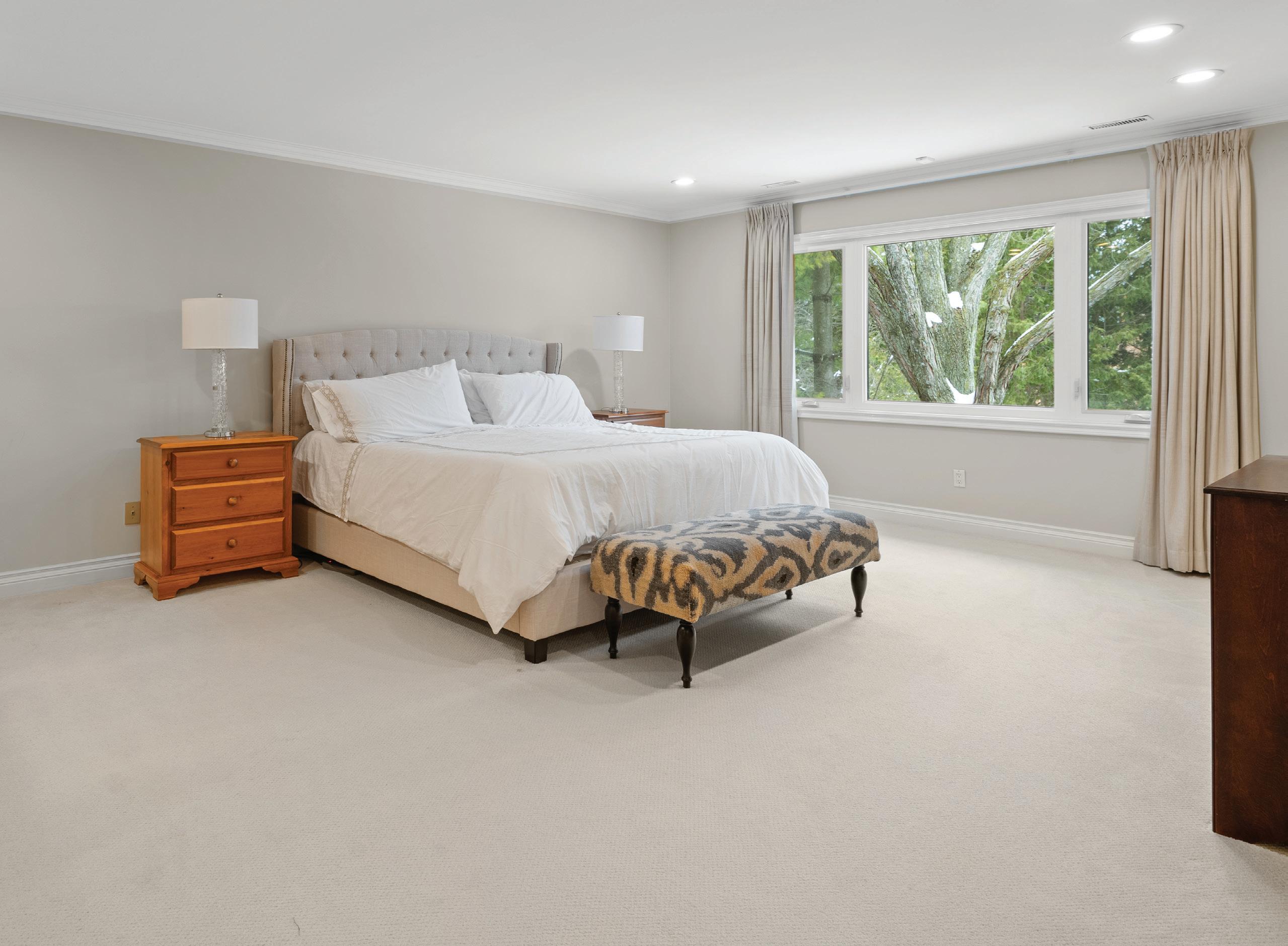 With north and south facing windows overlooking the forested front yard and secluded rear gardens, the third bedroom enjoys ample natural sunlight throughout the day. It features bow windows with a built-in bench seat, casement windows with blinds, broadloom floors, crown moulding, generous walk-in closet and four-piece ensuite.