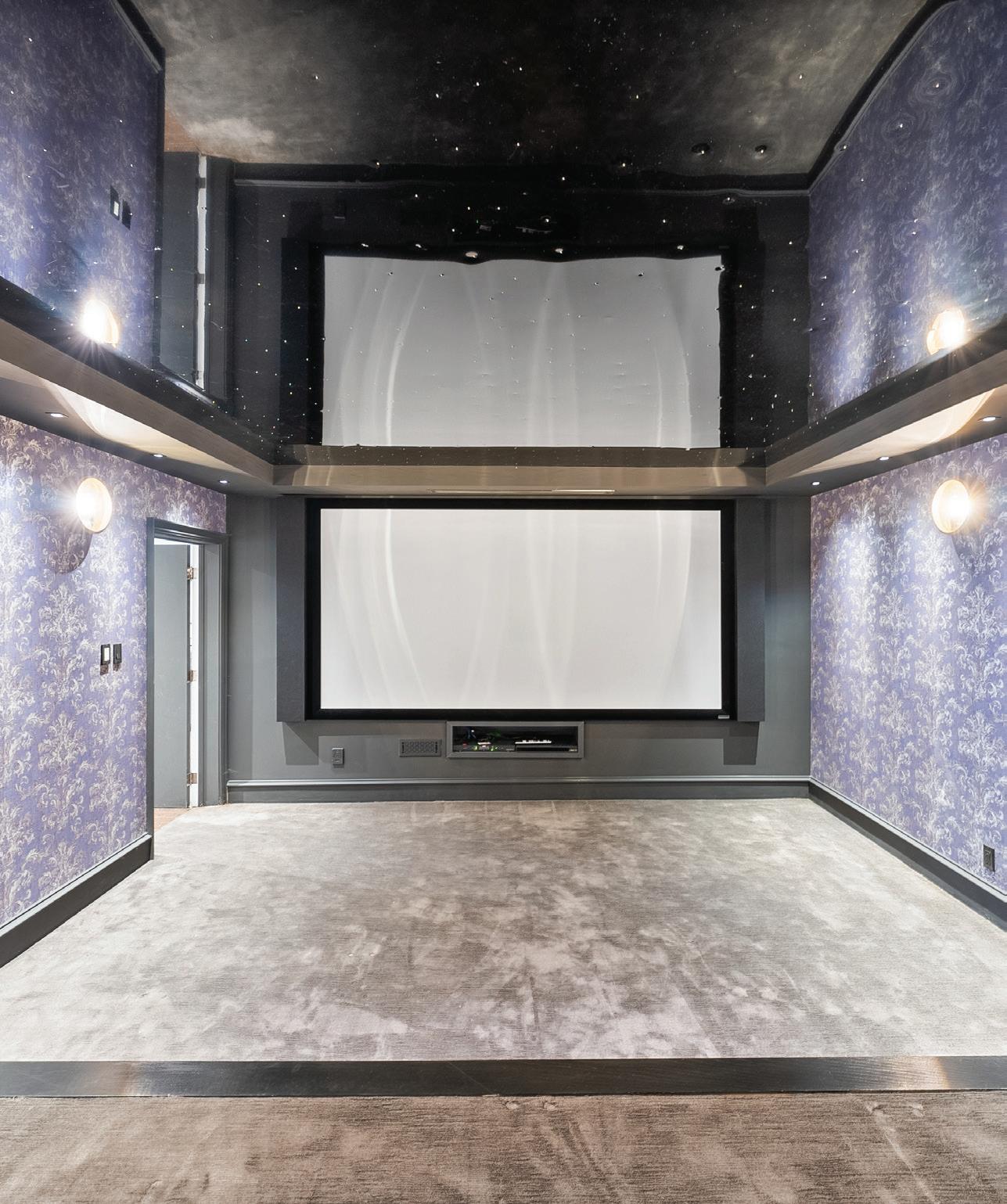 The fully walkout lower level is an entertainer’s paradise, featuring a modern kitchenette/bar with bar seating, dramatic black stone counters, and stylish pendant lighting—all open to the sprawling recreation room. A large tiered home theatre, playroom, gym with sauna, and a guest/nanny room complete this impressive level. Additional features include an oversized double-car garage, a massive mudroom with built-ins.