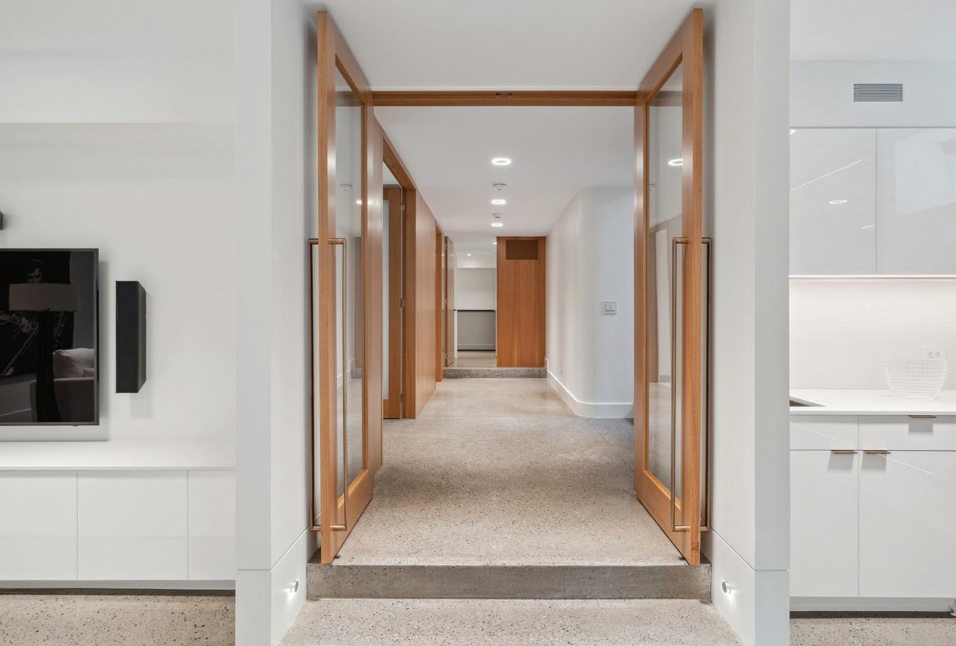 The ground floor has a formal entry, study / home office with architectural glass entry door and partition, living room with 3-sided gas fireplace, dining room with bar area and Sub-Zero wine storage. The hall is lined with generous closets, and connects to the bright side door, open riser white oak stair to the upper floor, and a sensational powder room.