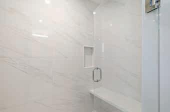 The 4-piece Primary Ensuite bath features large marble tile floors, crown moulding, wallpapered accent wall, large window with view of the side garden, wood vanity with glass bowl sink, vanity light fixture, marble tile shower with ledge, potlight and glass door entry.